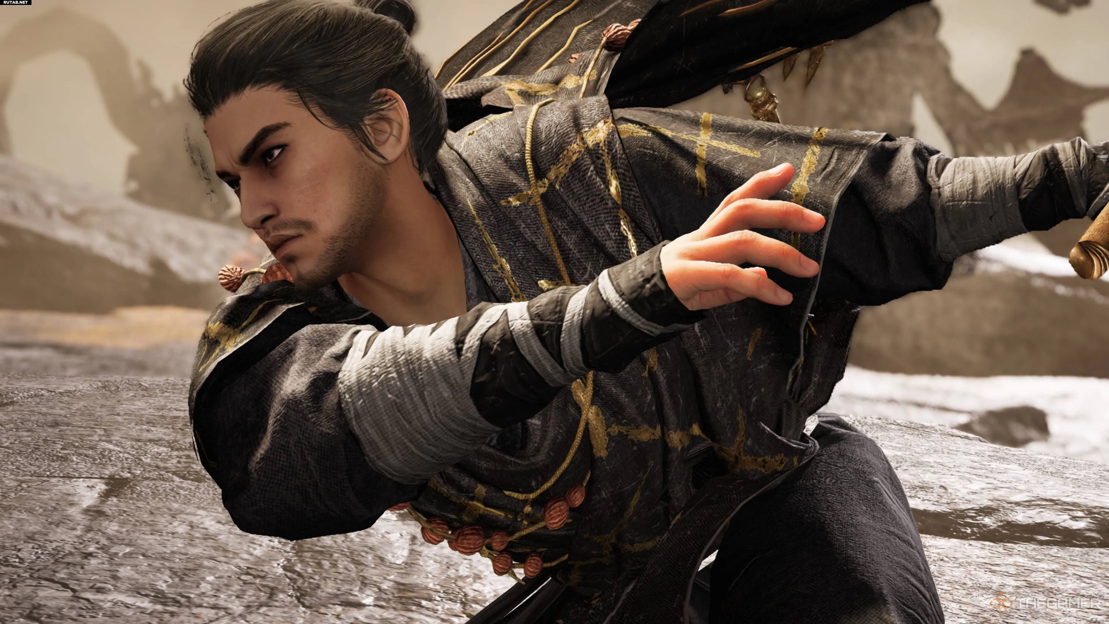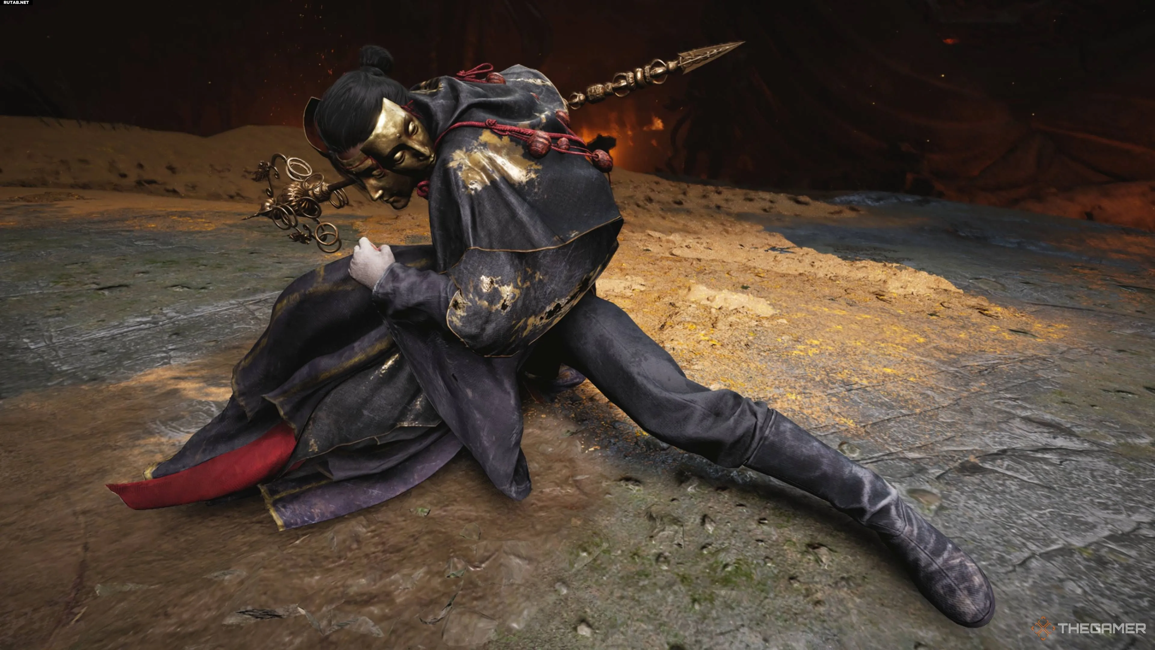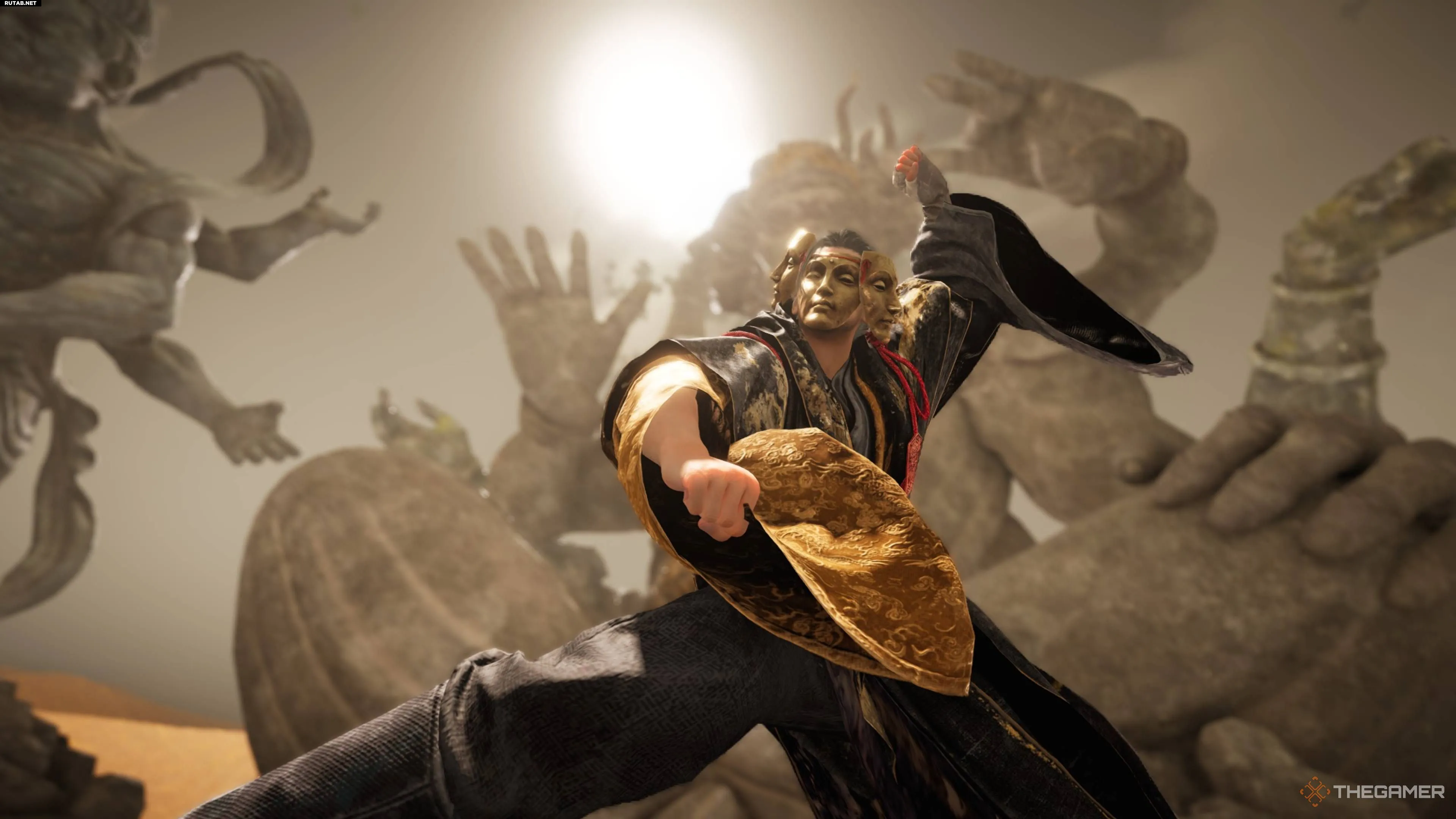 Он готовит мощный удар посохом по всей арене, но здесь есть особая механика. Непосредственно перед ударом на нём появится подсказка с кнопкой. Нажатие активирует «Прикосновение к меридианам», что опрокинет его и отменит атаку.