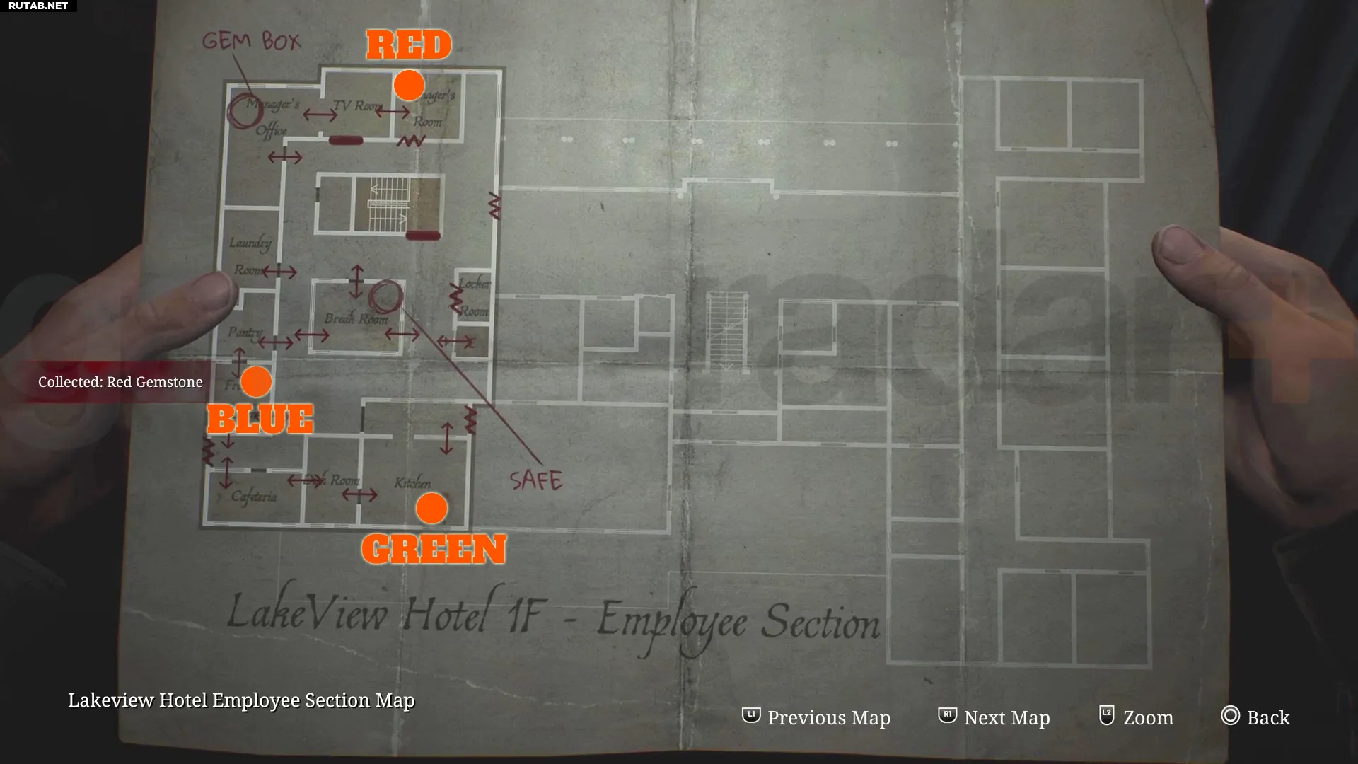 Три самоцвета разбросаны по подвалу отеля. Красный камень найти проще всего, а для поиска двух других придётся пройти через более опасную южную часть подвала.