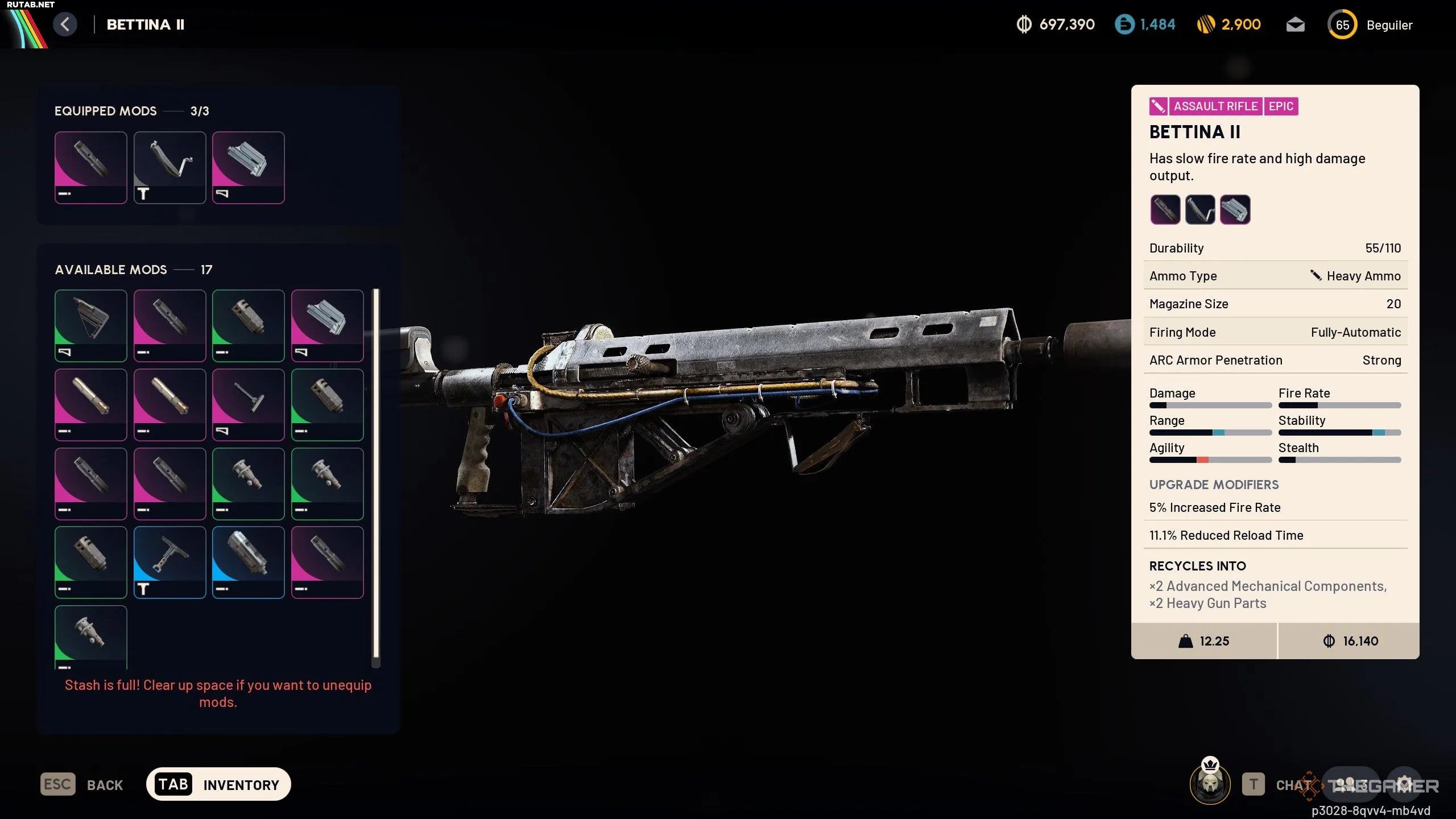 Bettina— это олицетворение понятия «нормально». Штурмовая винтовка, использующая тяжёлые патроны, может наносить значительный урон и хорошо контролируется, но в итоге существуют просто более удачные варианты. Это не значит, что Bettina плоха — вовсе нет, просто есть другое оружие, которое стоит взять в PvP в первую очередь. Кроме того, она требует значительного места в рюкзаке, так как тяжёлые патроны складываются стопками только по 40 штук.