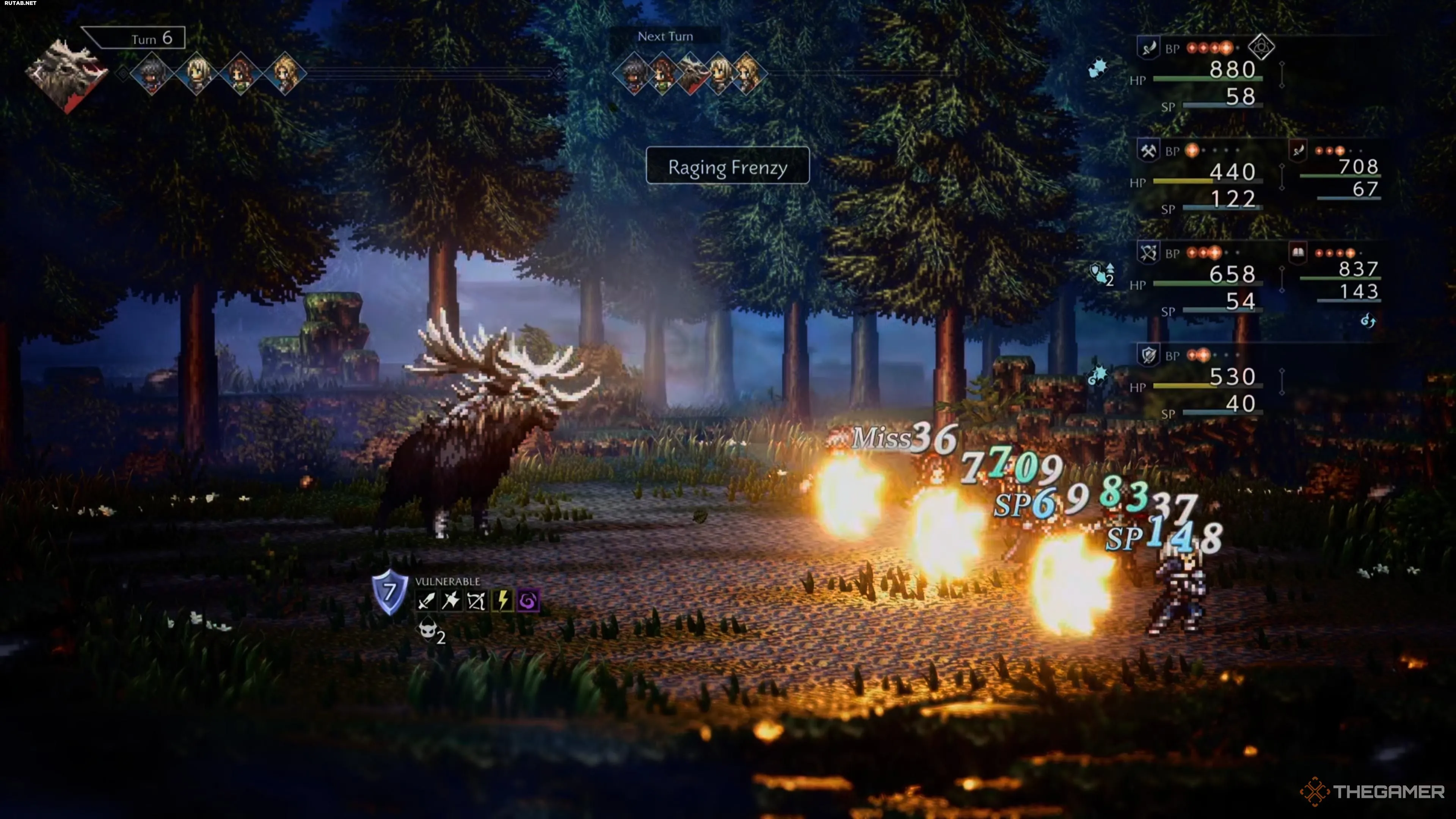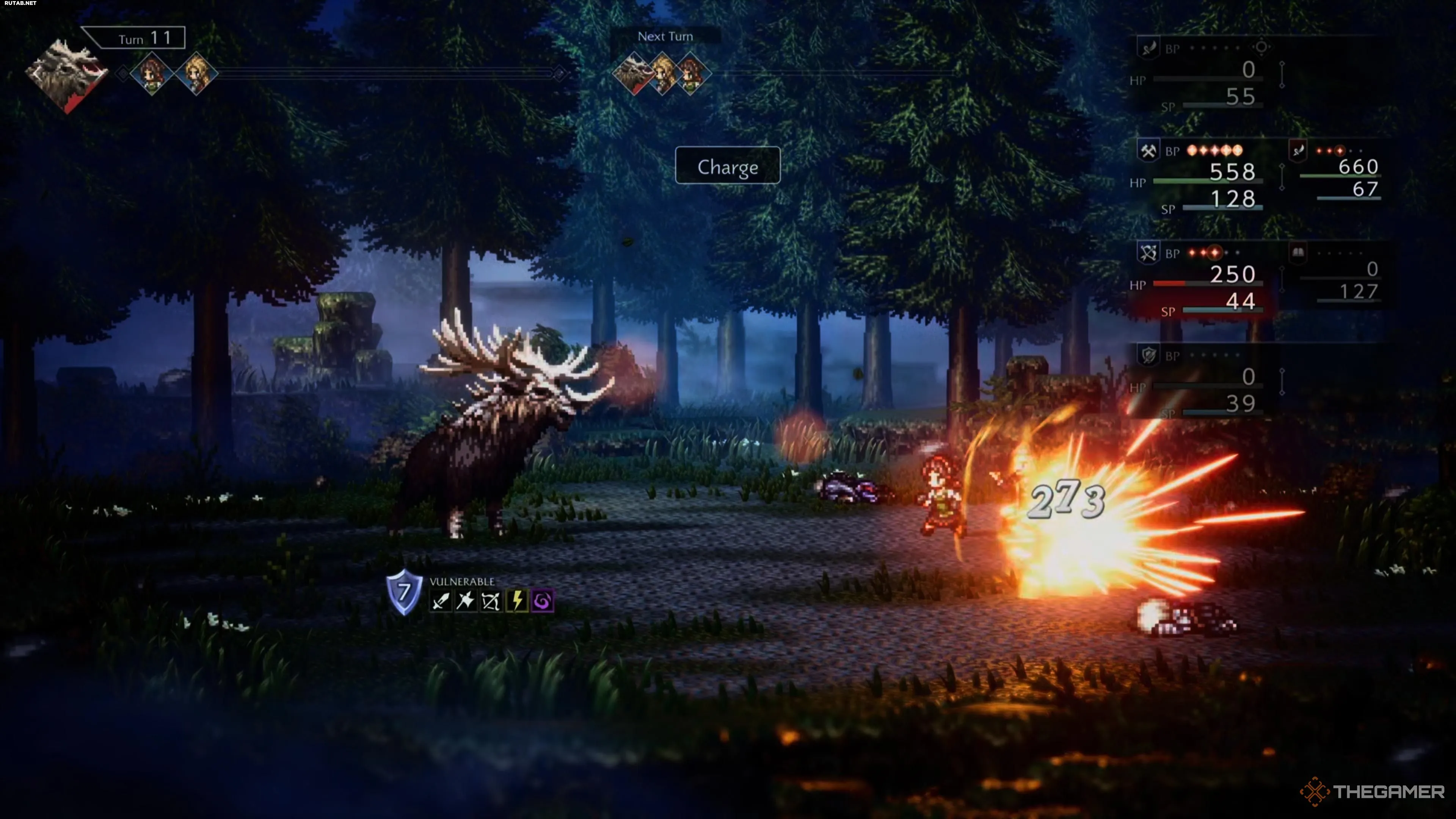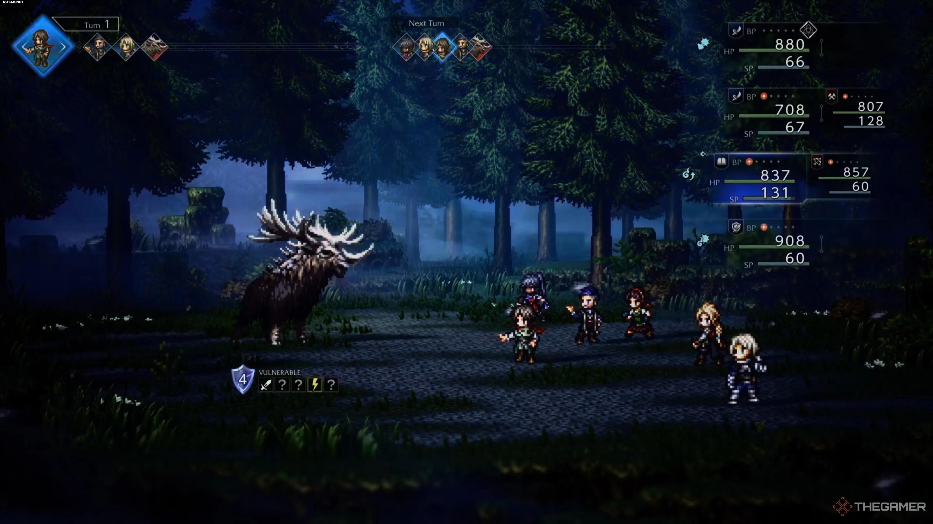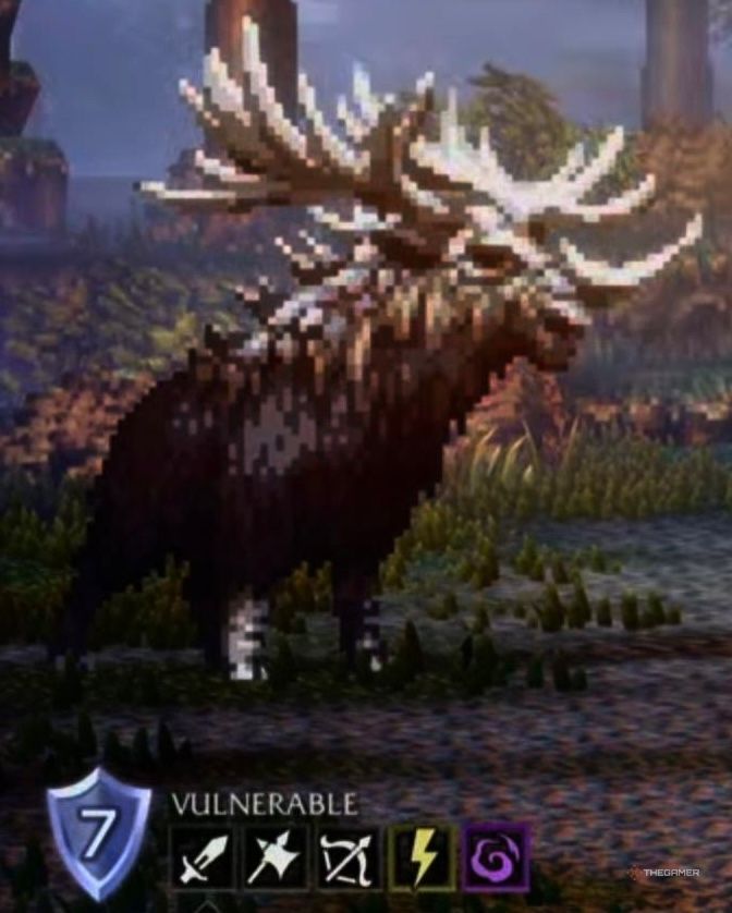Самый простой способ одолеть его — держать Стию во втором ряду. Это позволит ей лечить отряд, не получая урона, и копить BP для мощного применения «Первой помощи» или для многократного использования топора, чтобы помочь сломать щит оленя.