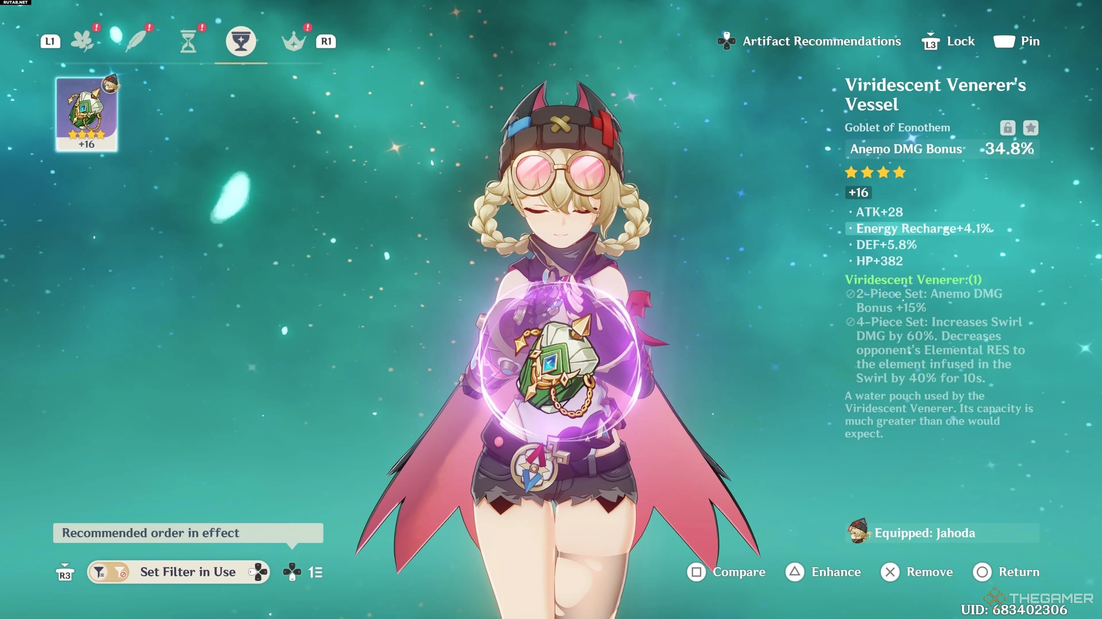 | Изумрудная тень | Даже если использовать только две части набора Изумрудная тень, Джахода получит бонус урона Анемо в 15%, что полезно для саб-дд. Полный набор не только помогает снизить сопротивление врагов к элементам, но и значительно увеличивает урон от реакции Рассеивание. |