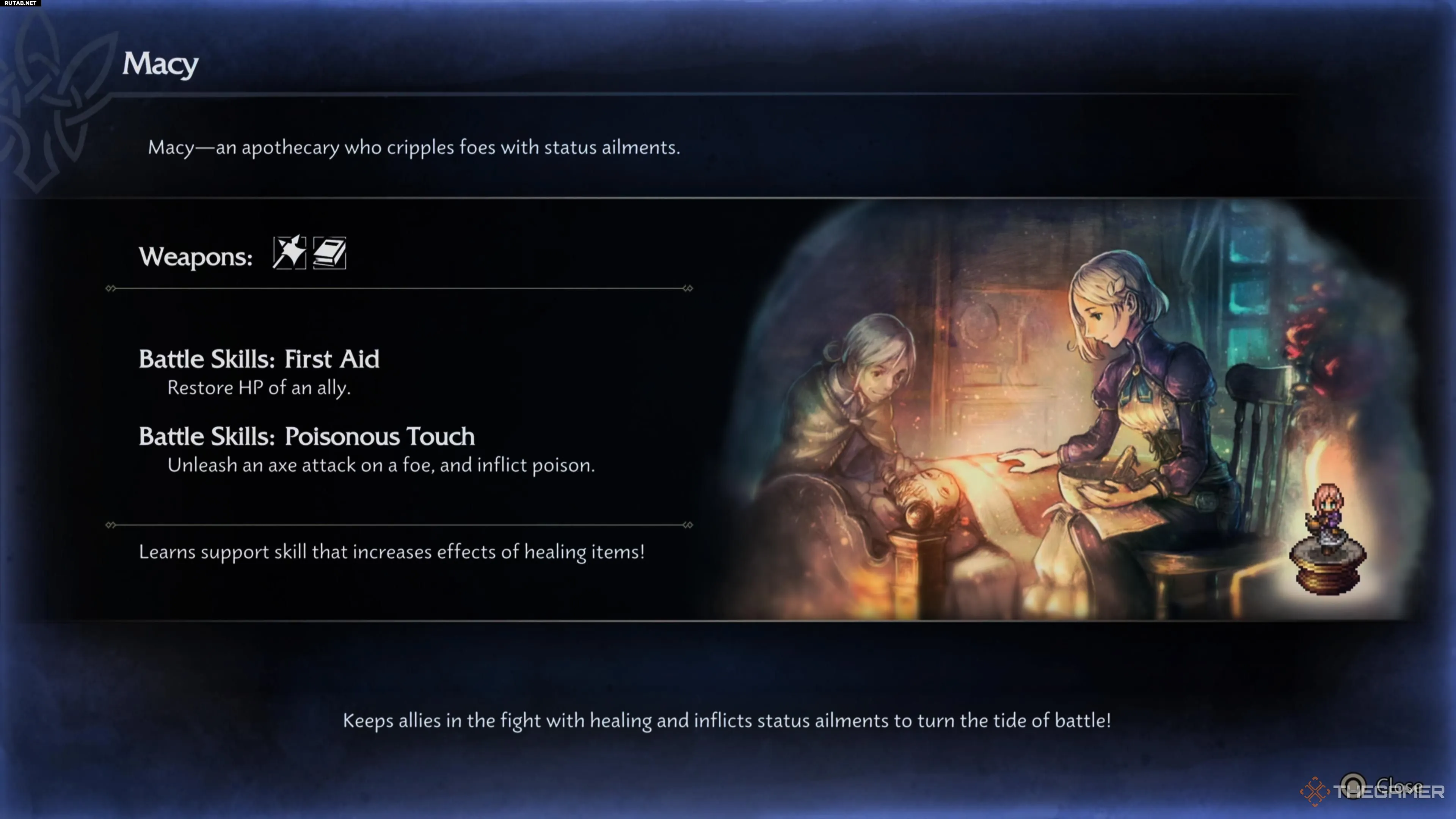 В отличие от Стии, у Мэйси есть навык «Экспертная первая помощь», который позволяет ей вылечить союзника и переместить его на заднюю линию, чтобы защитить от повторного удара.