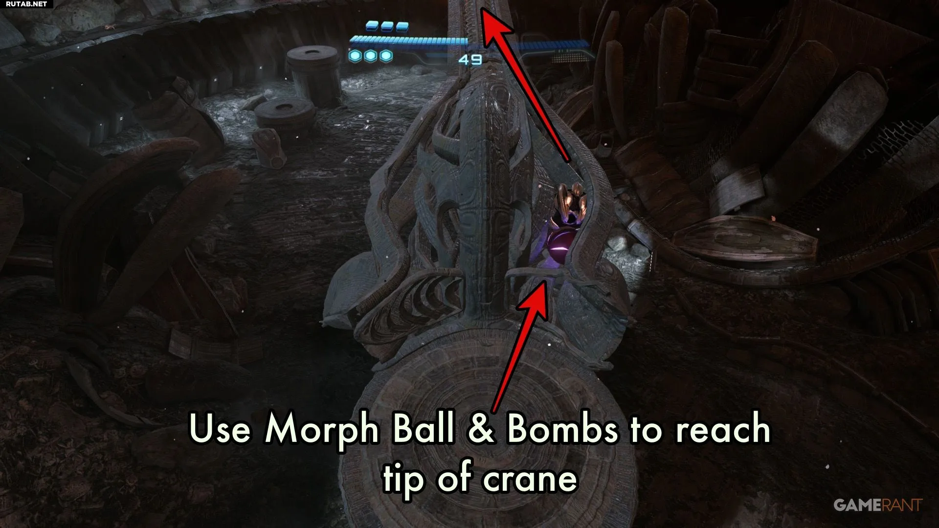 Используйте платформы, чтобы запрыгнуть на кран, а затем примените Морф-шар, чтобы добраться до его конца. Положите бомбу, и светящийся предмет упадёт на землю. Подберите Огненный чип, а затем покиньте Пылающий бассейн тем же путём, которым вошли.
