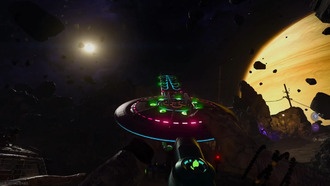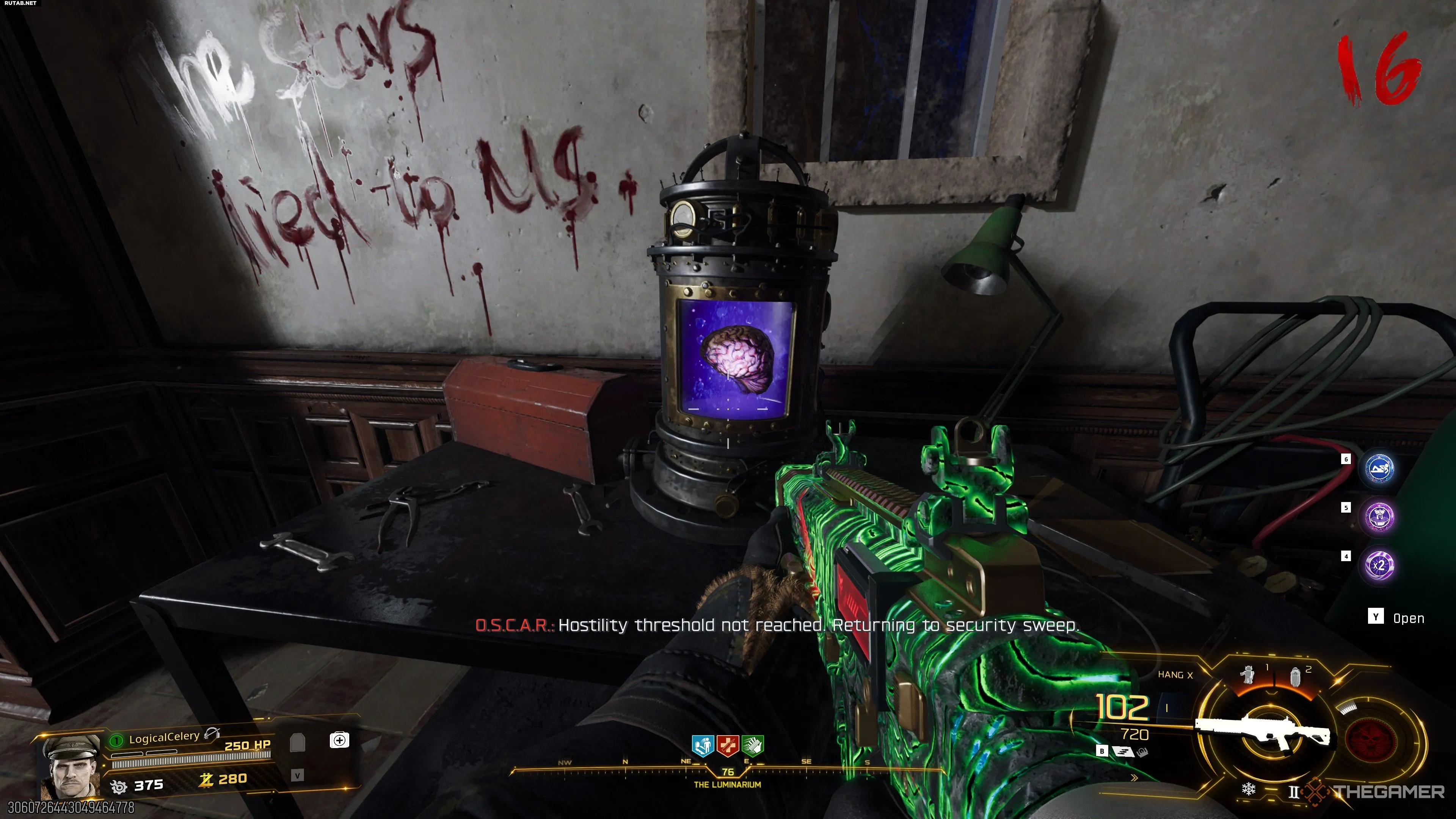 - Взаимодействуйте с мозгом, чтобы начать открытие портала. Во время этой блокировки О.С.К.А.Р. будет периодически стрелять по телепорту НЛО. Уничтожайте их, пока шкала не заполнится, и вас в итоге перенесёт на Марс.