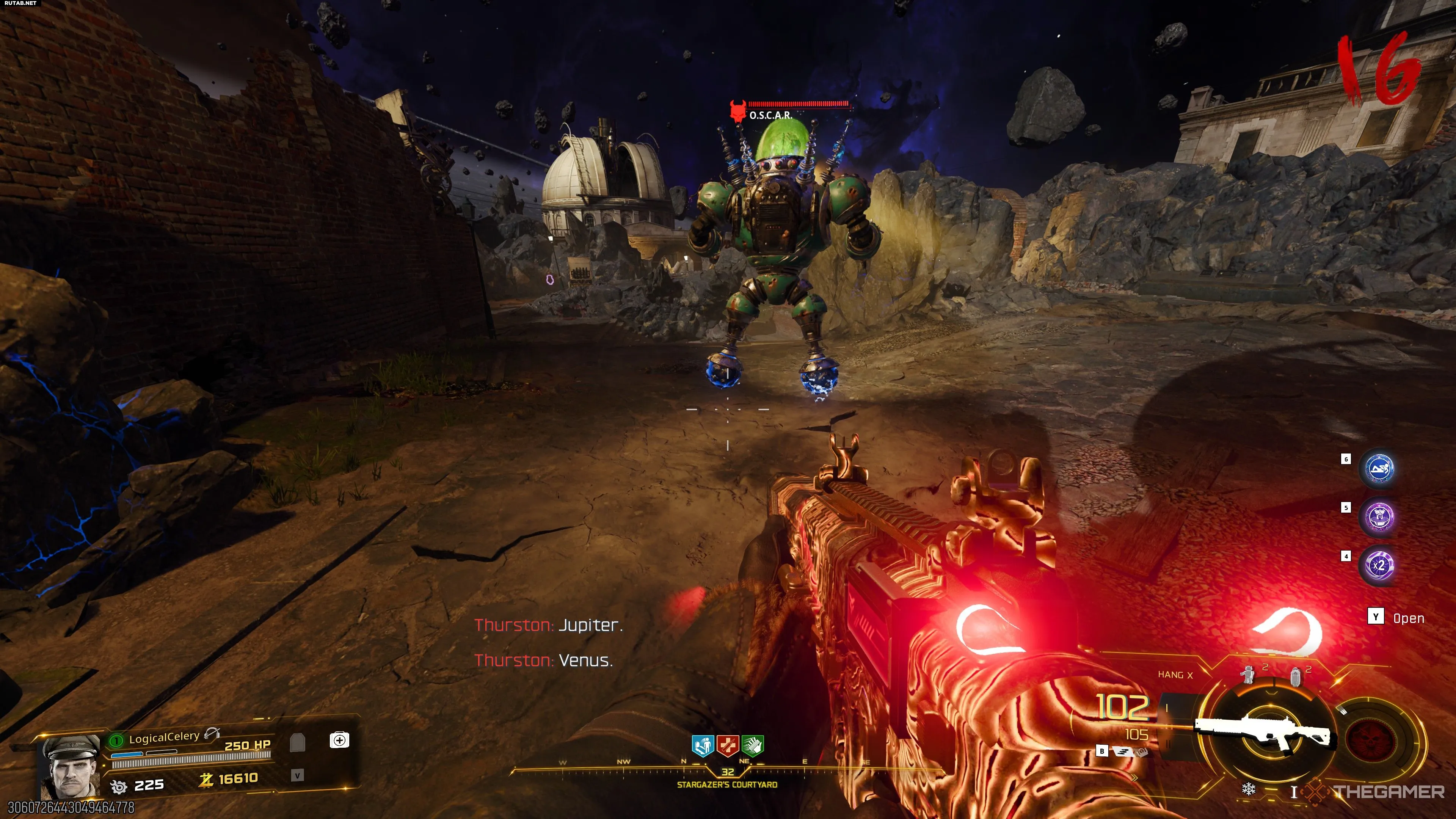 Когда О.С.К.А.Р. возродится, следуйте за ним незамеченным, и он проиграет несколько записей выживших. В конце концов вы услышите, как Терстон произносит три названия планет в случайном порядке.