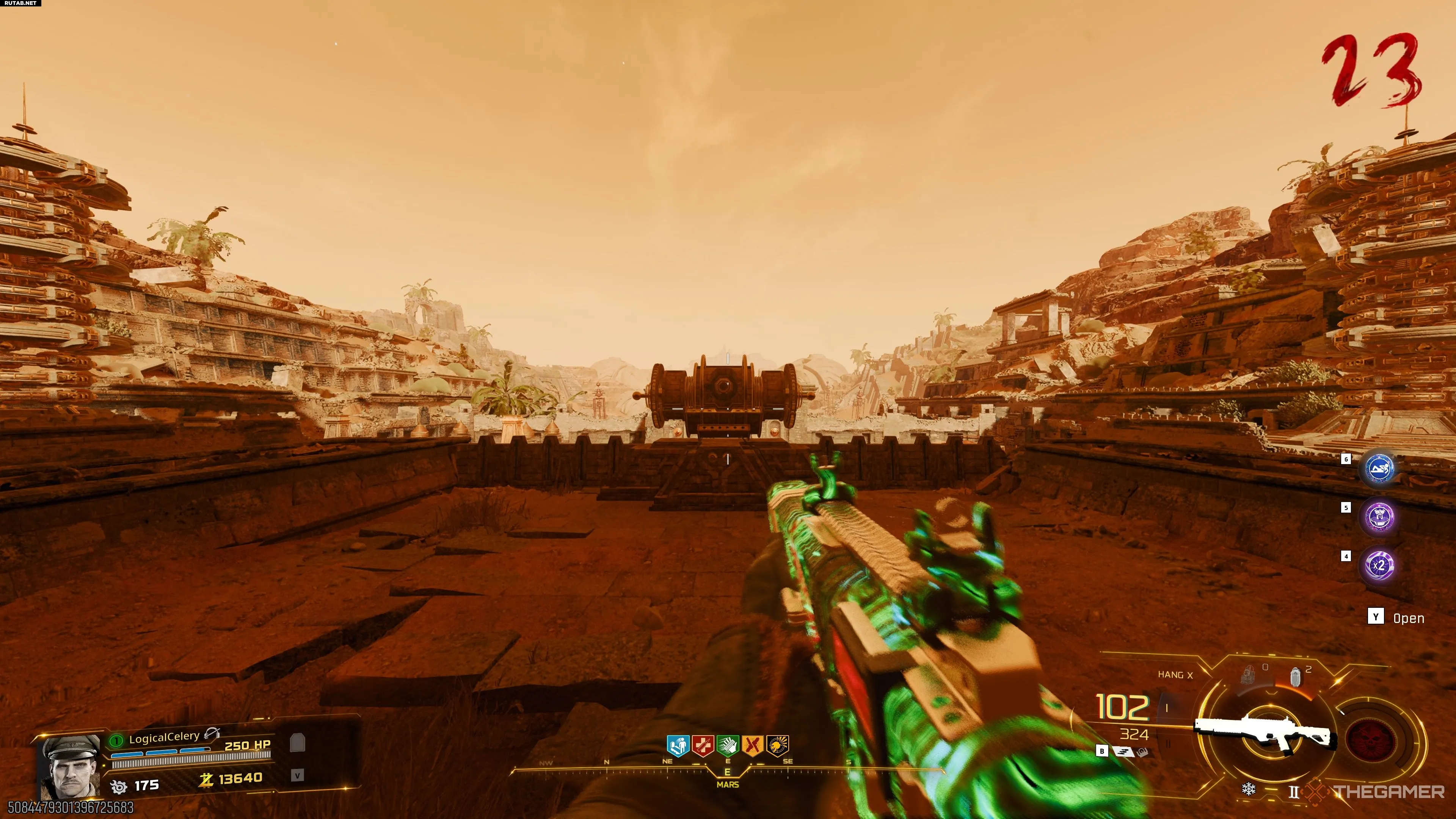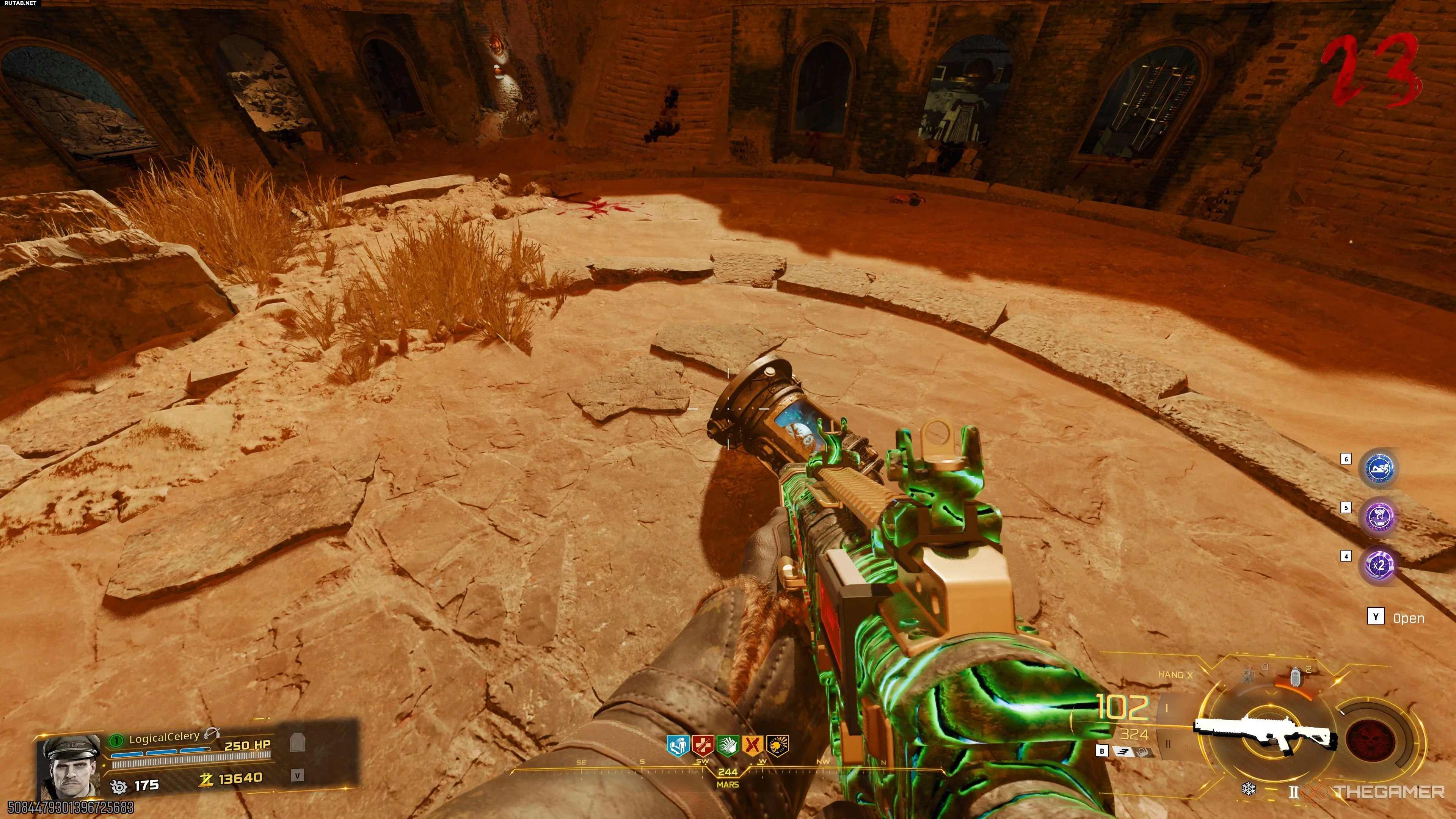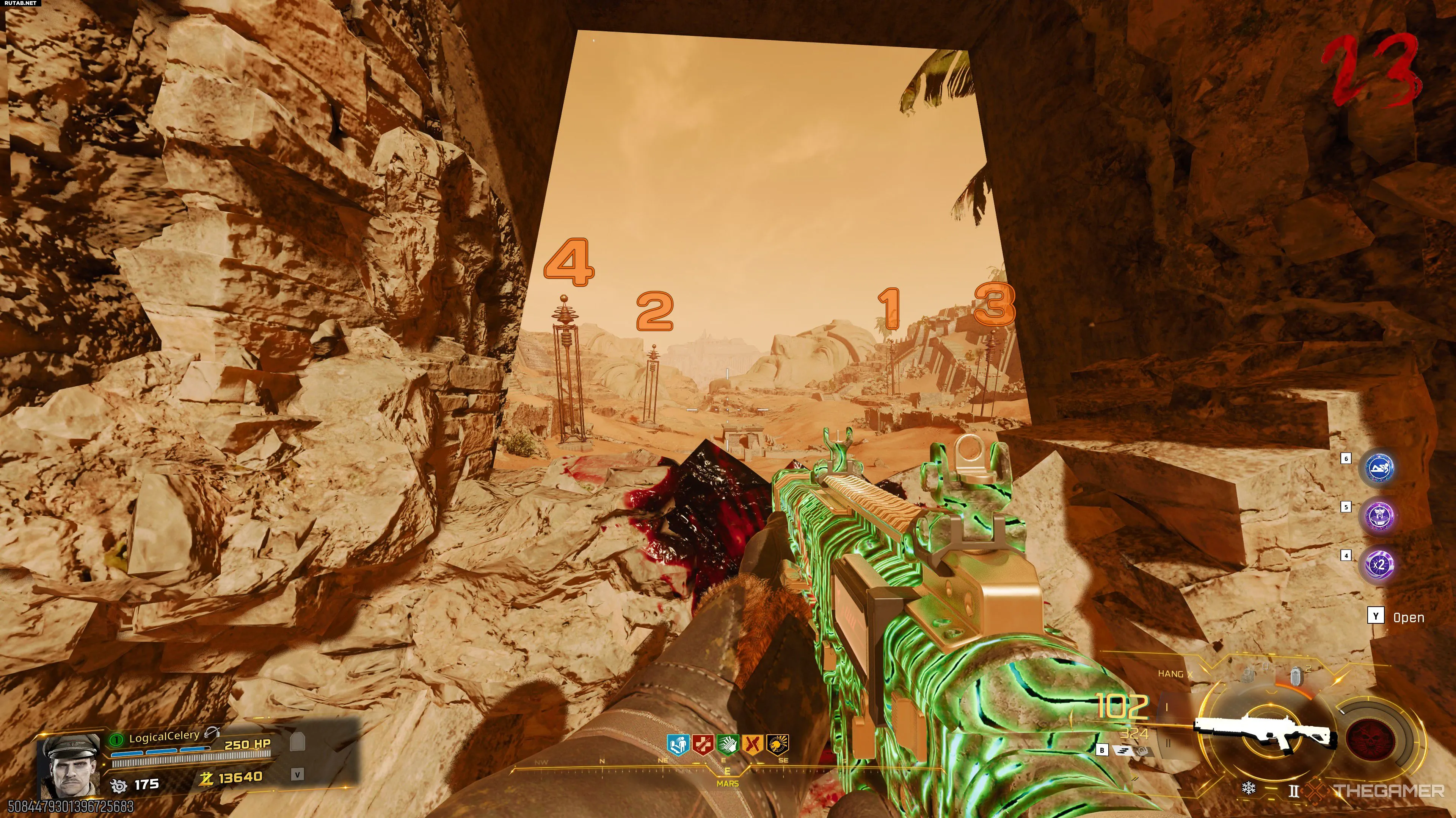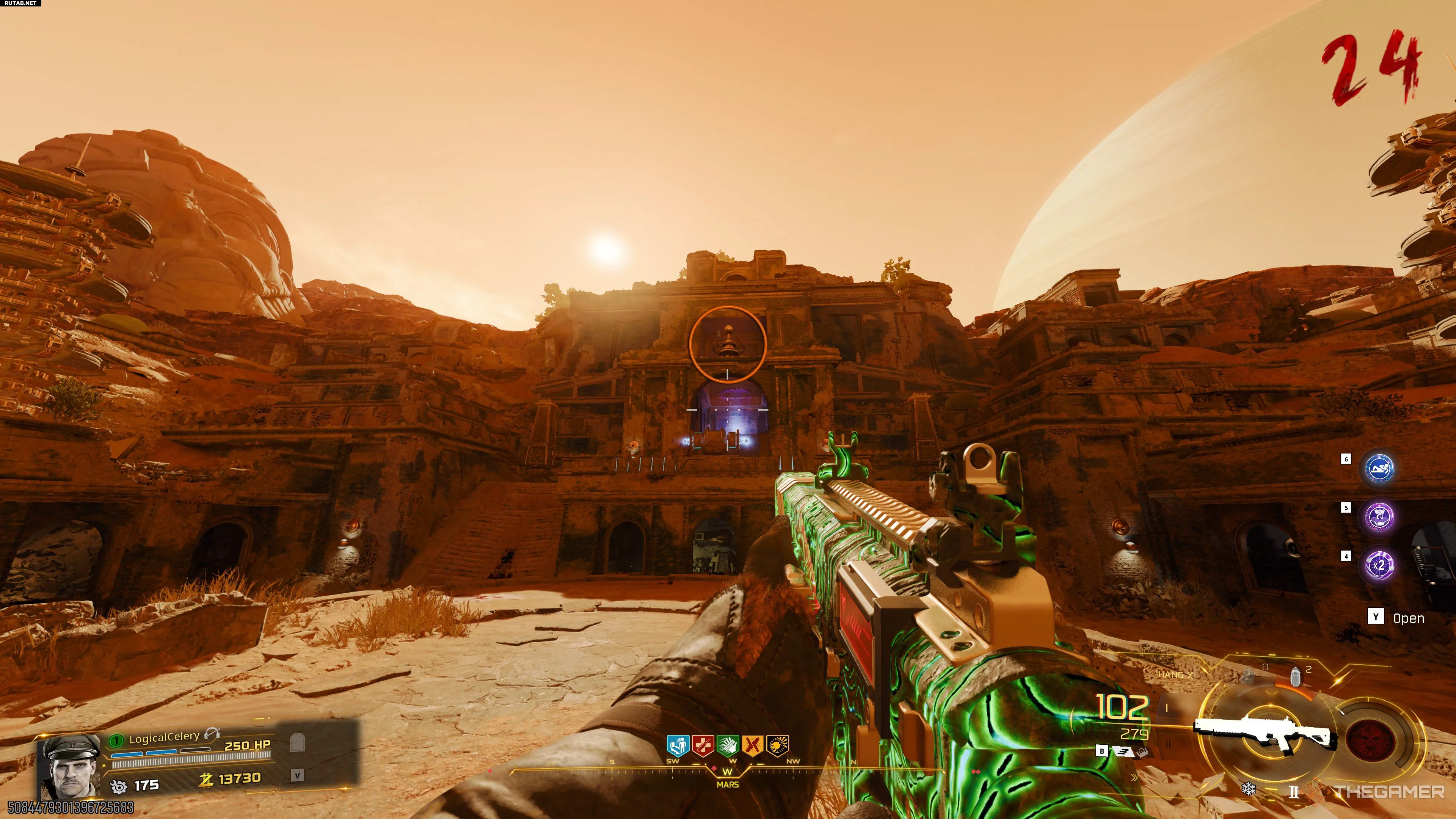 После восстановления портала раздастся громкий звук, и за пределами игровой зоны появится скарабей. Подбегите к задней части марсианского храма и посмотрите в окно, через которое появляются зомби. Вы увидите четыре пилона. Стреляйте в них в порядке от самого дальнего к самому ближнему.