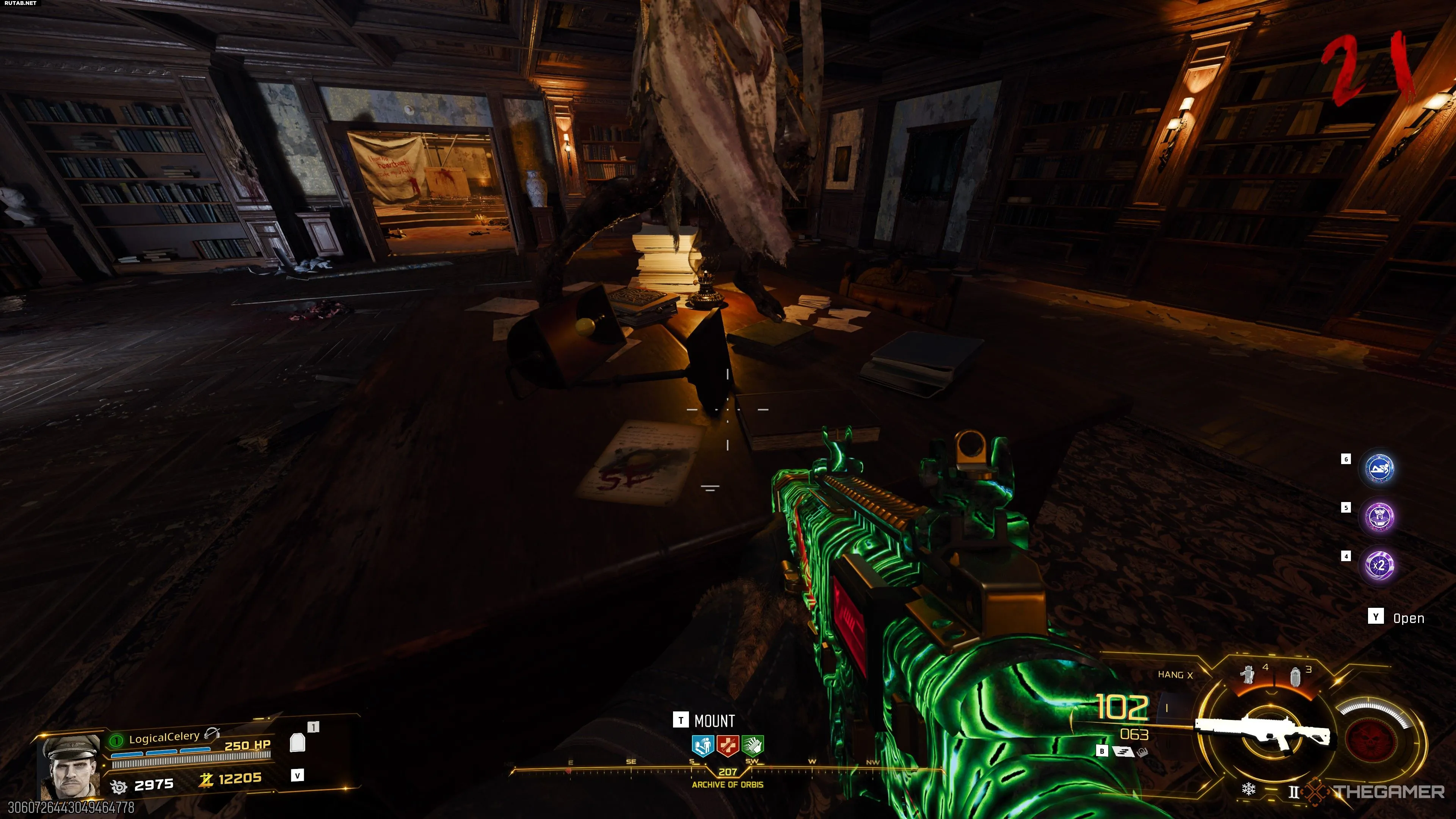 - В библиотеке стоят три статуи-головы. Рядом с ними находятся книжные полки, с которыми можно взаимодействовать, чтобы просмотреть разные романы. Количество романов на каждой полке, совпадающих со списком Терстона, равно числу поворотов головы ближайшей статуи. Это можно сделать только в начале нового раунда.