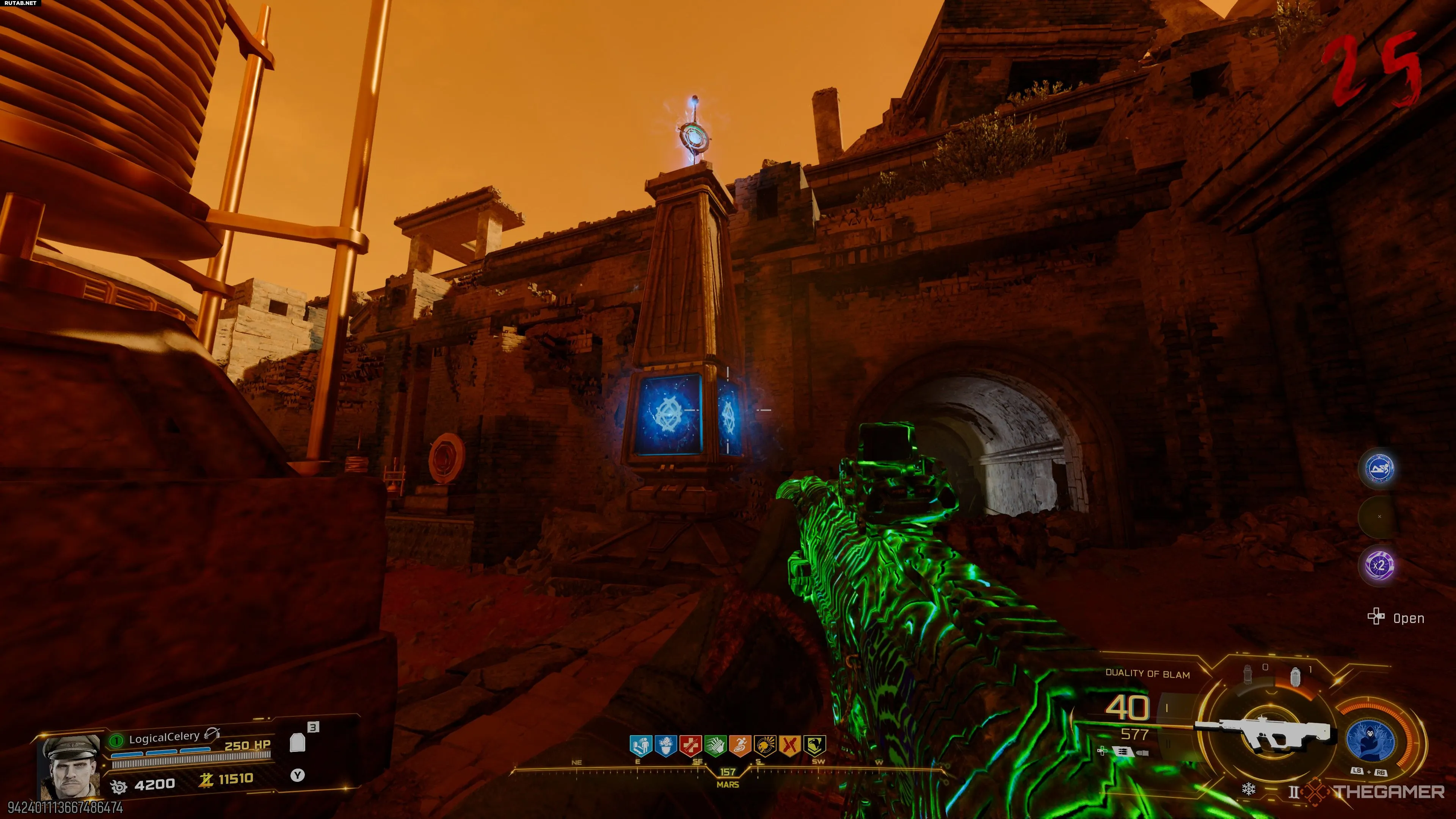 - В марсианском храме есть пять колонн с выгравированными на боках символами. Выстрелите в антенну на вершине каждой из них из LGM-1, чтобы активировать их.