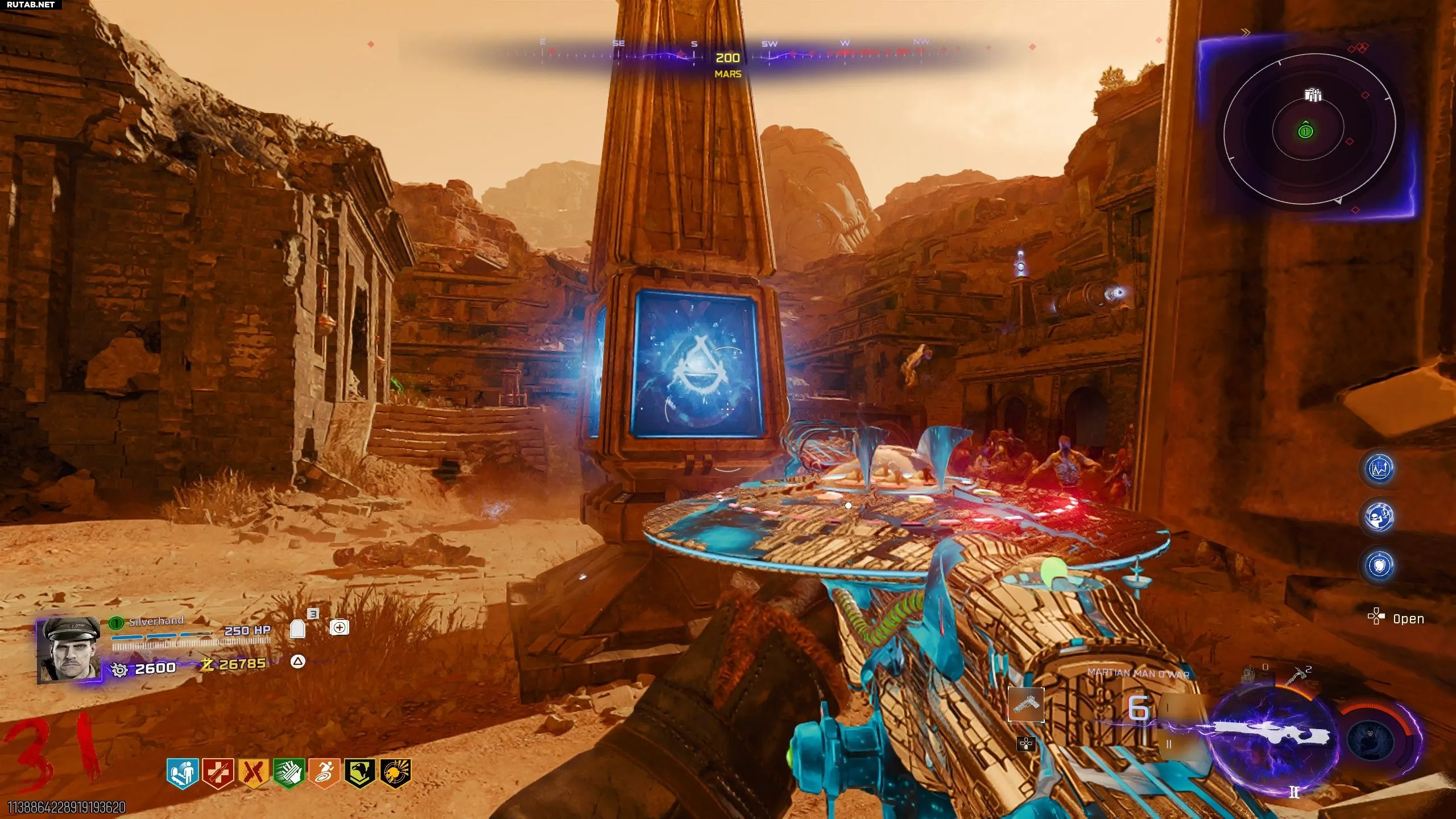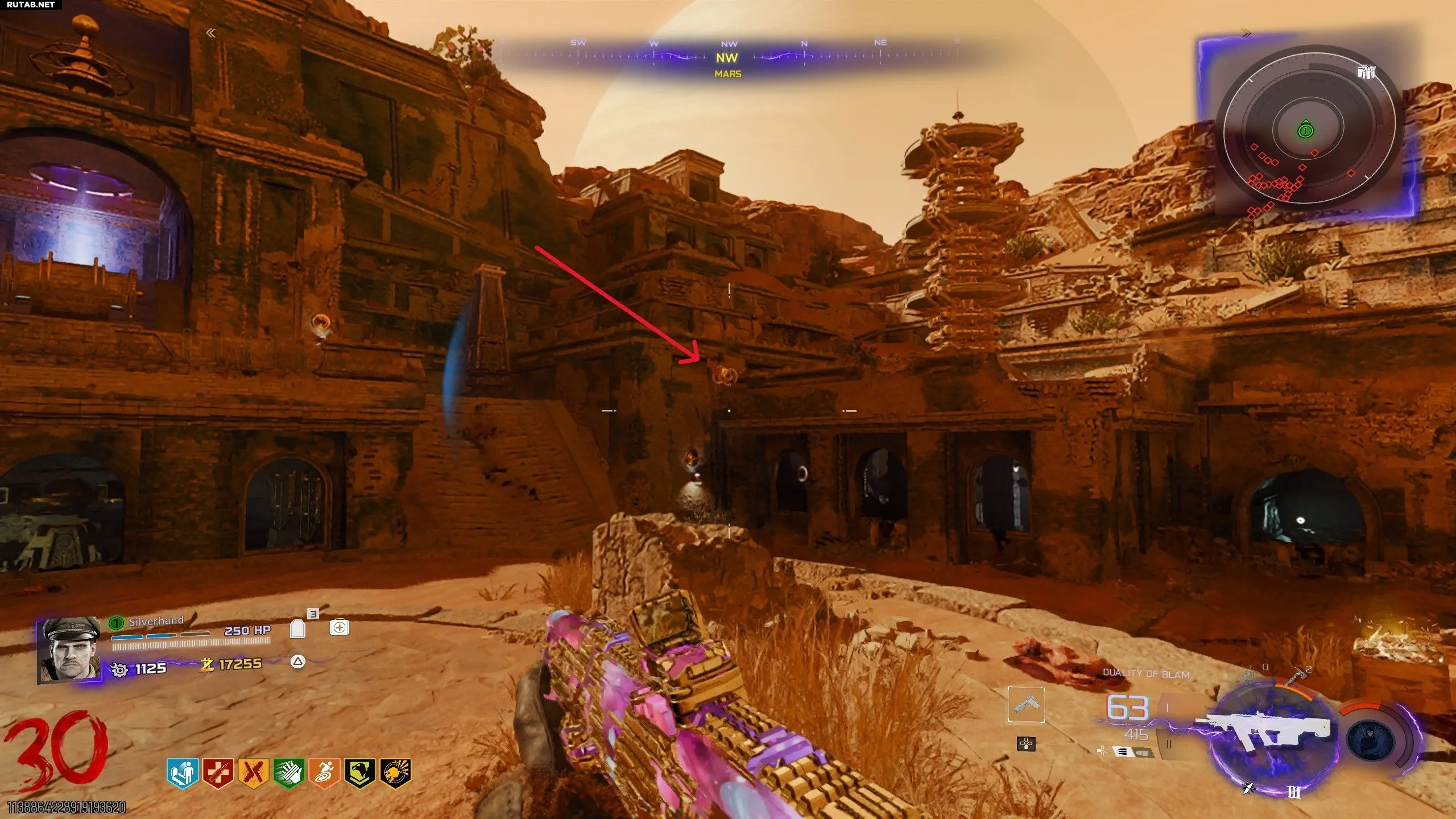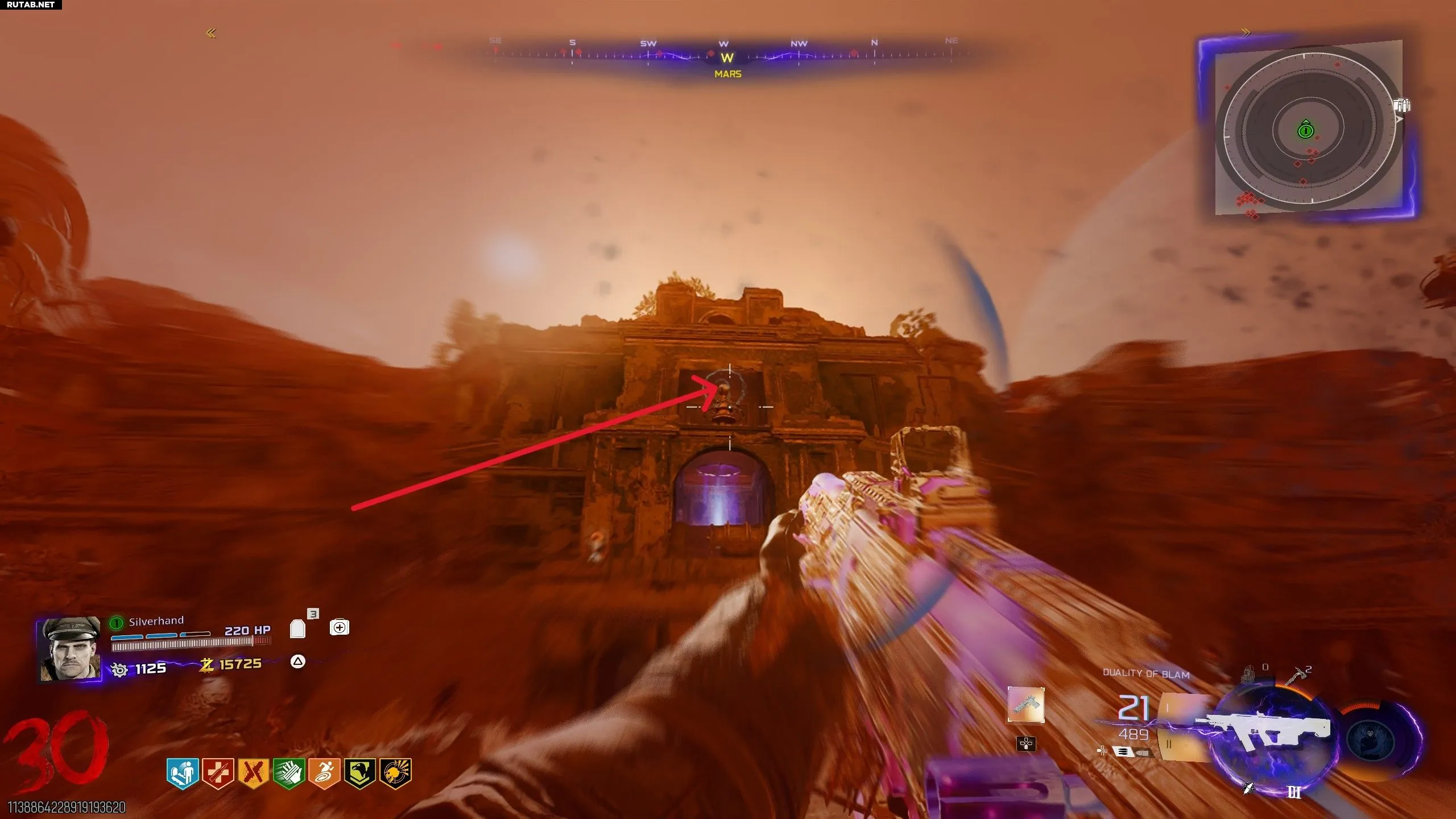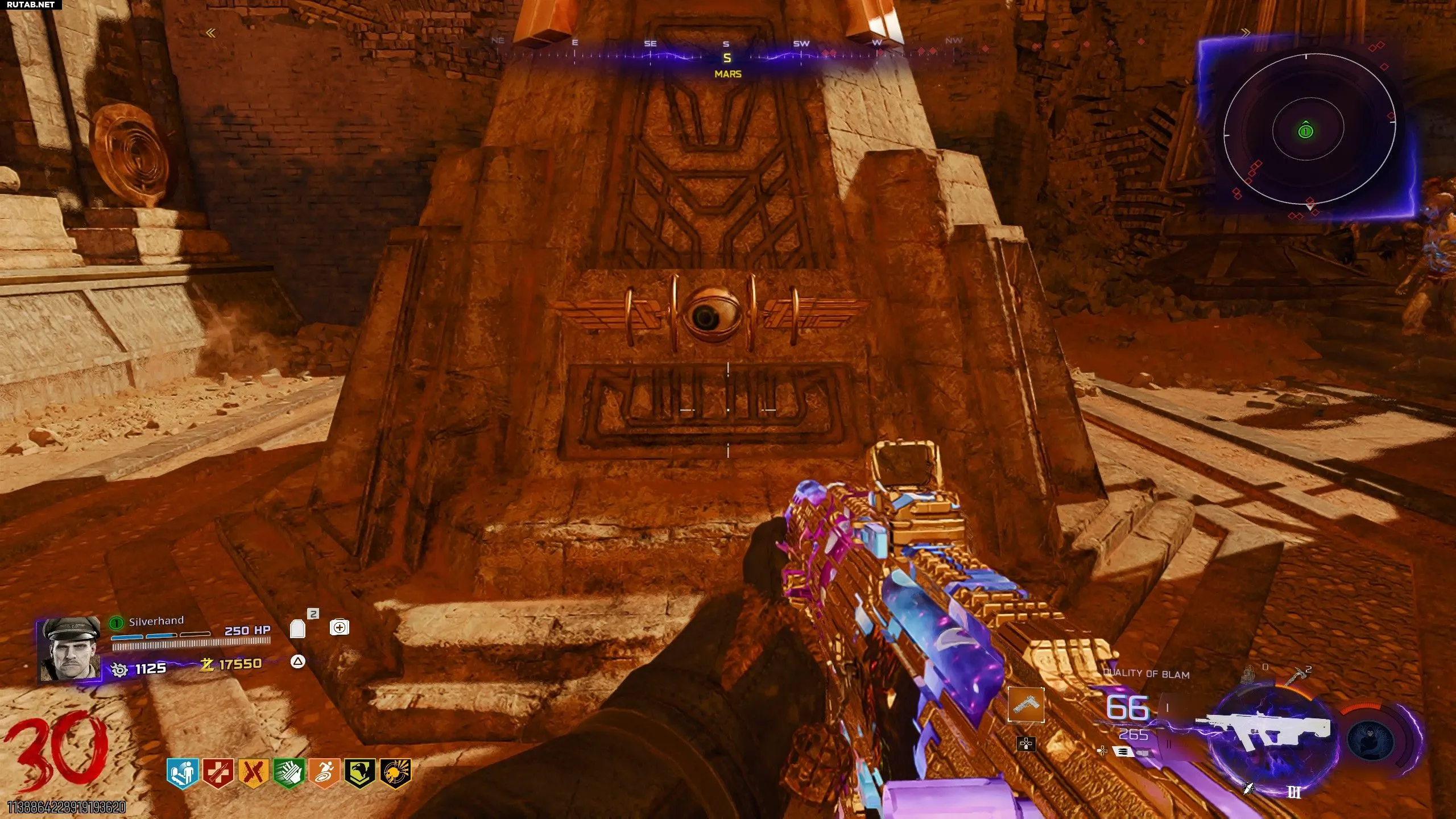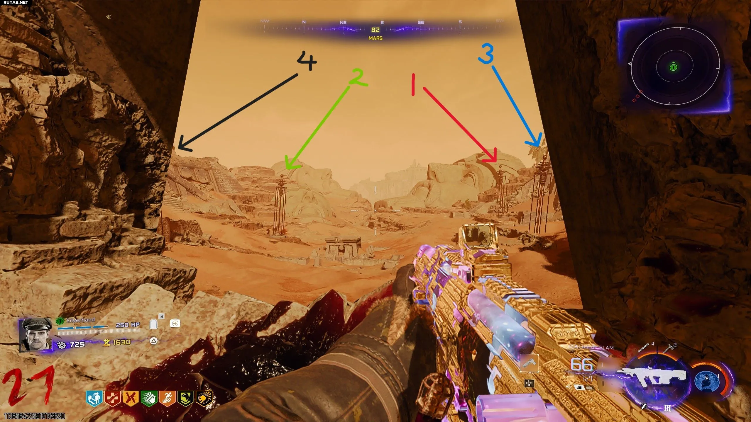 Оказавшись на Марсе, направляйтесь к центру и подберите мозг. Его можно поместить на алтарь в дальней части карты, где находится портал, ведущий обратно в Астру Малориум. Теперь в начале раунда можно взаимодействовать с мозгом, чтобы воспроизвести звук. Как только он прозвучит, немедленно бегите к юго-восточному отверстию в стене, откуда вдалеке будут видны четыре пилона. Стрелять в них нужно в следующем порядке: задний правый → задний левый → передний правый → передний левый (от самого дальнего к самому ближнему к вам). При правильном выстреле пилон загорится синим светом.
