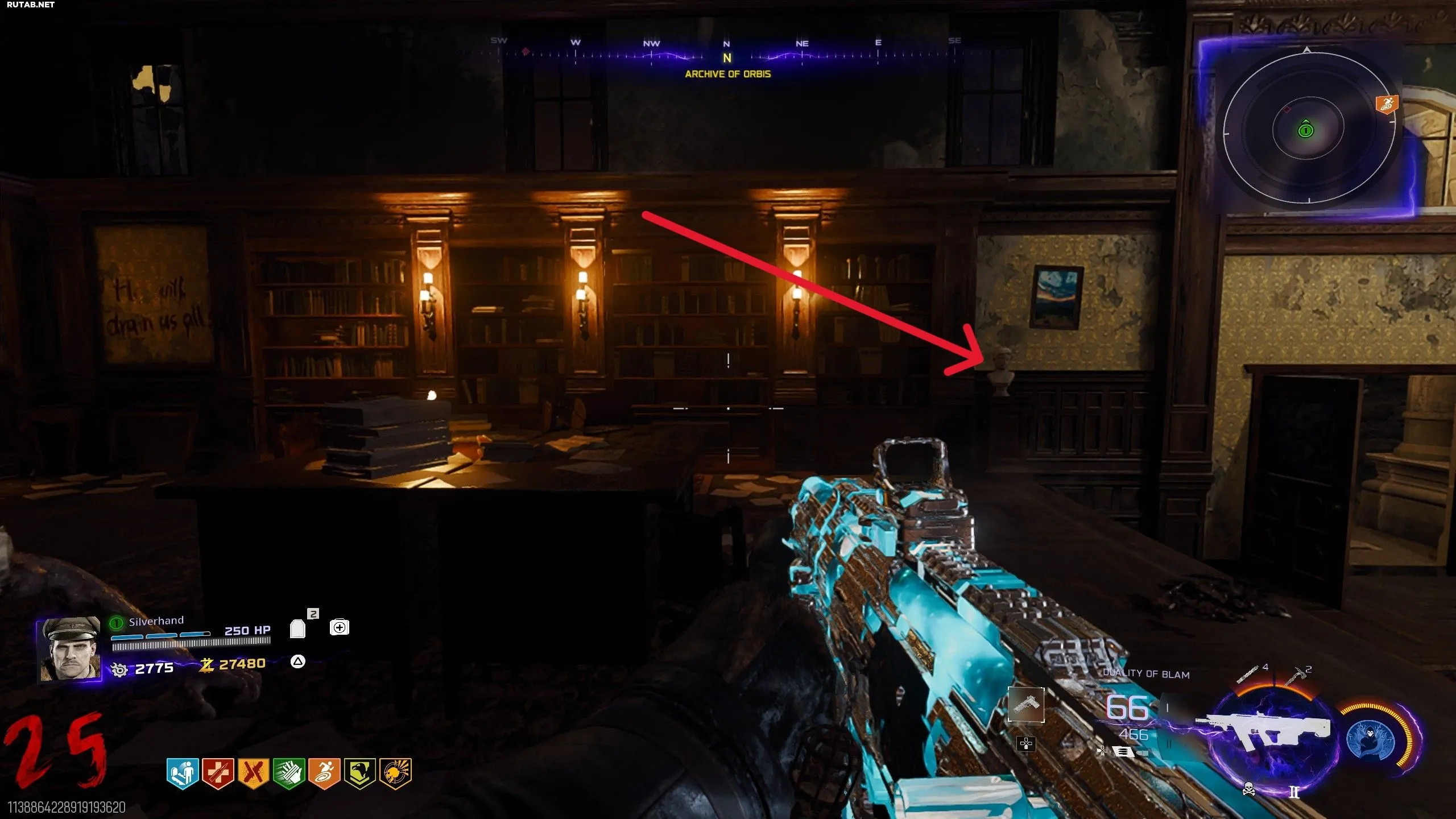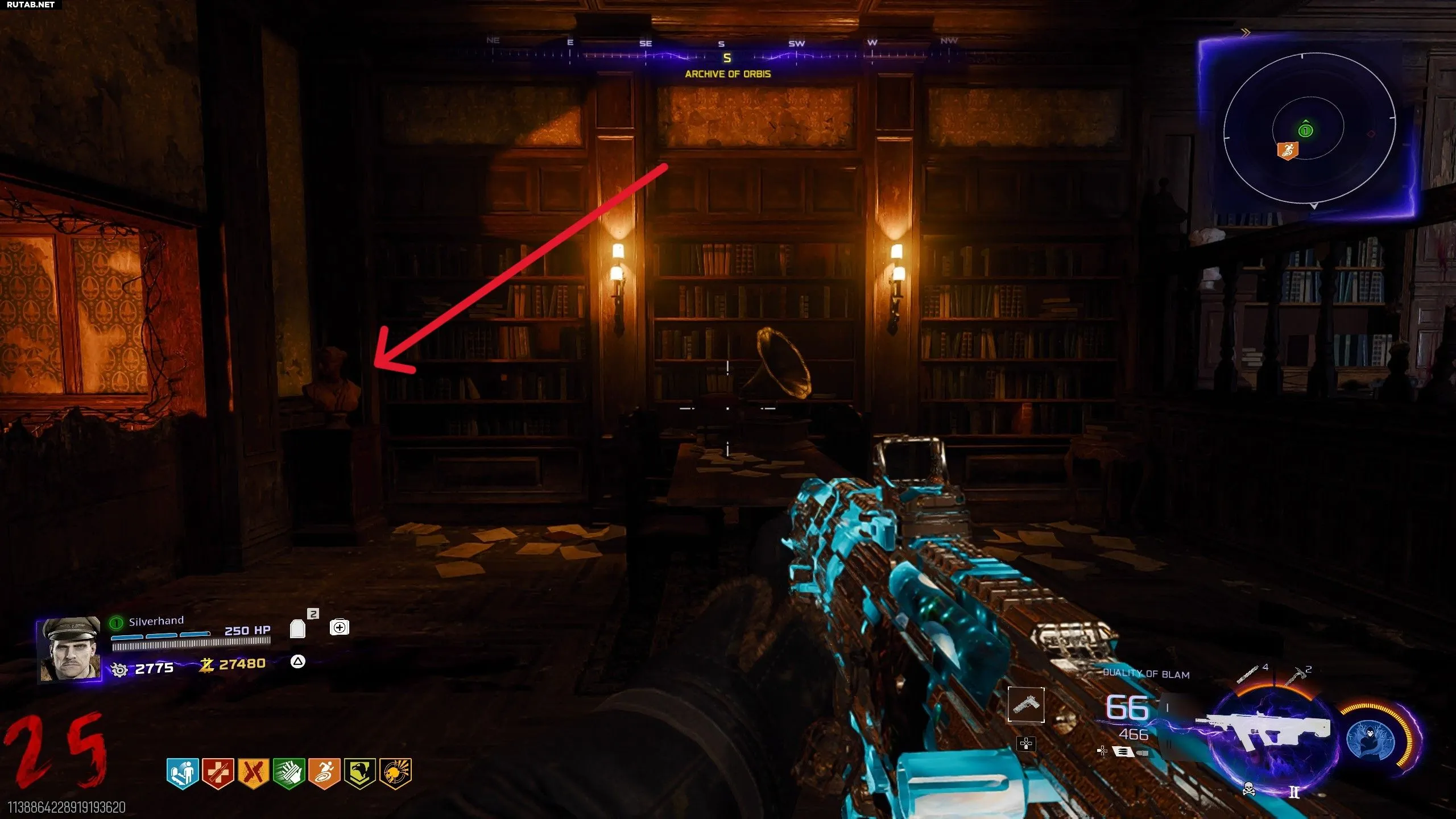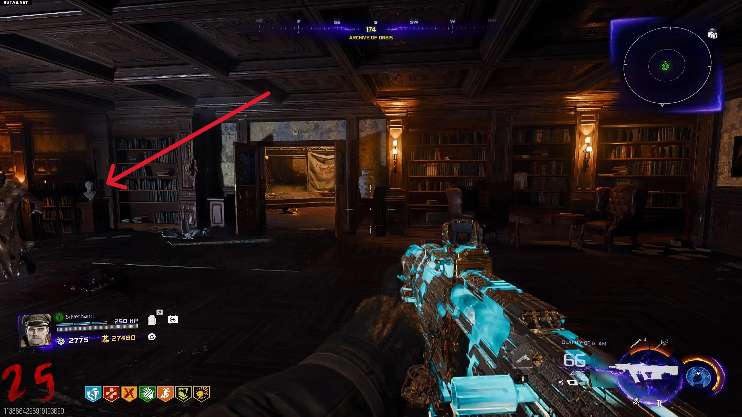 Взаимодействуйте с книжными полками, подсчитайте, сколько нужных книг находится на каждой стене, а затем взаимодействуйте с бюстом-статуей соответствующее количество раз. Например, если на одной стене есть 2 нужные книги, то с бюстом на этой стене нужно будет взаимодействовать дважды. Учтите, что на все действия у вас есть около 15 секунд, поэтому заранее запомните, сколько раз нужно взаимодействовать с каждым бюстом.
