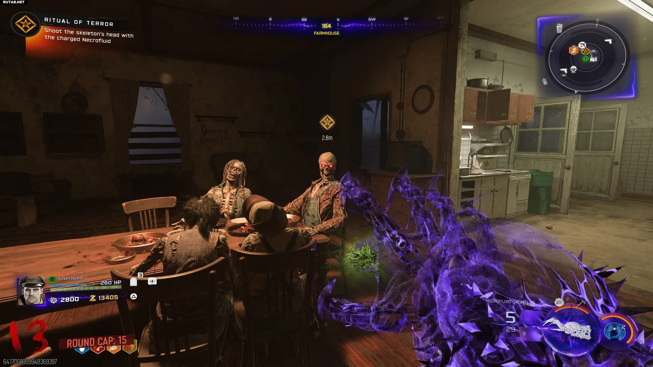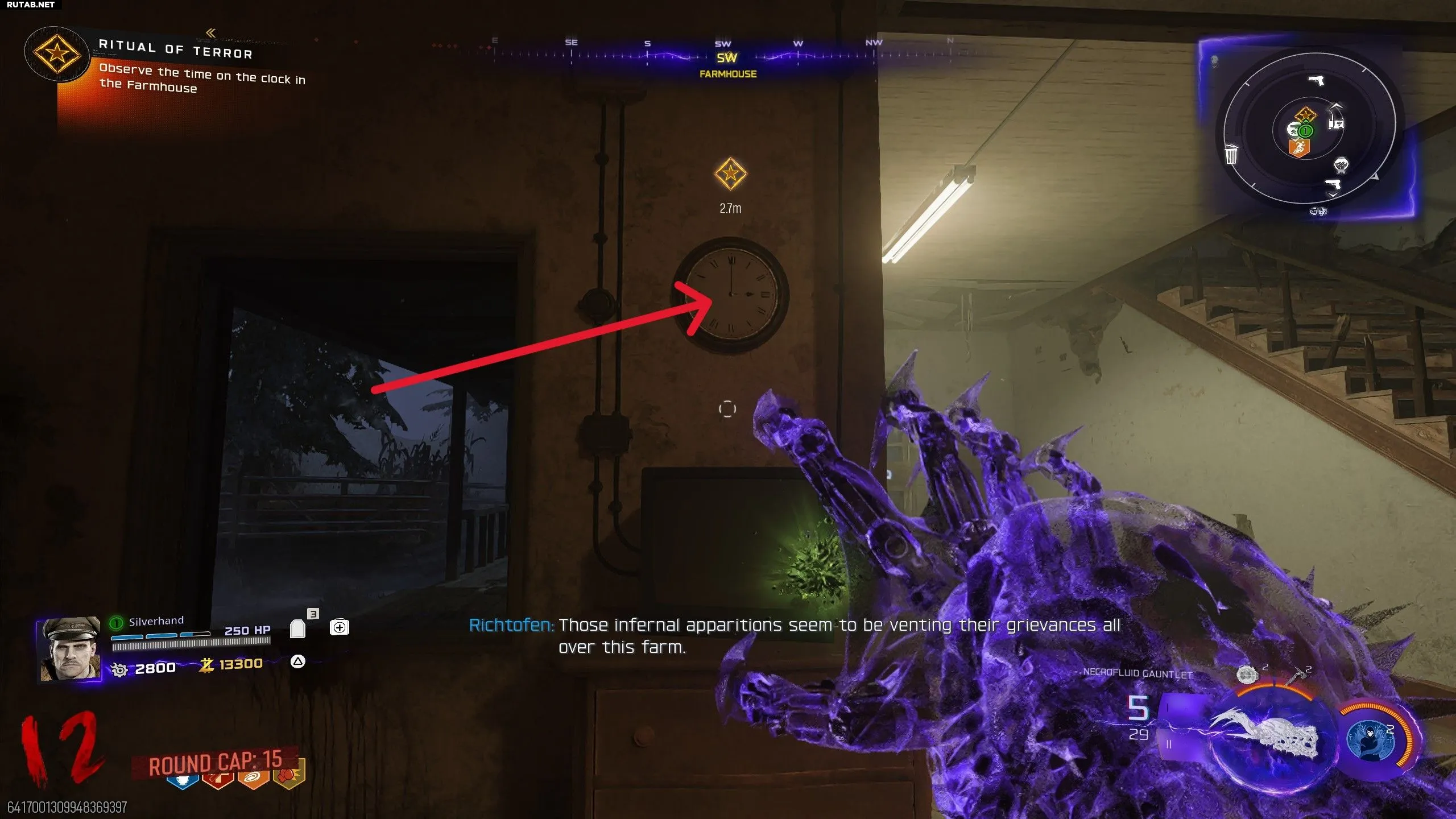 Получив турель DG-2 для Старушки Тесси, вы можете перейти к следующему шагу пасхального яйца. Для начала нужно выстрелить из турели DG-2 в часовую башню в Эшвуде, а затем выстрелить из Некрожидкостной перчатки в циферблат часов и перезарядить её, чтобы она стала фиолетовой. Теперь пора отправиться на ферму Вандорн и войти в фермерский дом, где за обеденным столом сидят трупы членов семьи Вандорн.