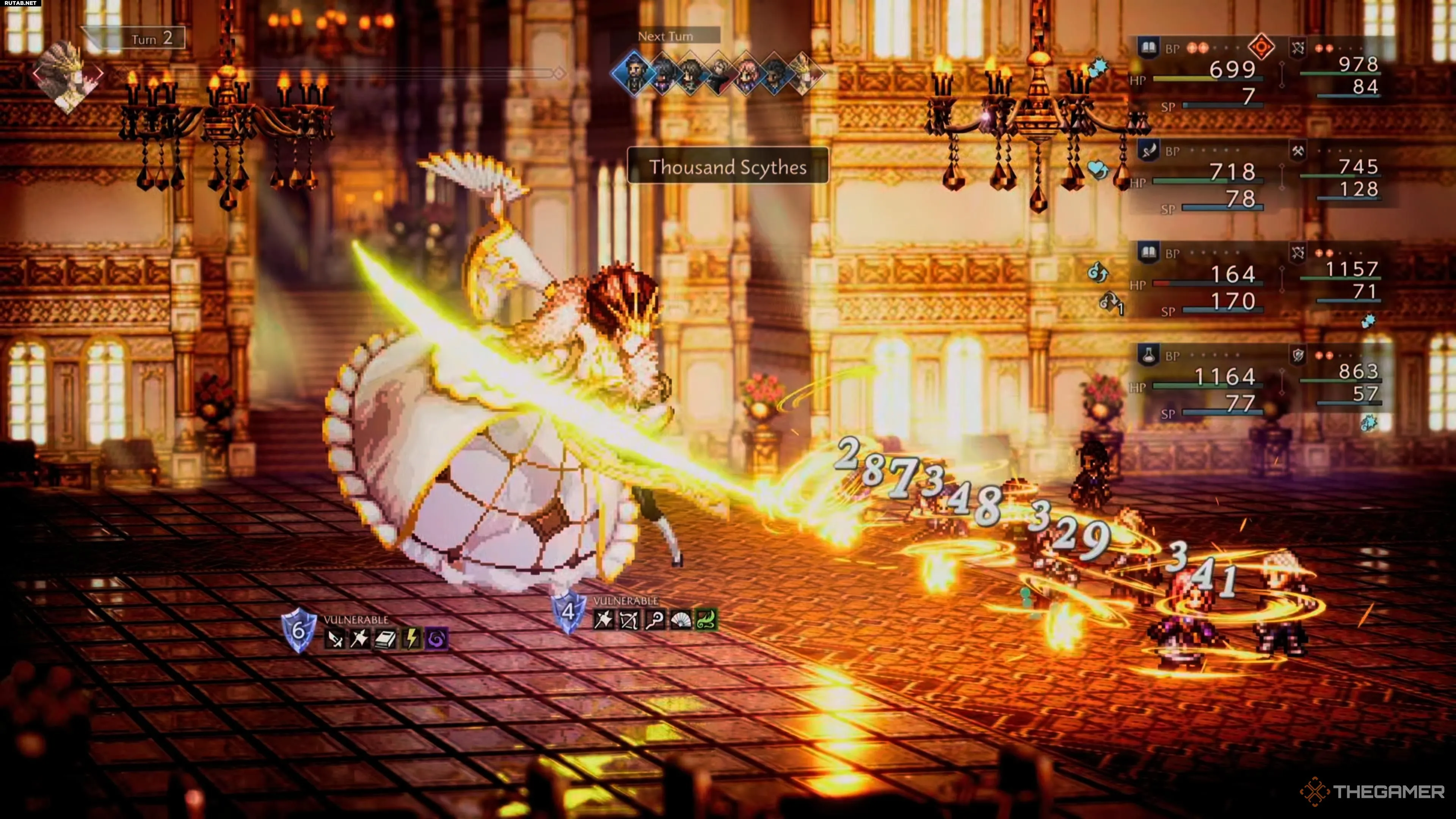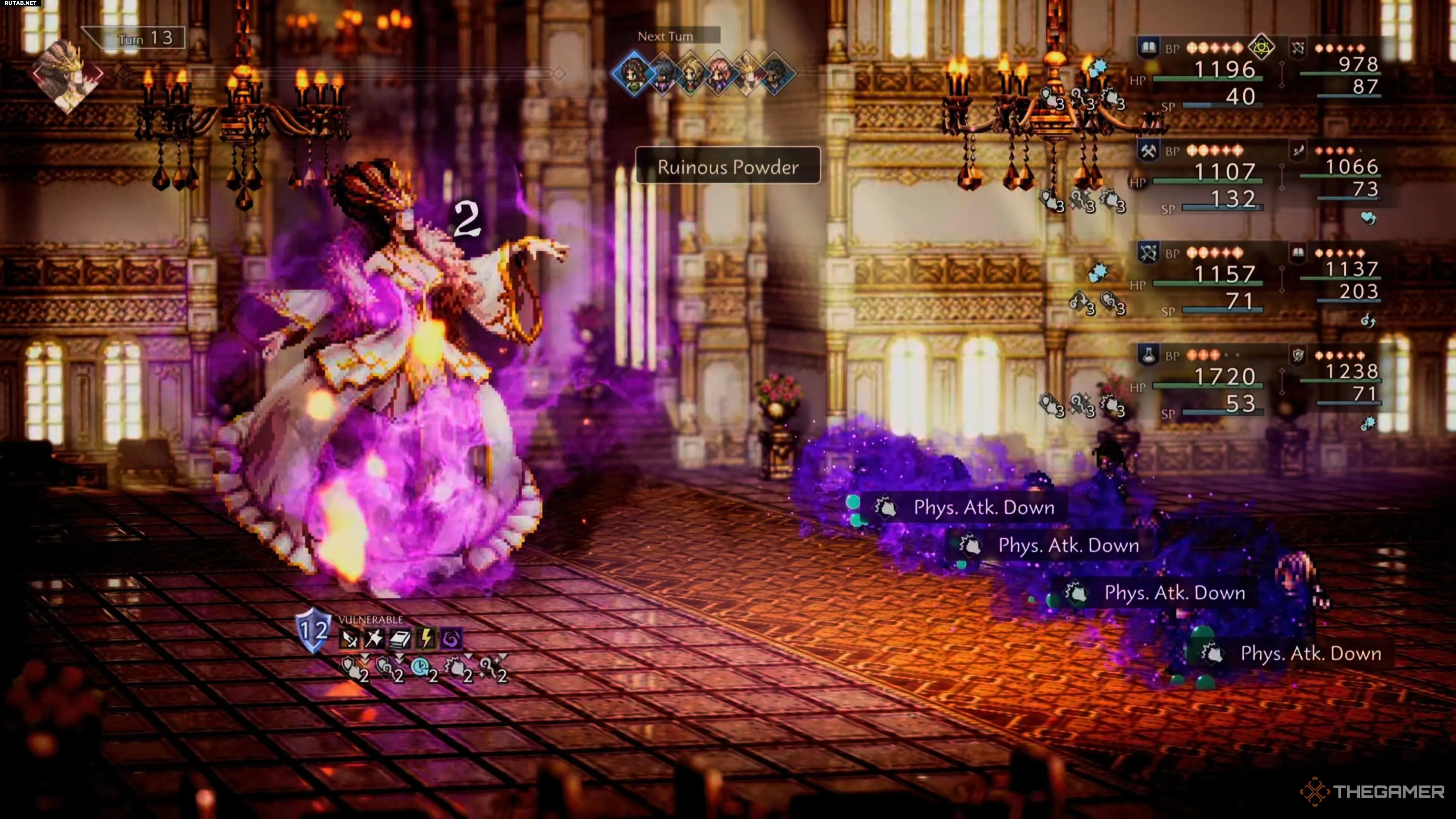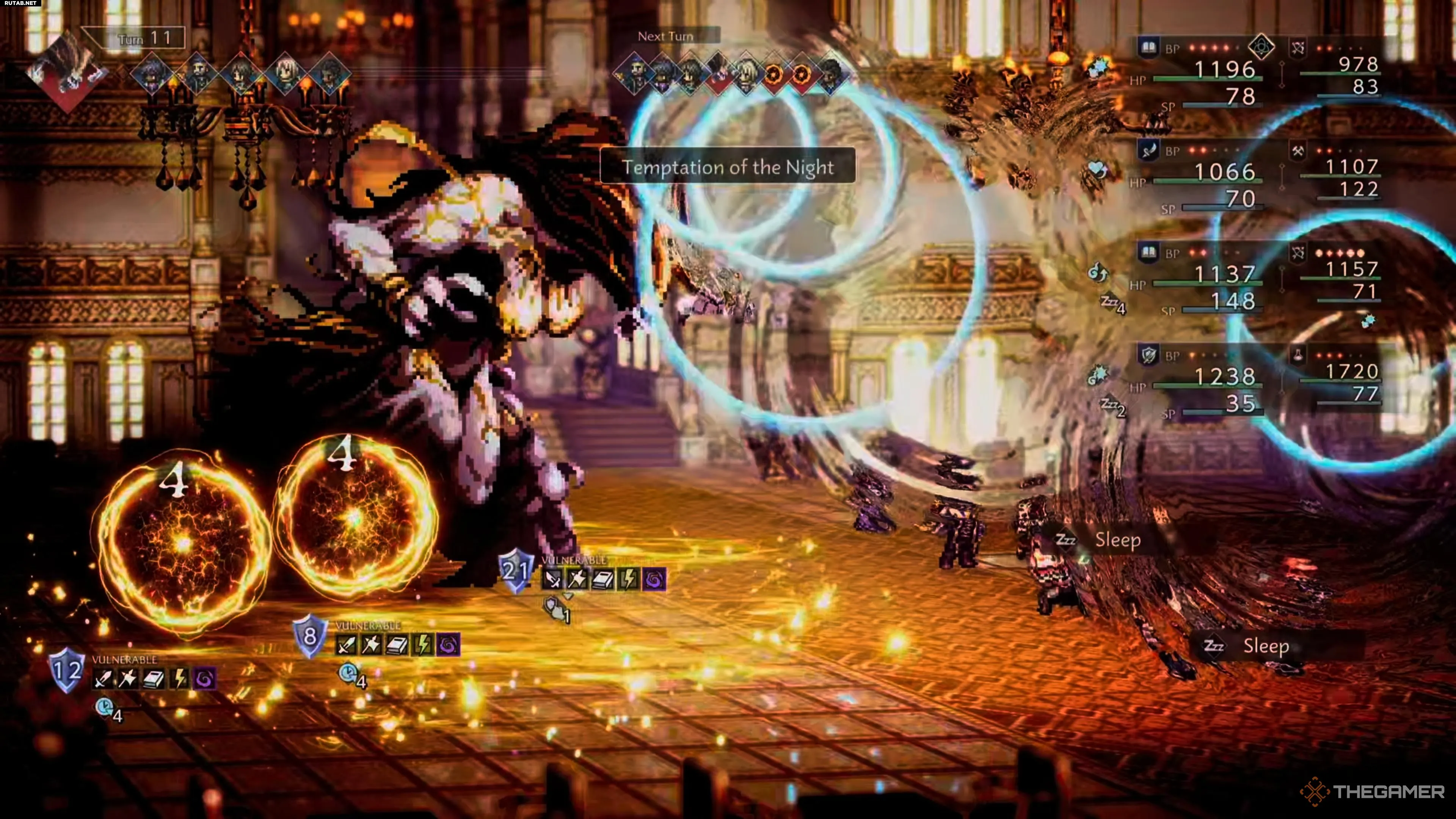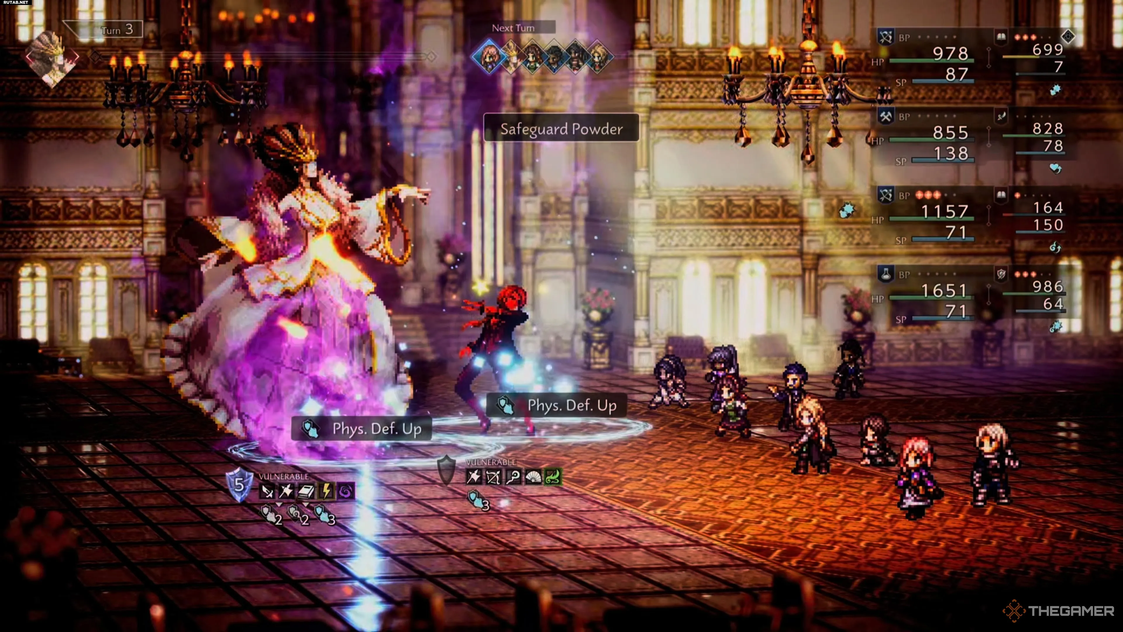 Продолжайте ломать её защиту, копите BP в заднем ряду и меняйте персонажей местами, чтобы держать в переднем ряду более защищённых членов отряда, особенно тех, кто не зависит от SP.
