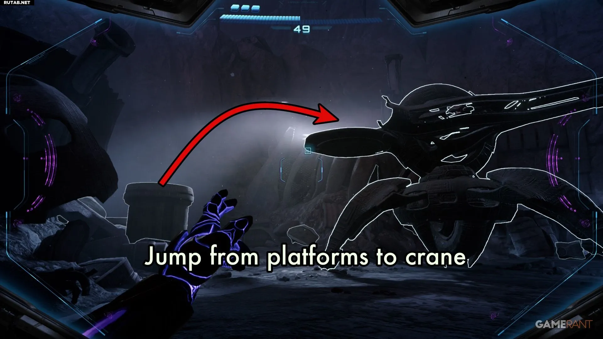 В конце пути вы попадёте в большой зал с краном, стрела которого нависает над центральной зоной. На её конце будет видно красное свечение. Осмотрев помещение, вы найдёте платформы, которые позволят запрыгнуть на корпус крана.