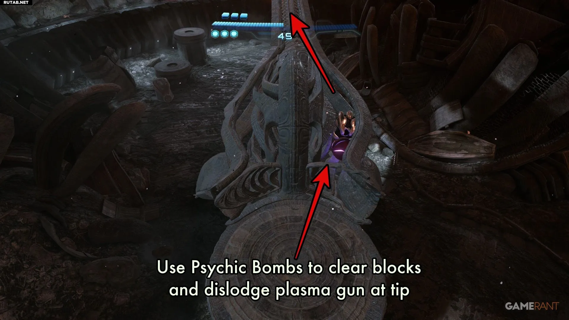 Оказавшись наверху, используйте Шар-морф и Пси-бомбы, чтобы пробраться по узкому проходу к концу стрелы. Там снова примените Пси-бомбу, чтобы разрушить механизм. Это вызовет короткую кат-сцену, в которой вы увидите, как светящийся предмет освобождается.