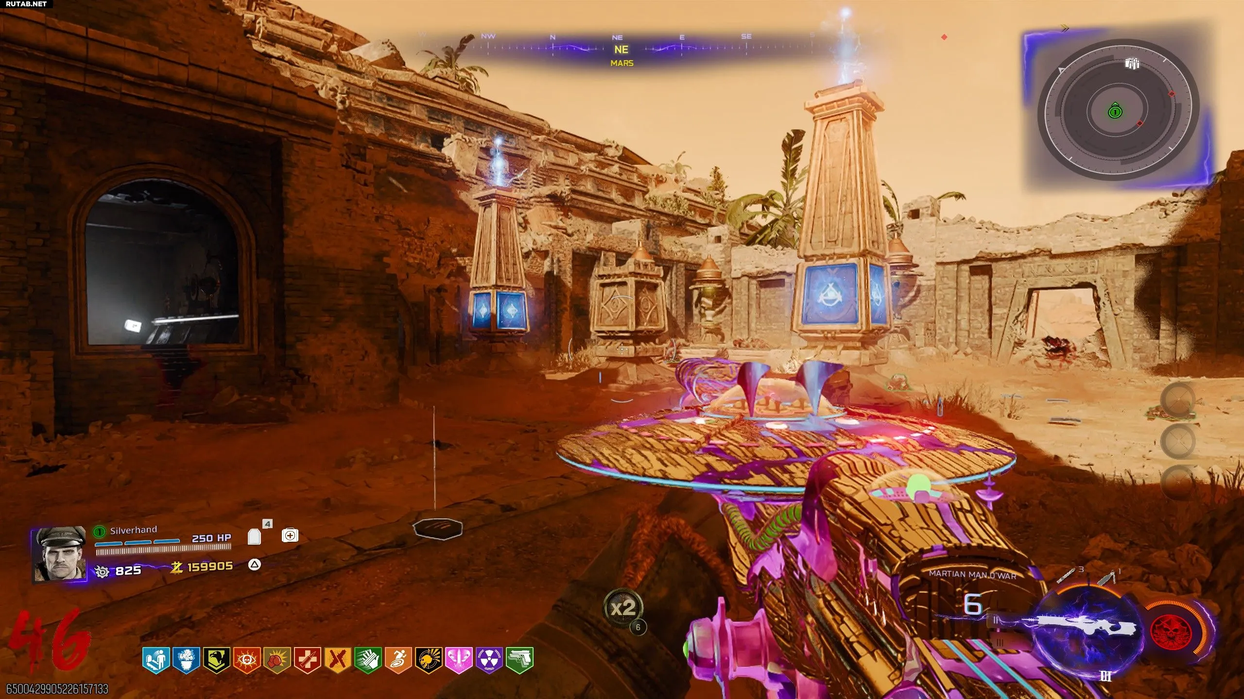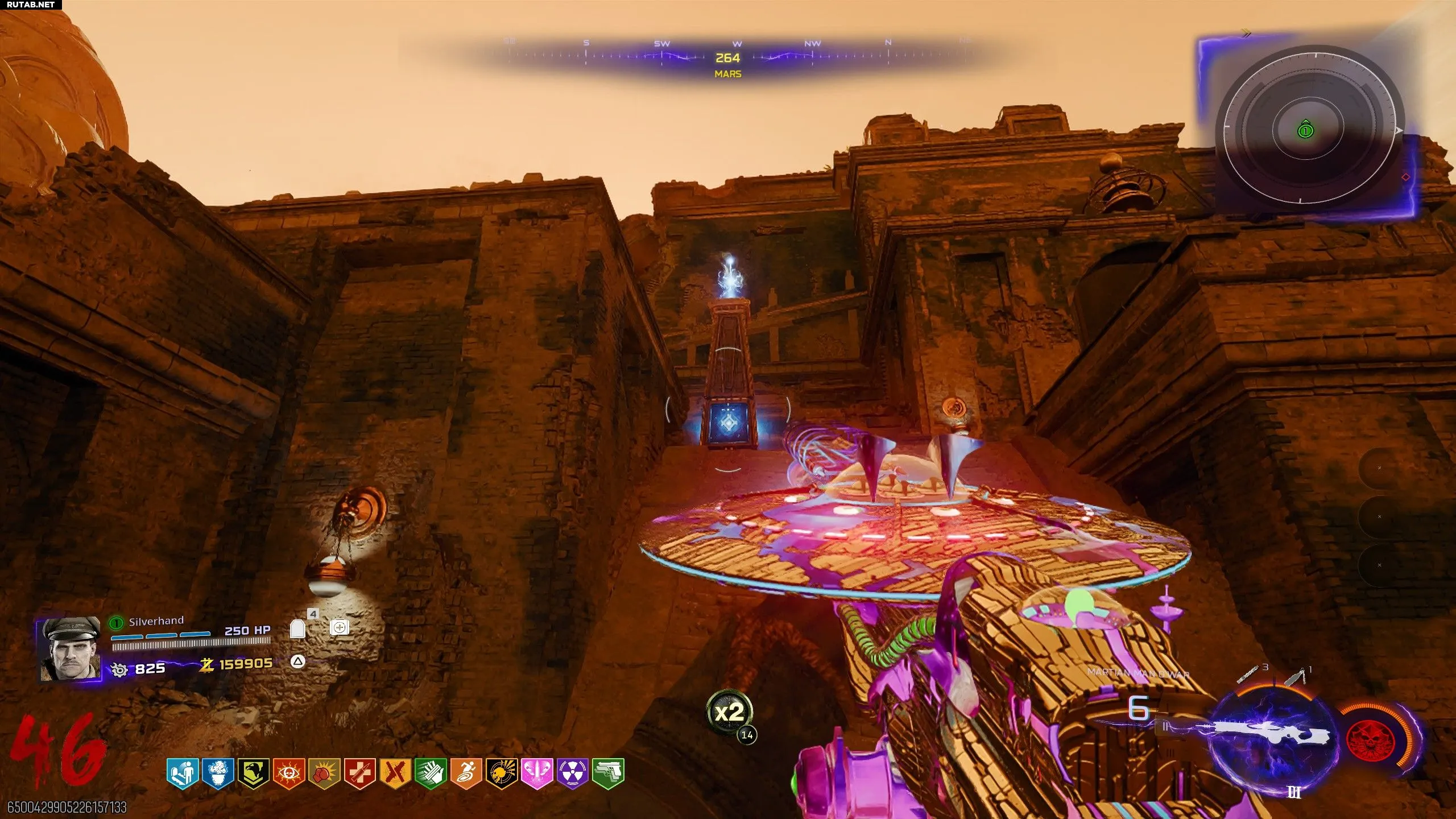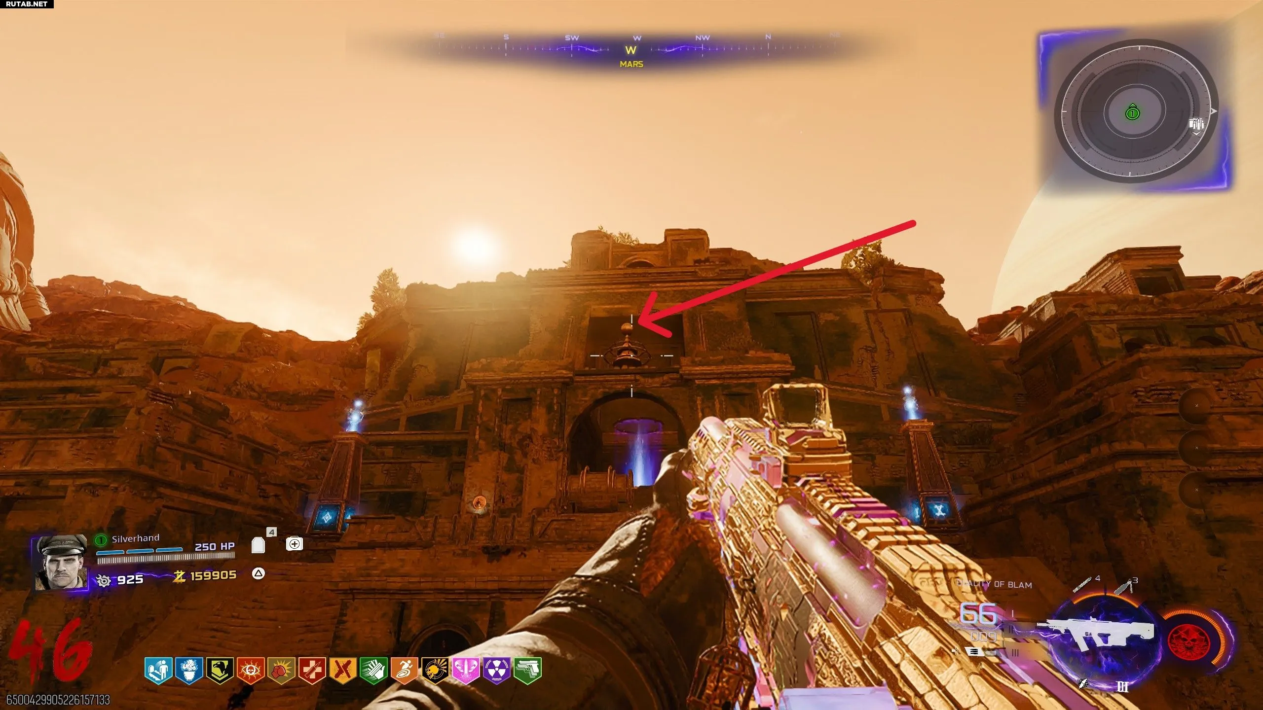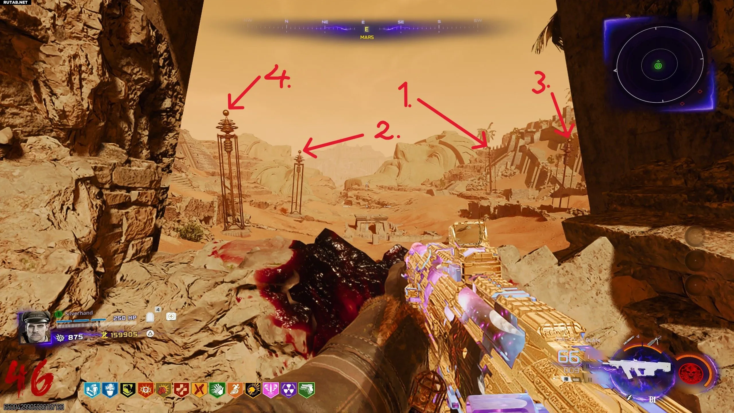 Когда «Возносящееся Око» на месте, используйте чудо-оружие LGM-1, чтобы выстрелить в верхушки 5 особых столбов на Марсе. При правильном попадании их вершины засветятся синим. Все столбы находятся в этой же комнате, и вам нужно попасть в золотые антенны на их верхушках. Если на каком-то столбе нет антенны, попробуйте начать новый раунд или просто перейдите к следующему шагу: