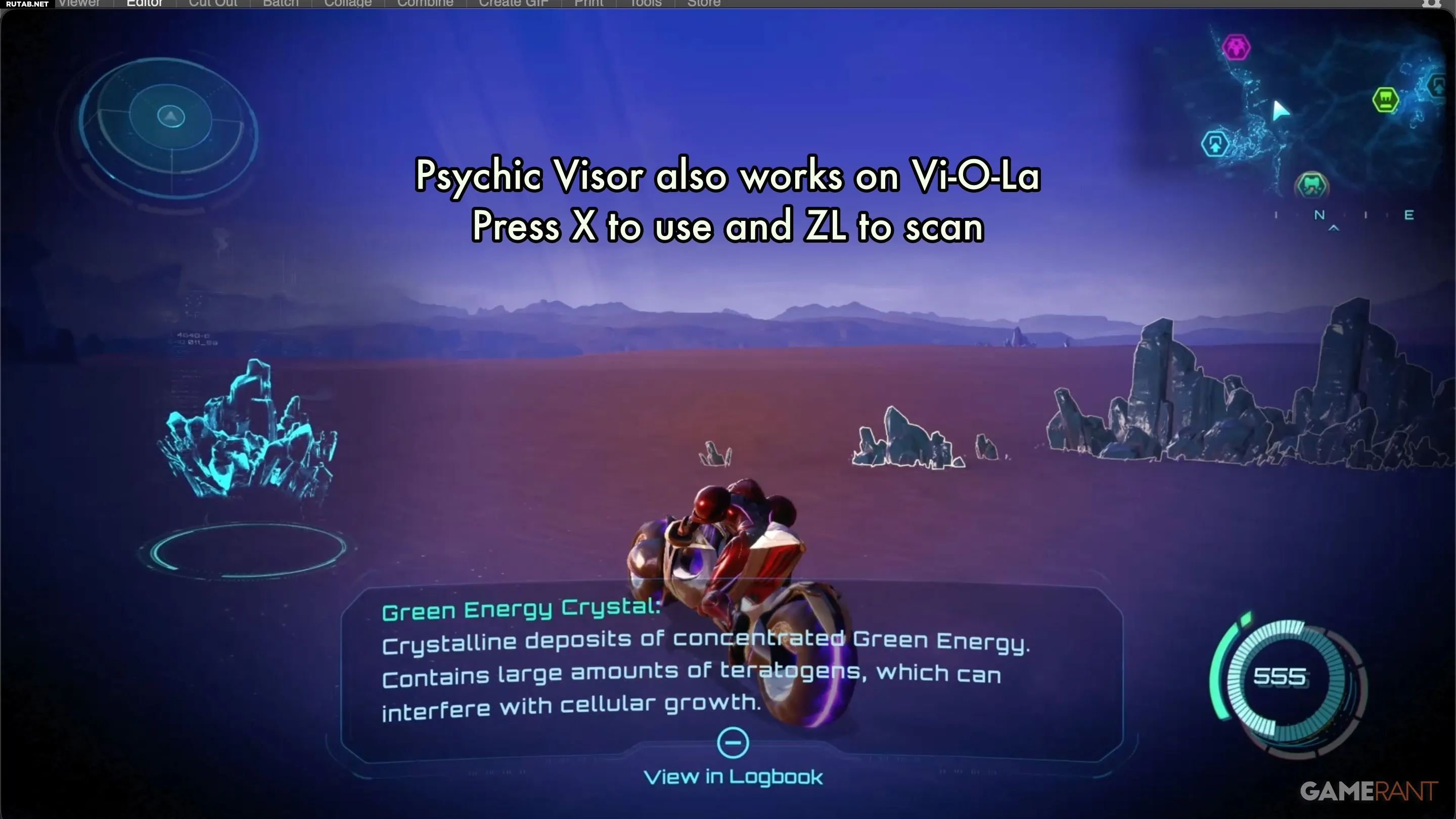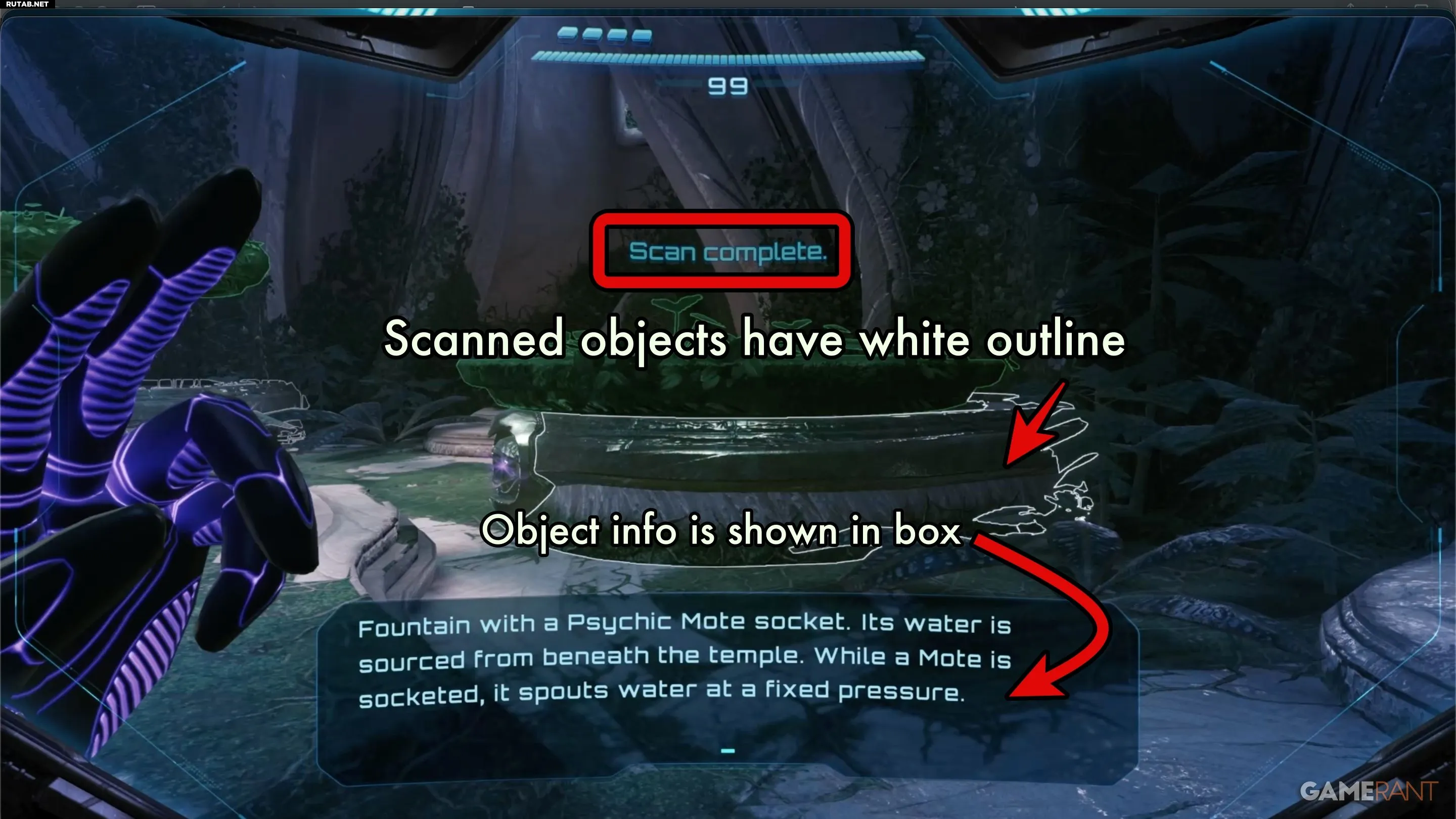Чтобы отсканировать объект, переключитесь в режим Пси-визора, затем зажмите кнопку ZL — ту же самую, что используется для фиксации на цели в бою. На экране появится индикатор прогресса, и по его завершении вы получите уведомление об успешном сканировании. Под объектом появится текстовое окно с его описанием.