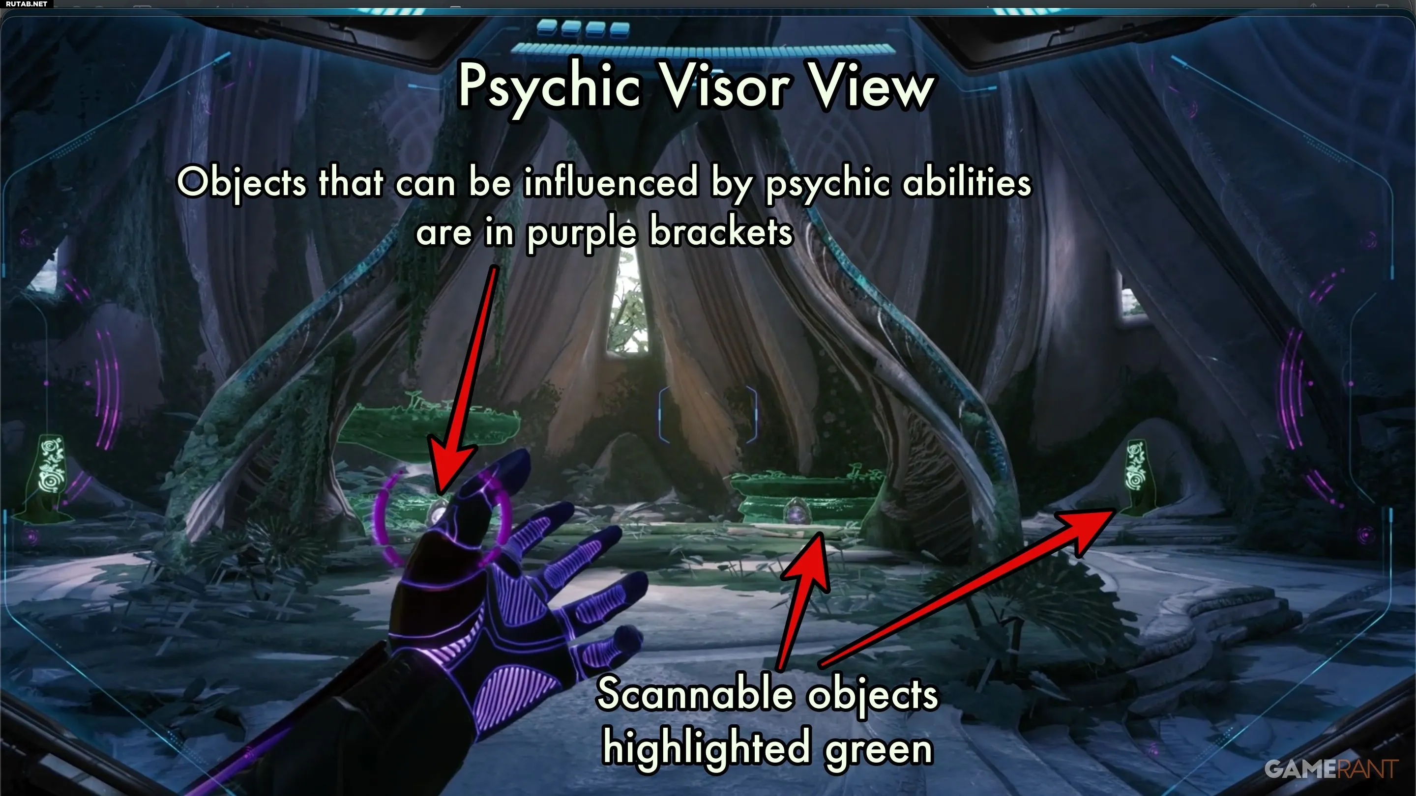 Когда вы активируете Пси-визор, цвета окружения изменятся. Любой объект, который можно просканировать, будет подсвечен зелёным цветом. Зелёная подсветка означает, что объект ещё не был отсканирован. После успешного сканирования объект будет обведён белым контуром.