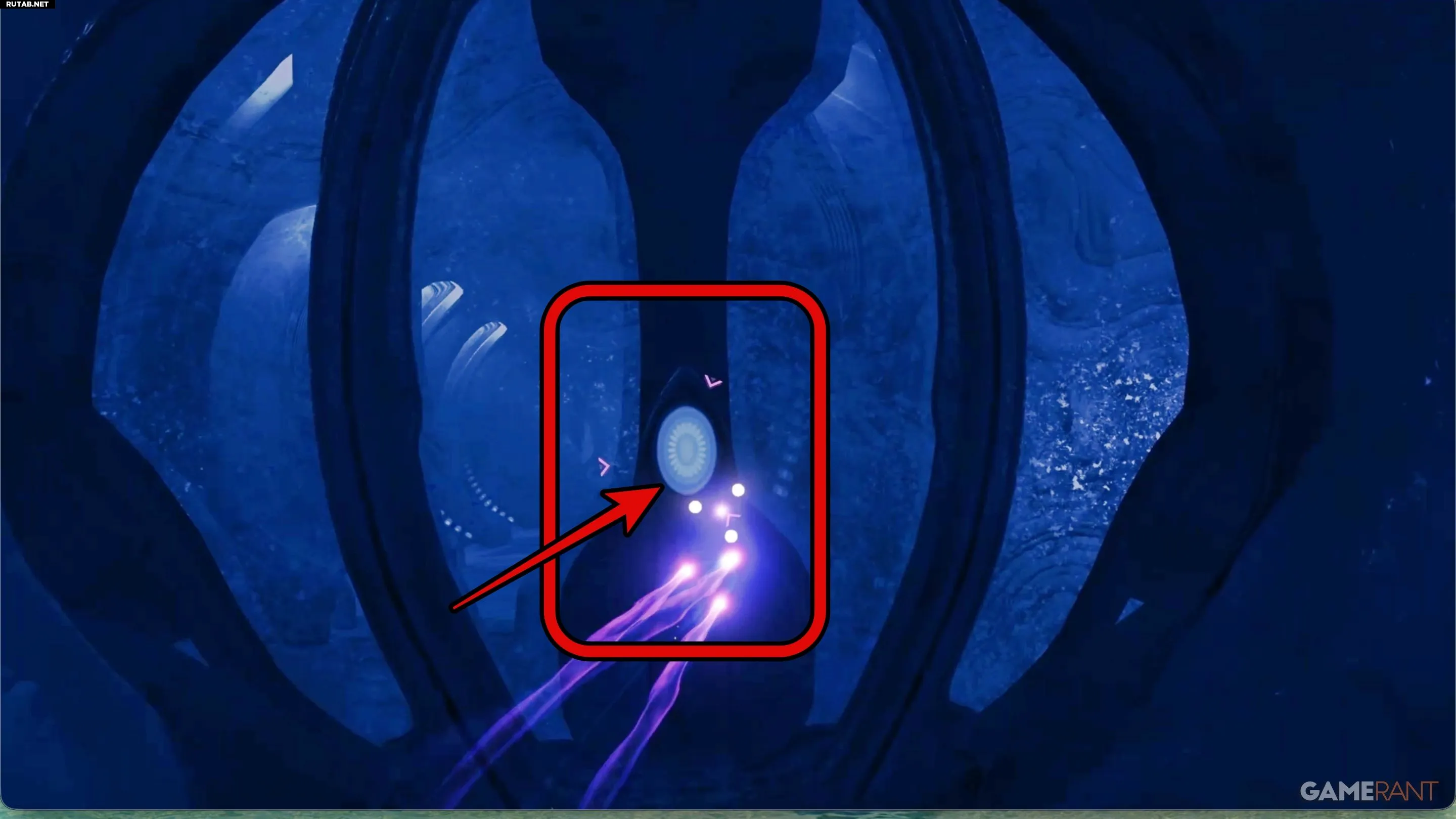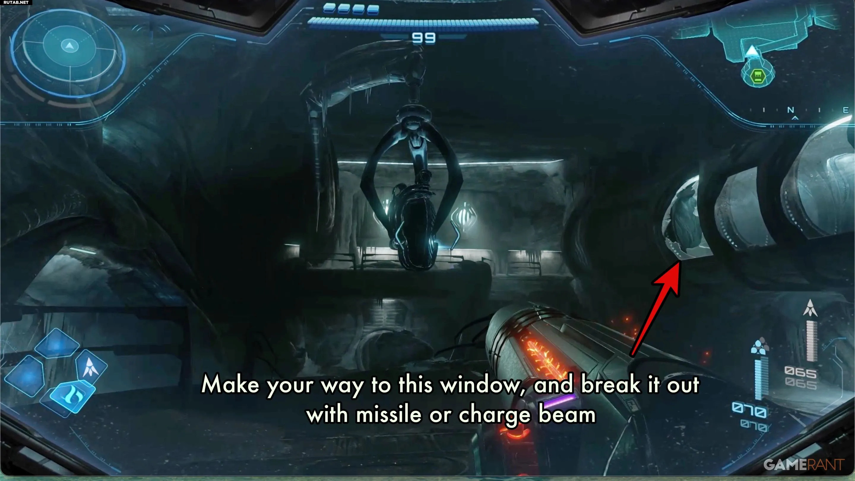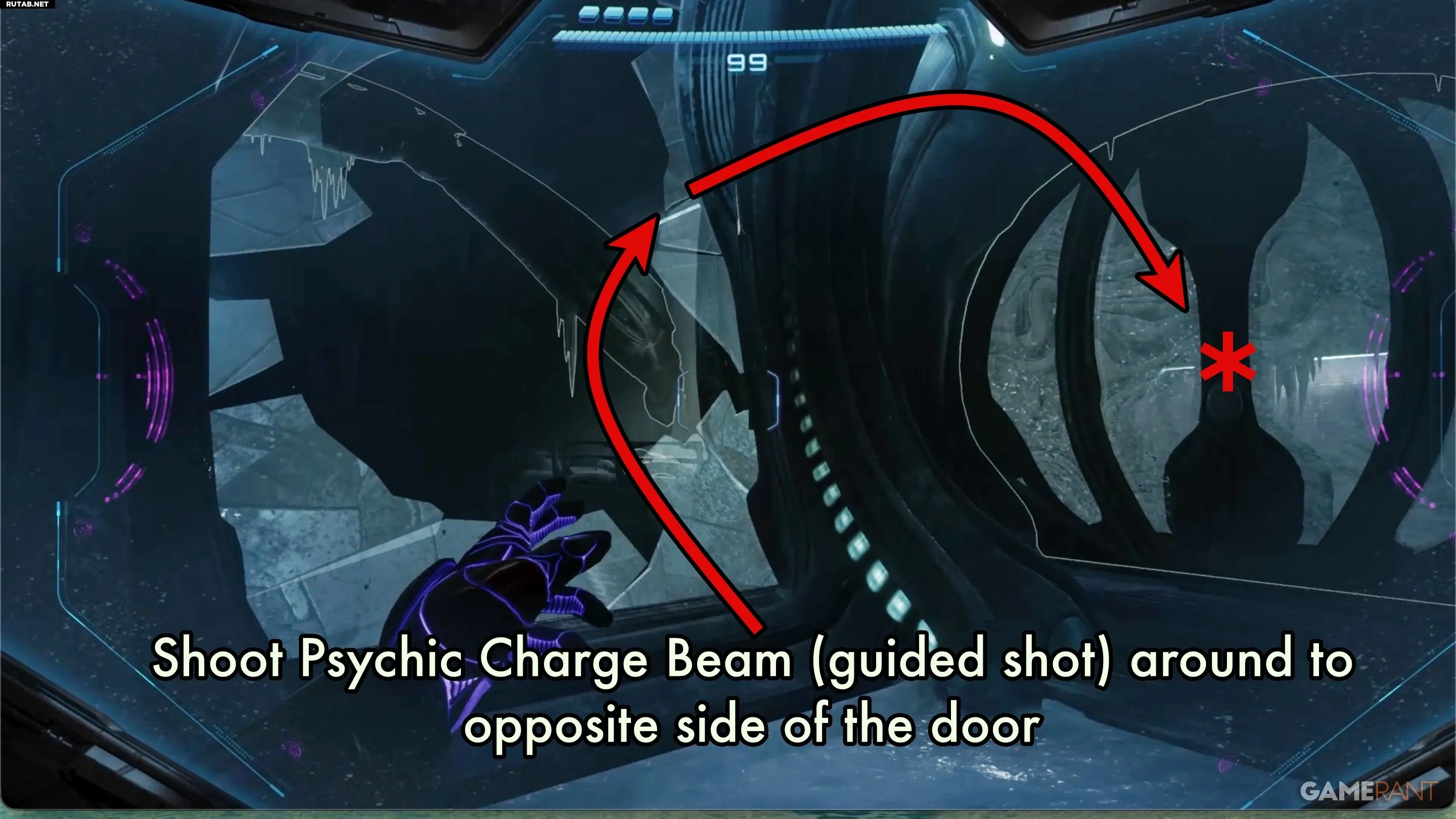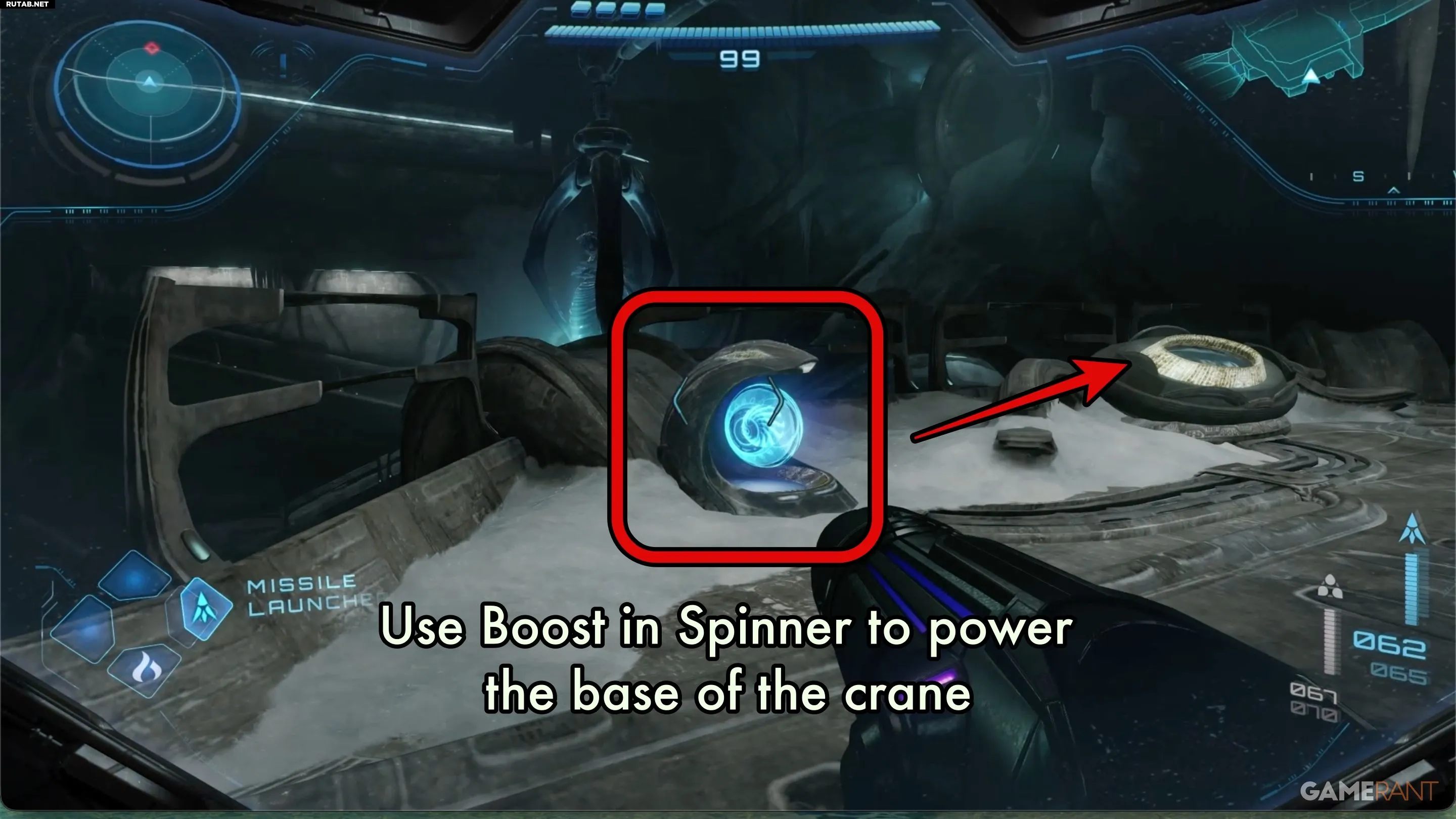 Стрельните наведённым Пси-лучом (Psychic Charge Beam) из разбитого окна так, чтобы он обогнул угол и попал в овальную мишень с другой стороны двери. Дверь откроется, и вы получите доступ к спиннеру для Boost Ball у основания крана. Используйте улучшение, чтобы восстановить питание базы крана. Взаимодействуйте с появившейся голограммой над основанием, чтобы опустить капсулу с Ледяным чипом.