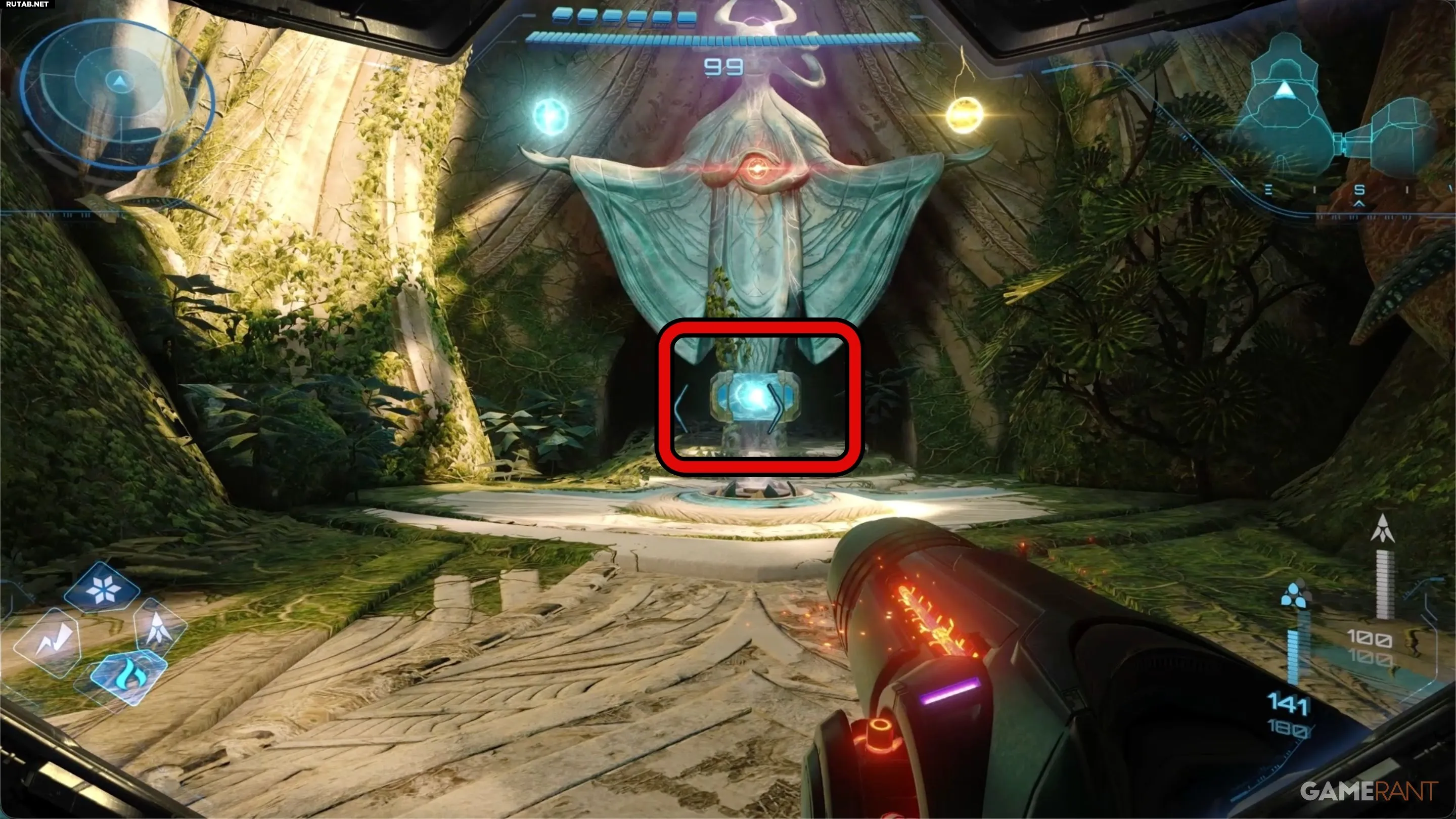 Поскольку Ледяной Выстрел вы откроете первым, скорее всего, вы сначала попадёте в зал Фонтана Безмятежности. Войдя, вы увидите два фонтана, но активен будет только один. Вода, кажется, поднимает платформу, на которую позже нужно будет запрыгнуть. Если просканировать левый фонтан, у его основания можно обнаружить Психический Узел.