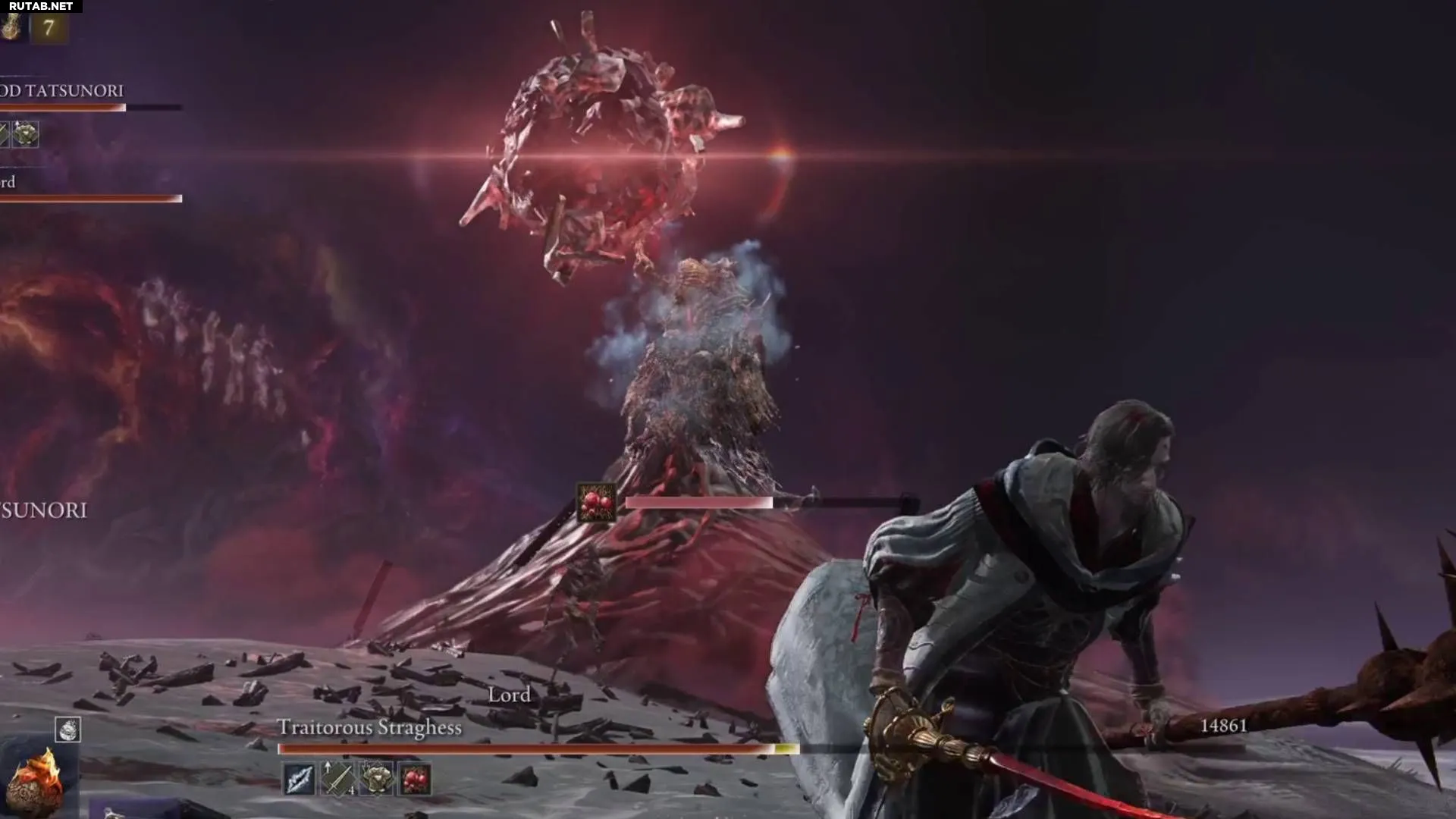 – Повышайте уровень и собирайте как можно больше фляг. Это очевидно для любого босса в игре, но для Повелителя Осадка достижение хотя бы 13-го (а в идеале 14-го или 15-го) уровня и сбор максимального количества фляг особенно важен, так как бой долгий и вы не можете полагаться на эксплуатацию уязвимостей. Настоятельно рекомендую пройти все уровни замков во время события Великая Пустошь Nightreign на второй день, так как боссы там — отличный источник рун, легендарного вооружения и улучшений.