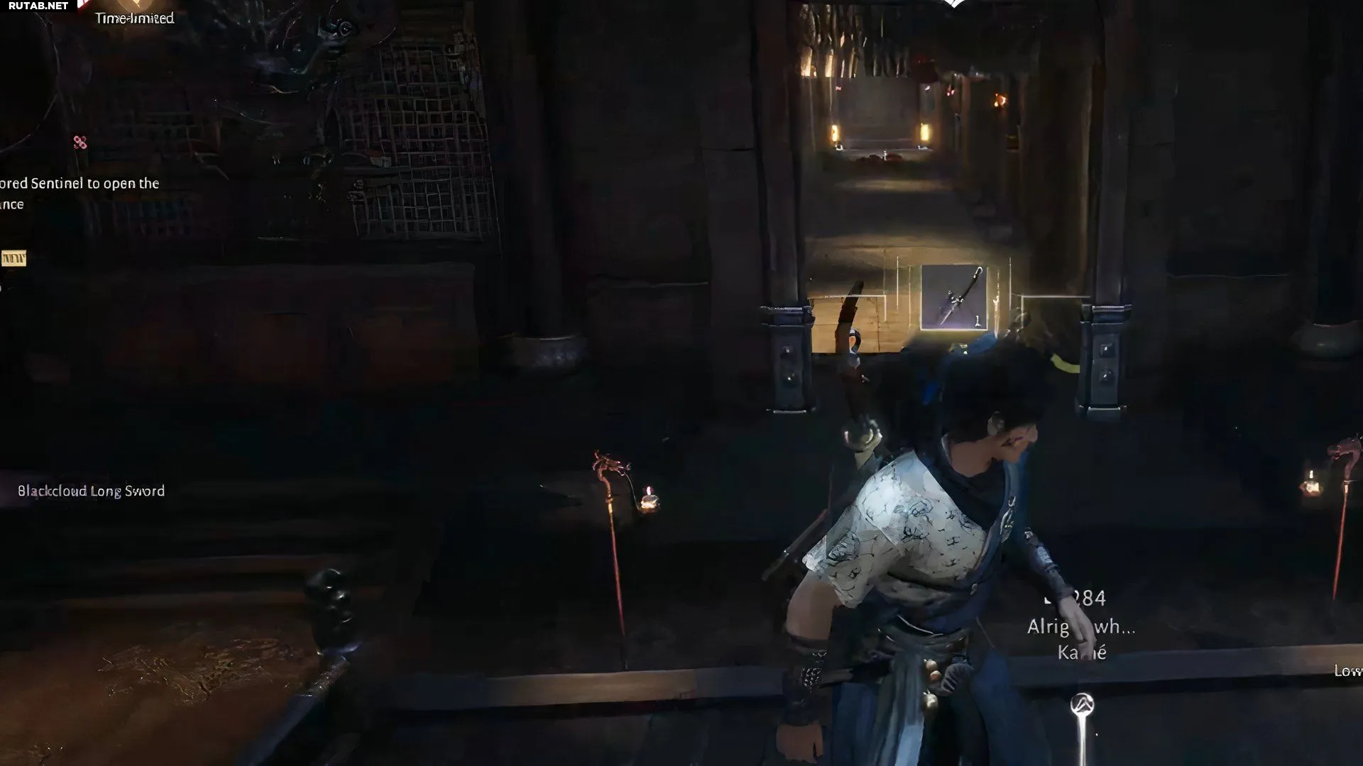 Отсюда вы попадёте в другой коридор с шипами, падающими сверху. Проскочите через них и активируйте рычаг в конце. Вас ждёт ещё одна головоломка с колоколом и молотком. Её решение откроет дверь в зал, где выставлен «Длинный меч Чёрного Облака».