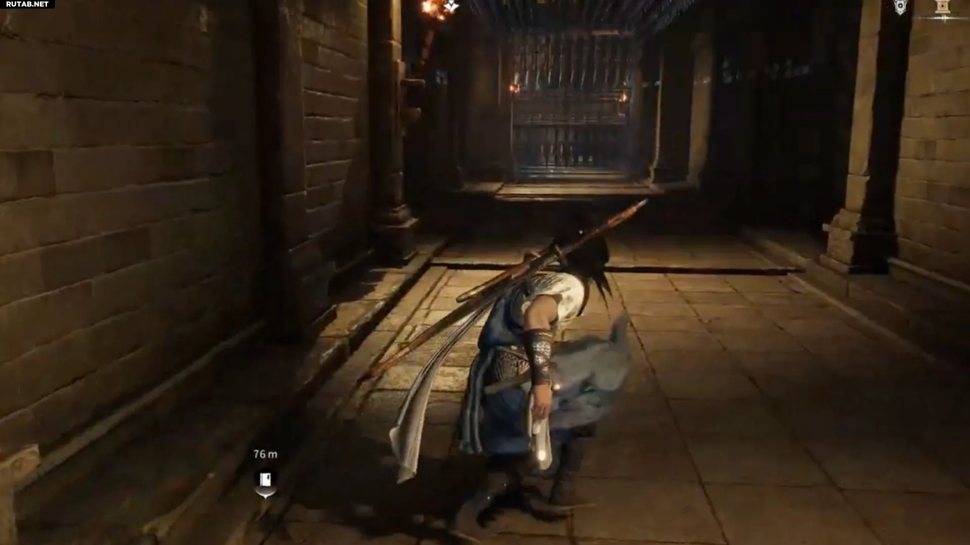 Чтобы получить длинное оружие, спуститесь по лестнице у входа в левое крыло. Вы попадете в коридор с шипами на стенах, которые выдвигаются и убираются в определенном ритме. Наблюдайте за паттерном и рассчитывайте время так, чтобы совершать рывок вперед в момент, когда шип начинает убираться.