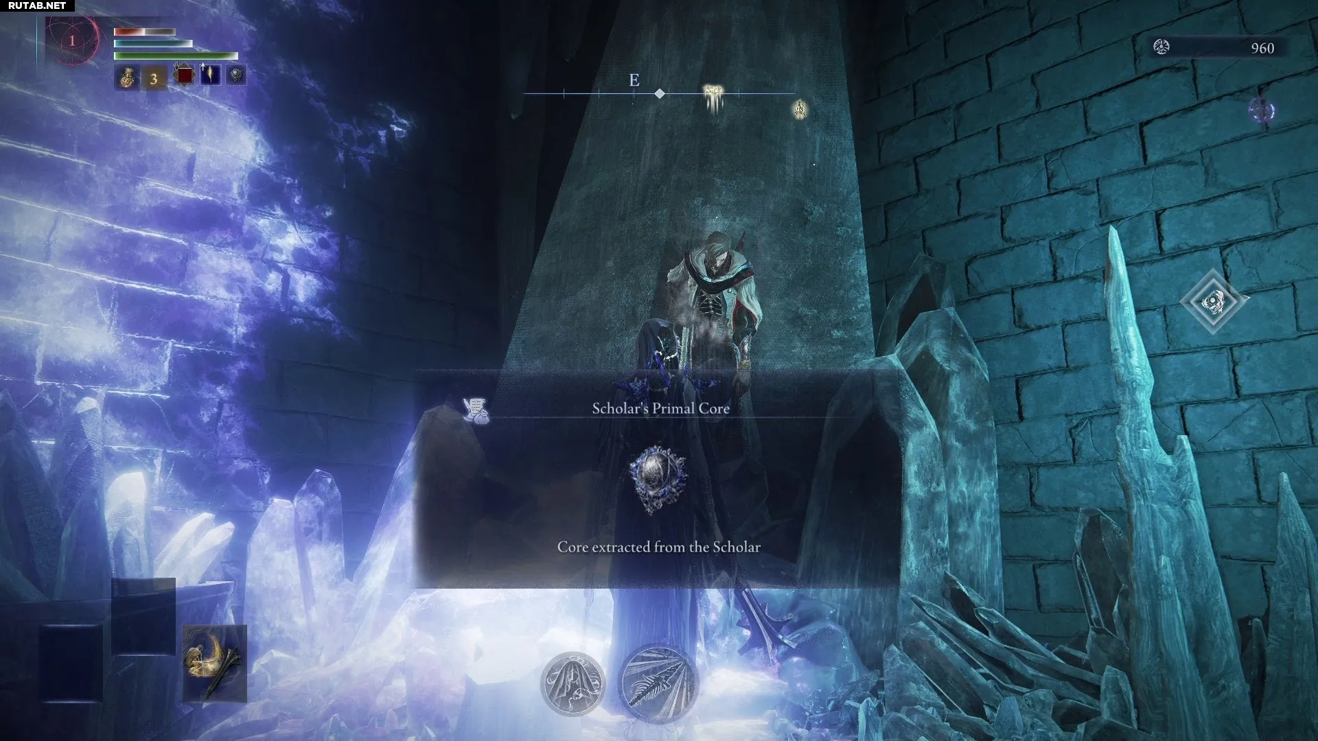 В следующей комнате взаимодействуйте с большим кристаллом в углу, внутри которого заточён Учёный. Вы получите Изначальное ядро Учёного.