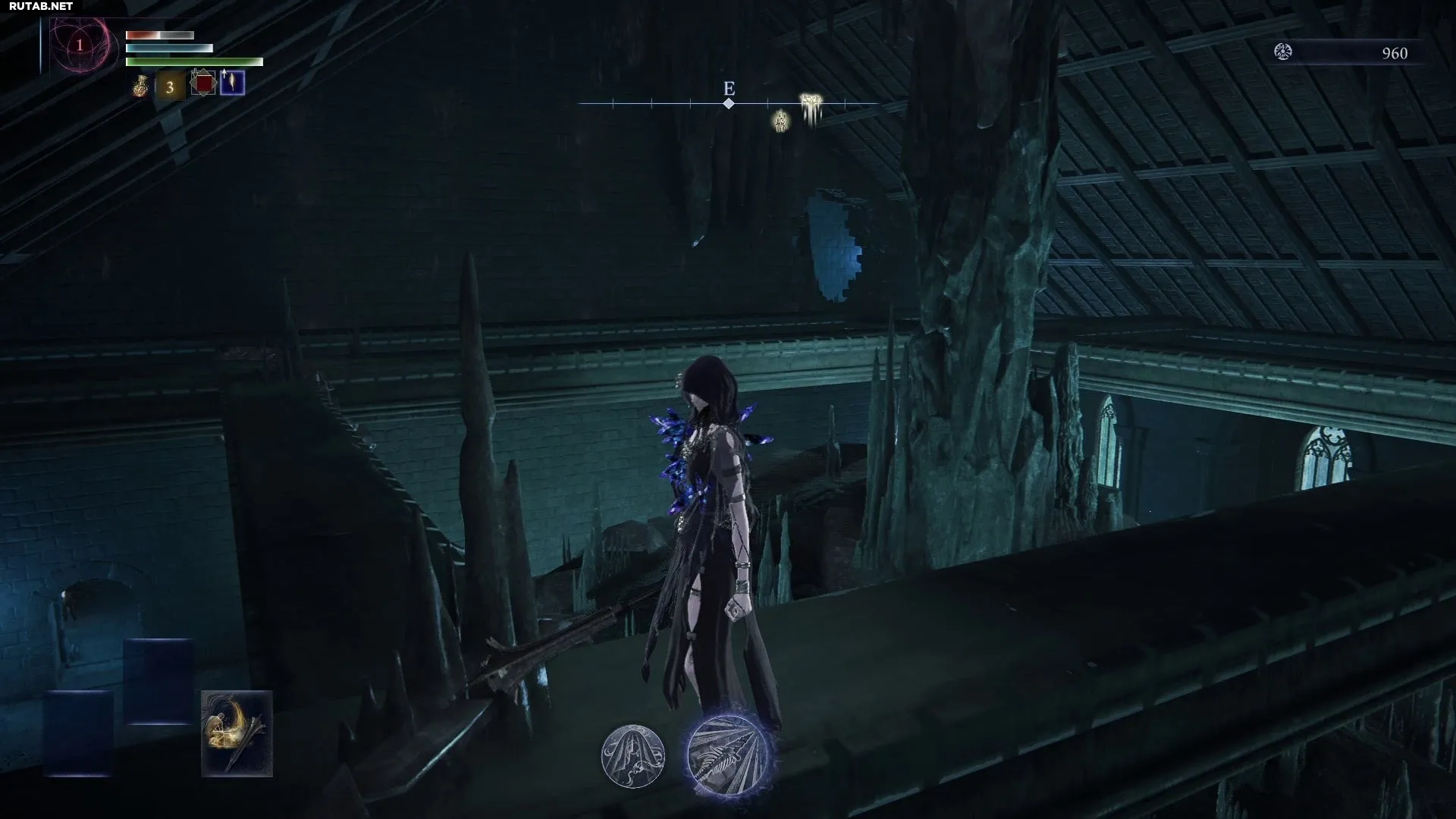 Взберитесь на серый призрачный камень в центре этой комнаты и пройдите по балкам, чтобы добраться до дыры в стене (см. изображение ниже). Это можно сделать на 1 уровне, но нужно быть очень осторожным, чтобы избежать встречи с Врагами на пути — они, скорее всего, убьют вас с одного удара.