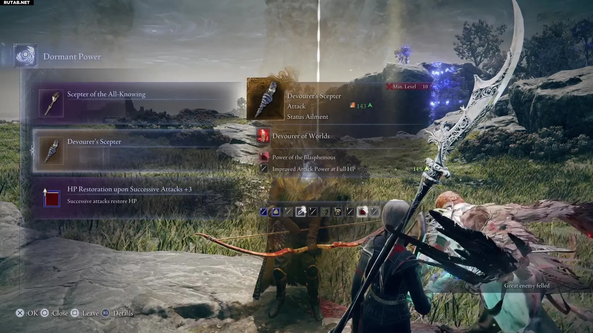 - Скипетр Пожирателя (Легендарный большой молот): Скейлинг уровня A от Силы и огненный урон — это хорошо, но вдобавок игроки получают эффект кражи здоровья при убийстве врагов, аналогичный способности Богохульного клинка.