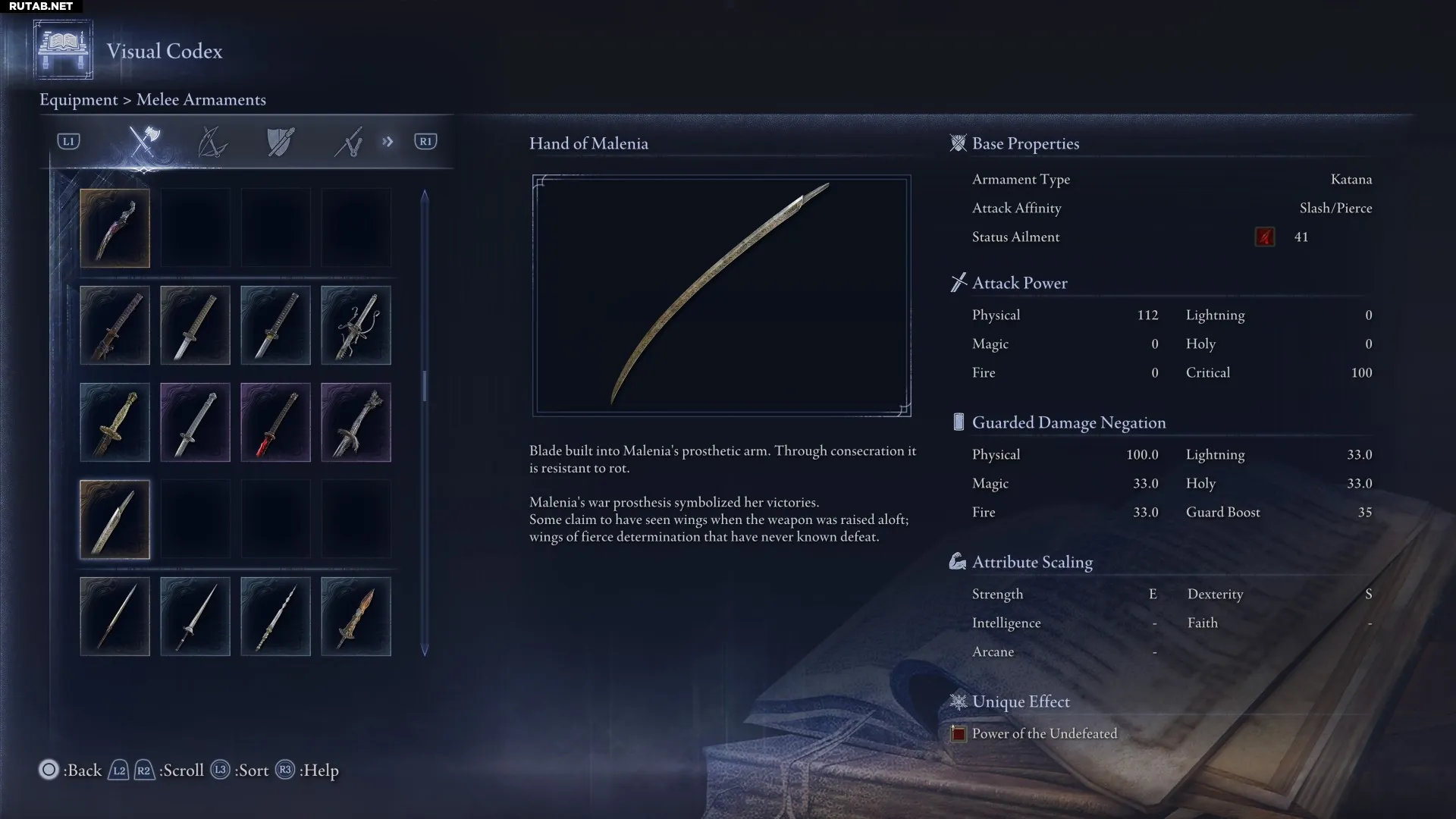 - Рука Малении (Легендарная катана): Легендарный клинок Малении обладает максимально возможным скейлингом от Ловкости и наносит мощный урон Кровотечением. Более того, он восстанавливает здоровье, если вы быстро нанесёте урон противнику после получения удара, в стиле Bloodborne.