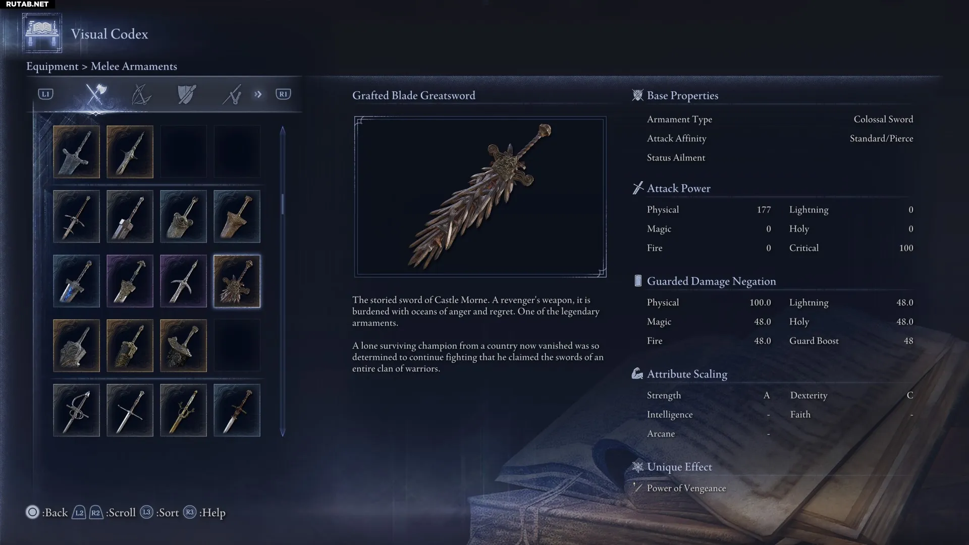 - Великий меч Привитого клинка (Легендарный колоссальный меч): Это гигантское оружие имеет скейлинг уровня A от Силы, что отлично подходит для Налётчика. Кроме того, оно обладает уникальным эффектом, который повышает все ваши характеристики при убийстве врага.