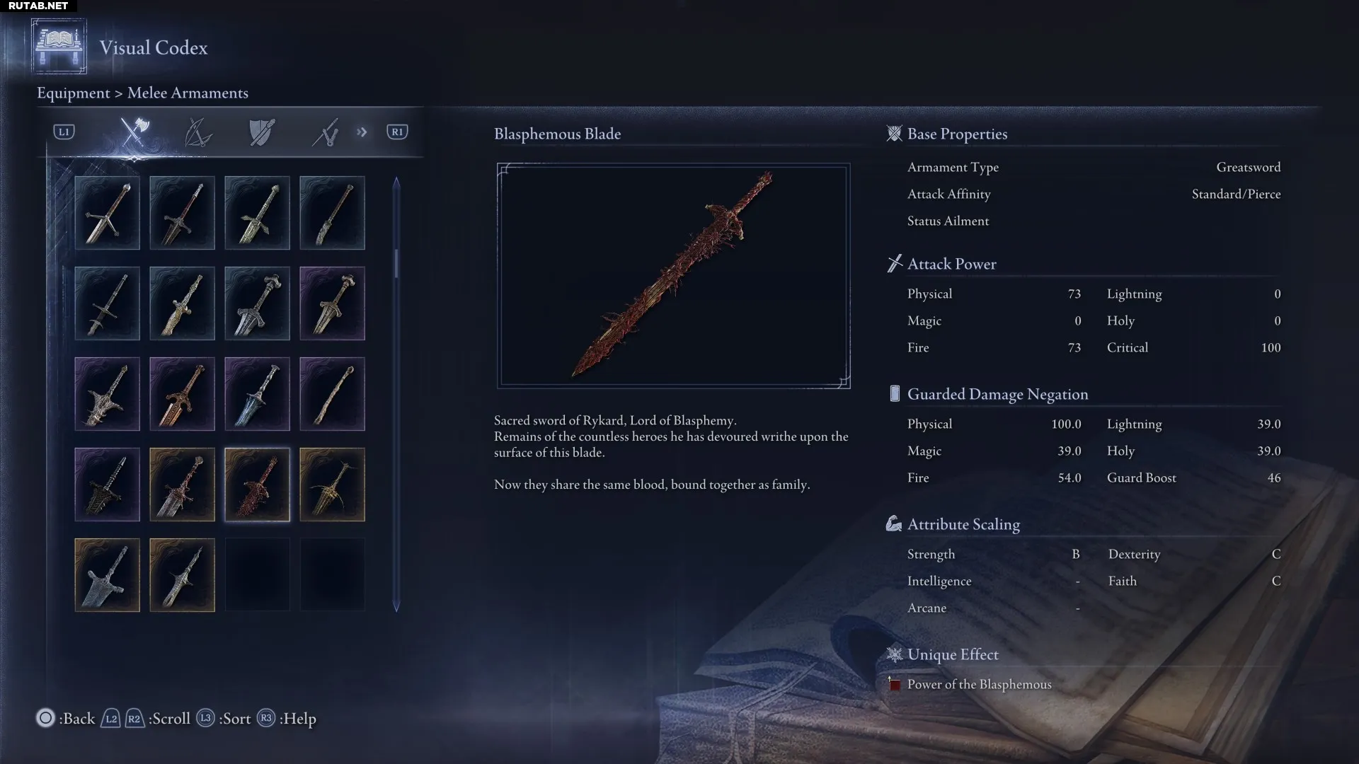 - Реки Крови (Эпическая катана): Снижение скейлинга от Ловкости до уровня A в обмен на повышенный скейлинг от Тайного знания для усиления эффектов Кровотечения также работает невероятно хорошо, вплоть до того, что это оружие можно считать таким же мощным, как и Рука Малении.