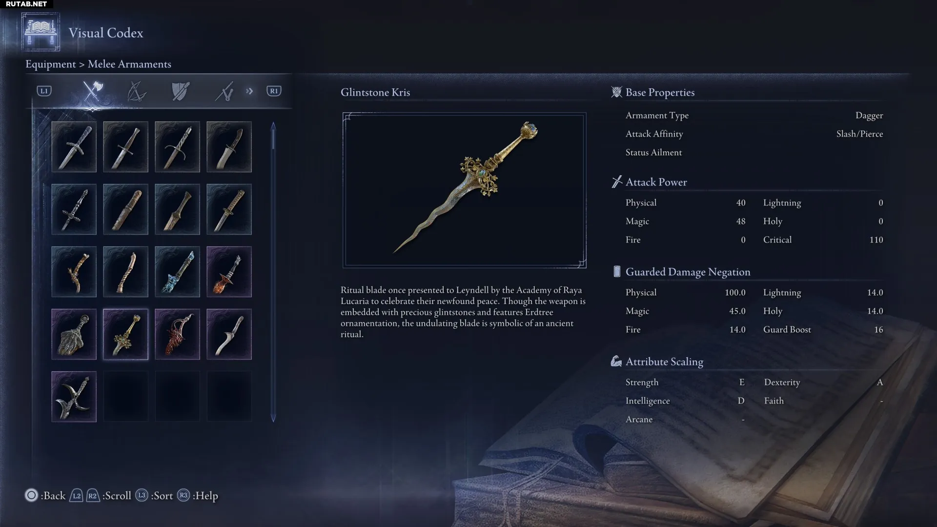 - Крис сияющего камня (Эпический кинжал): Этот быстрый кинжал имеет скейлинг от Интеллекта, добавляя к атакам магический урон, что позволяет легко расправляться с противниками.