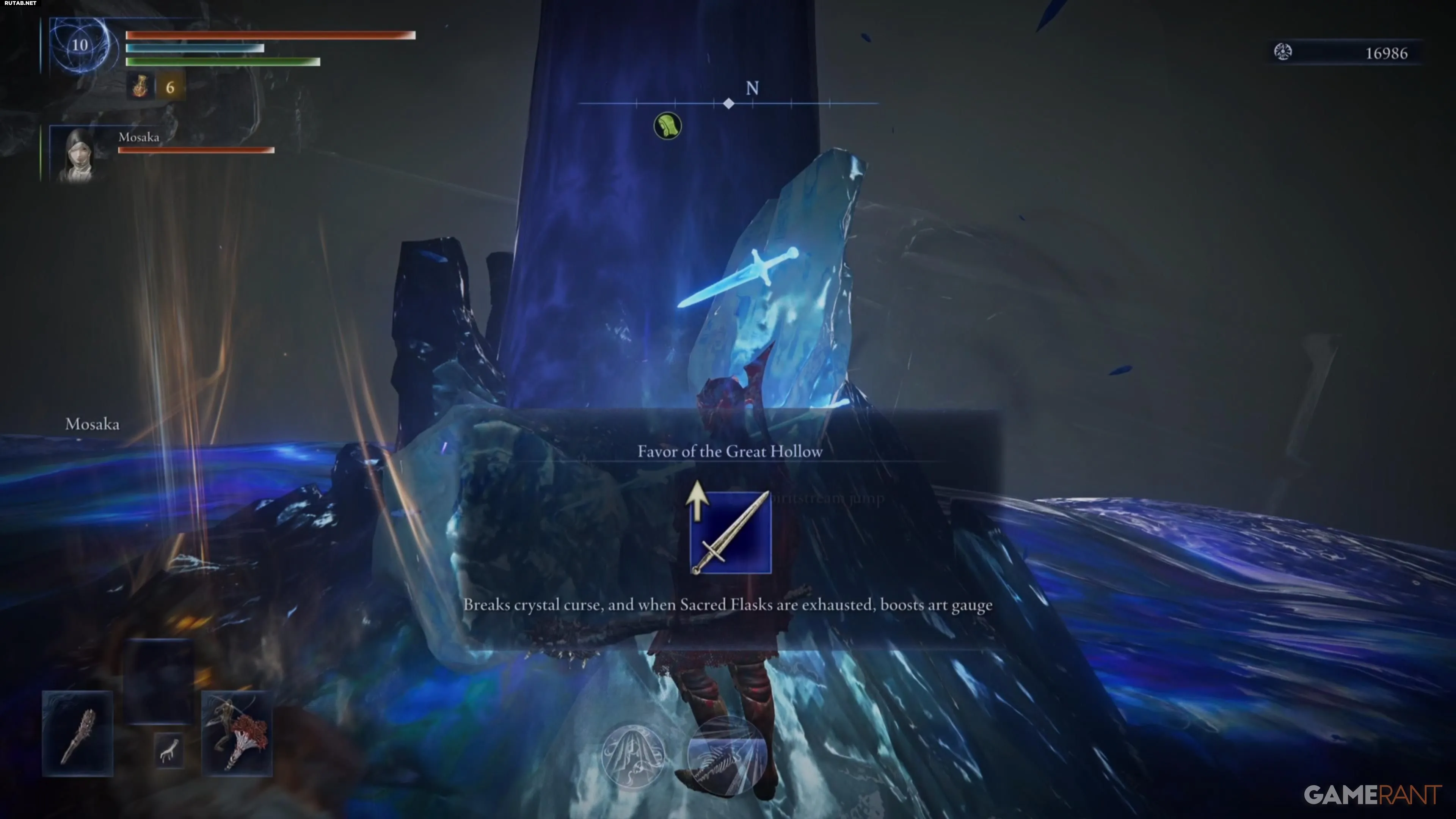 После резонанса с достаточным количеством кристаллов вы увидите, как Великий Кристалл полностью разрушается. Теперь можно двигаться к его локации, отмеченной на карте. Два кристаллических пути ведут к центру разрушенного кристалла, куда можно спрыгнуть и забрать Благоволение Великой Пустоты. Эта сила увеличивает шкалу Искусств, когда у вас заканчиваются Священные Фляги. Эффект сохраняется до конца экспедиции. Однако вторая часть силы связана с снятием кристального проклятия.