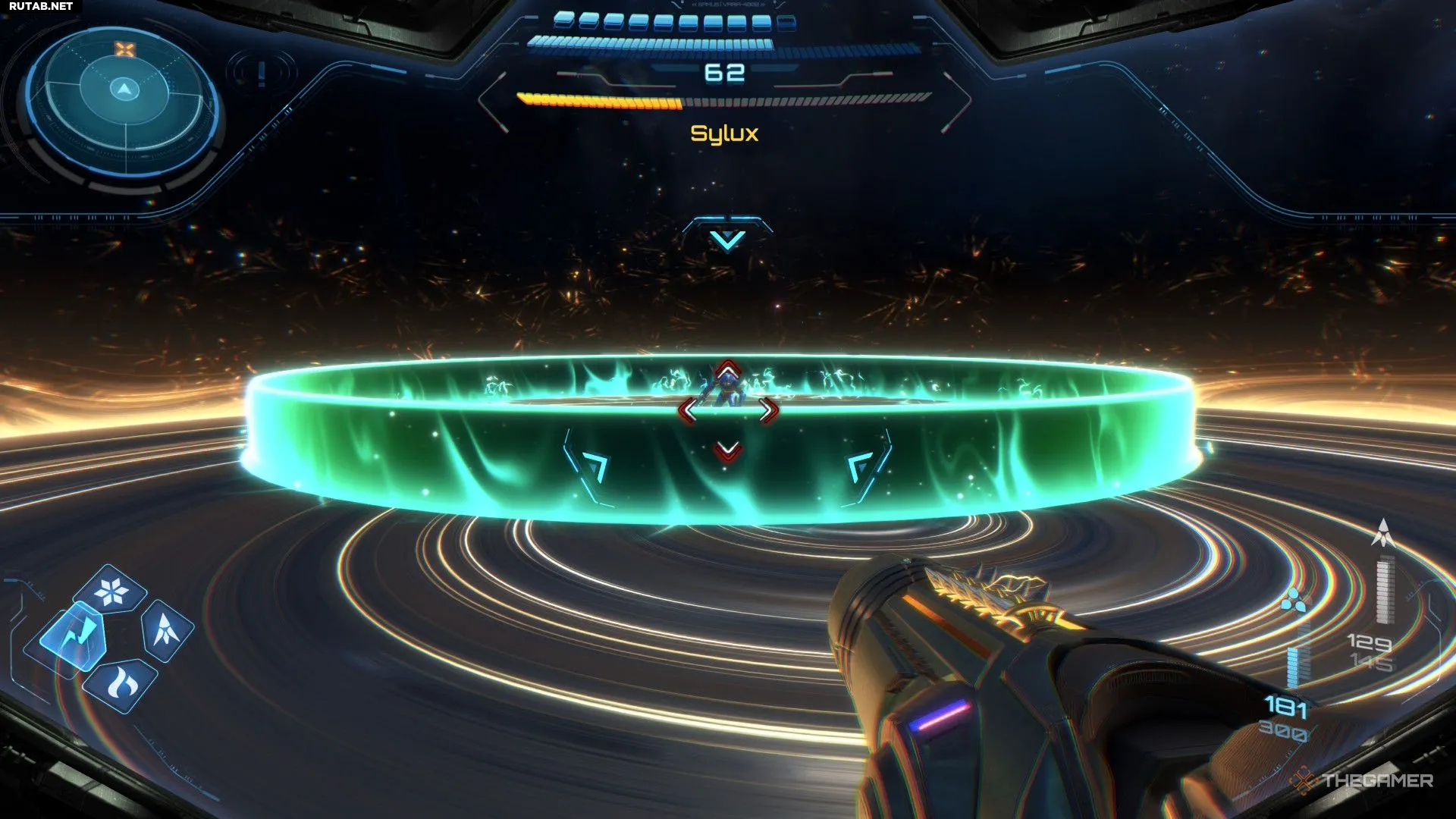 В конце концов, Сайлакс телепортируется из арены и вернётся с поднятой к небу пушкой. Если вы увидите, как над ним формируется энергия в форме глаза, переключитесь на визор и выстрелите в него заряженным Лучом управления. Это единственный приём, который не будет поглощён его атакой! Помните, что нужно направить выстрел в самого Сайлакса, а не в то место, где он формирует атаку.