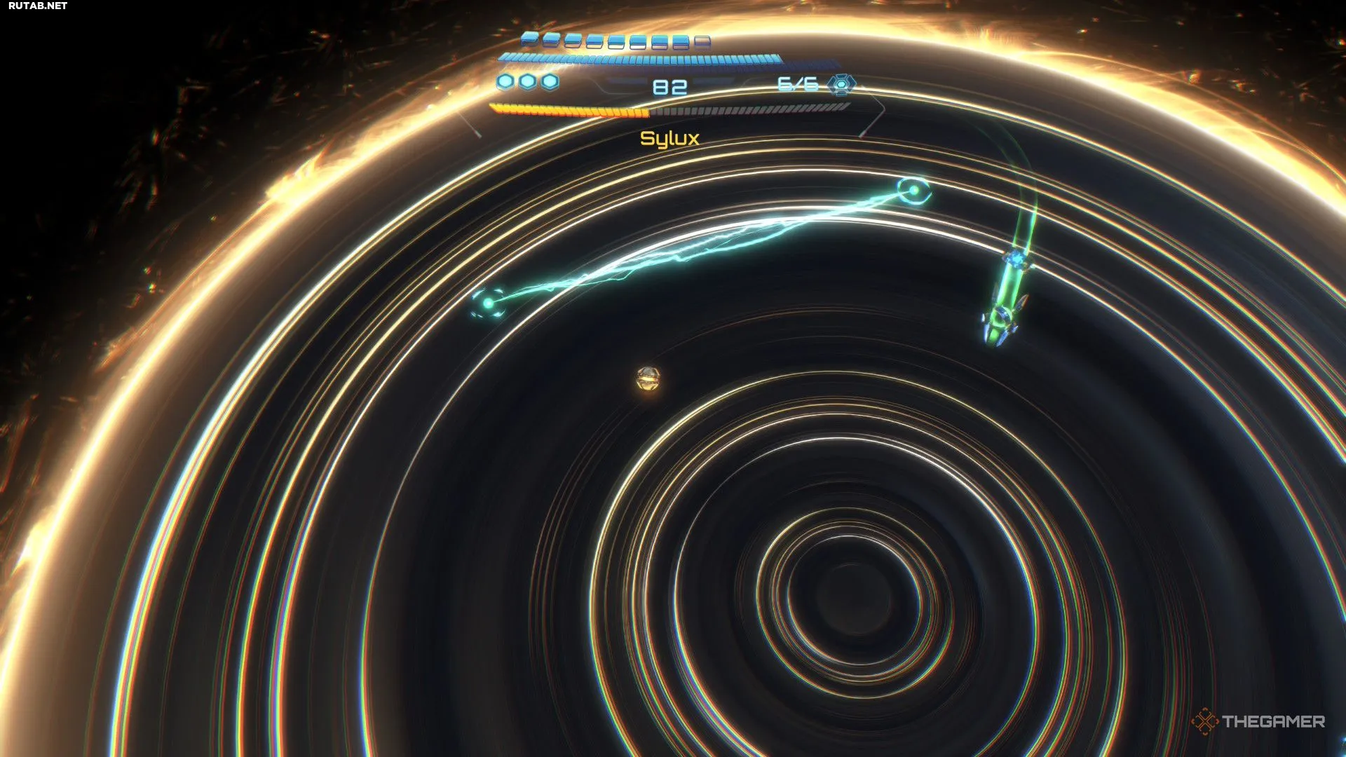 Единственная хитрость — это пара вращающихся лезвий в его арсенале, которых невозможно избежать обычным способом. Чтобы не получить урон, проведите луч управления через вращающиеся лезвия и попадите им в спину Сайлакса, чтобы оглушить его и прервать эту атаку!