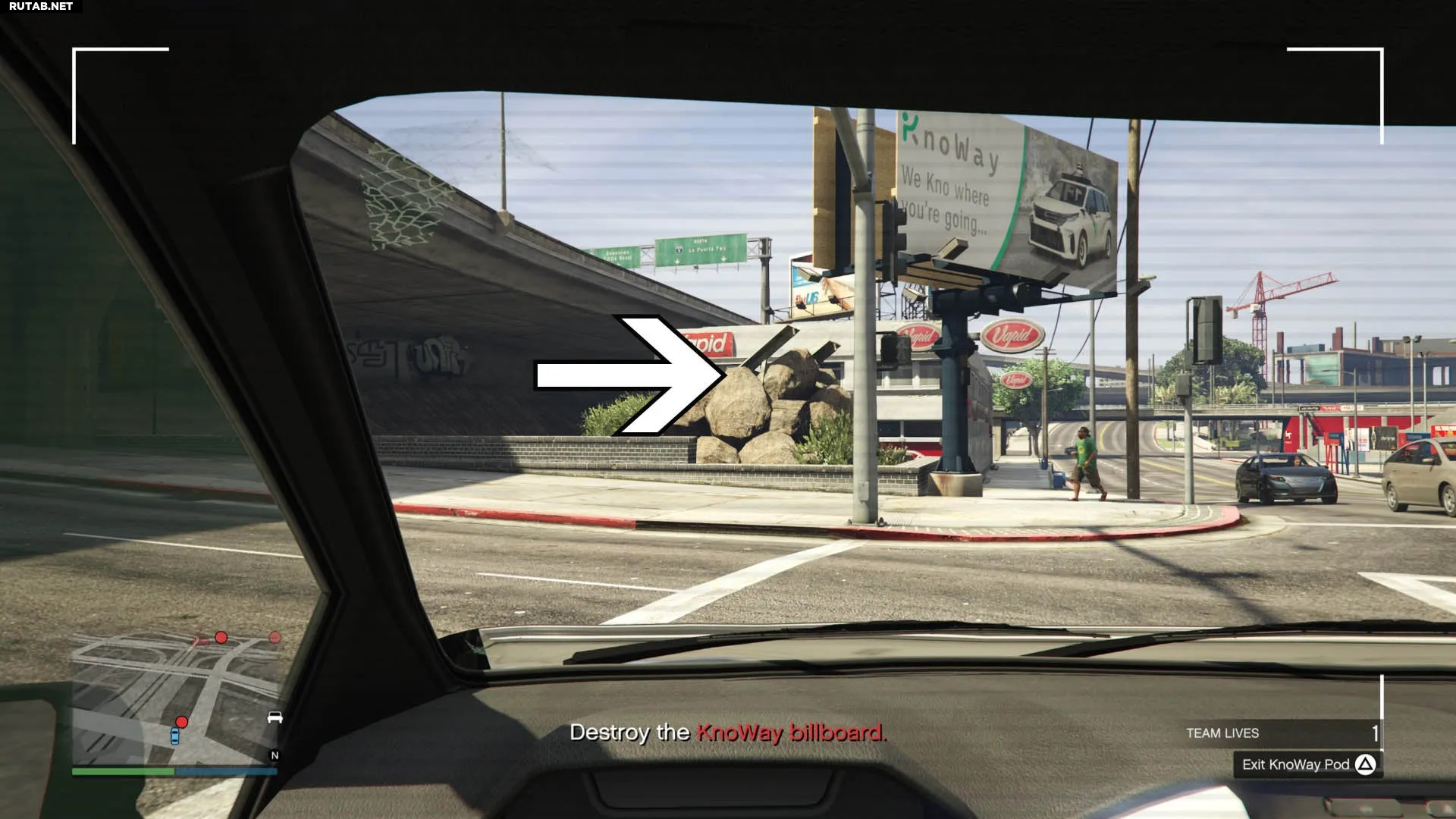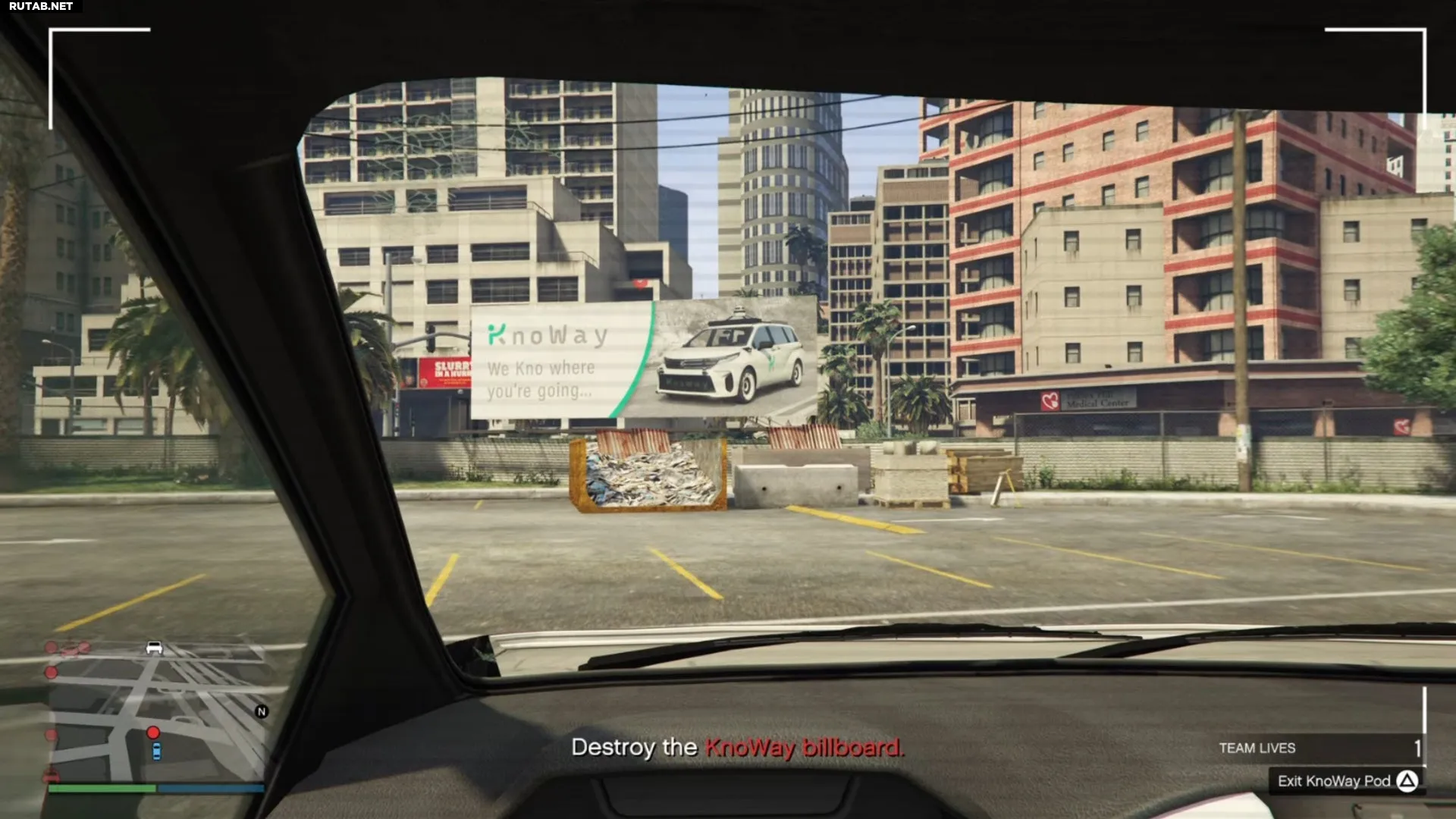 В миссии «Негативная реклама» нужно уничтожить пять билбордов KnoWay. Для каждого из них необходимо найти трамплин, разогнаться и протаранить щит на такси. Билборды можно уничтожать в любом порядке. На карте они отмечены красными точками, а такси — иконками таксомоторов.