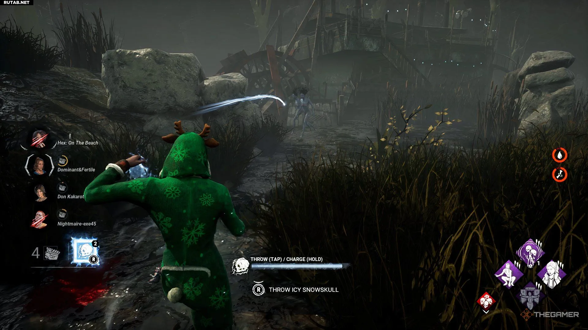 - Собирать Снежные черепа, чтобы бросать их в выживших или разбивать стоящих снеговиков. Бросок Снежного черепа в выжившего, спрятавшегося в снеговике, замедлит его.