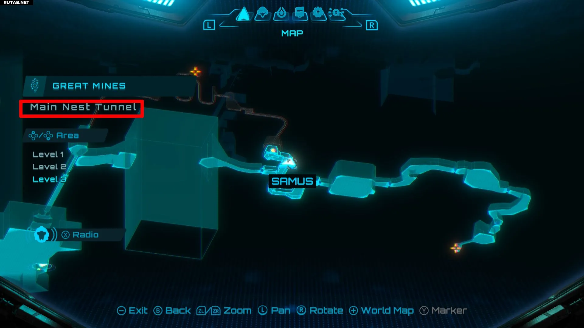 Имея на вооружении Пси-супербомбу, отправляйтесь на 2-й уровень шахт и используйте шахтный ствол, чтобы спуститься на 3-й уровень. Продолжайте движение вперёд, пока не достигнете Главного гнездового тоннеля, и используйте супербомбу, чтобы разрушить стену из гибардаумной руды, преграждающую путь. Следуйте по открывшемуся пути и используйте огненный выстрел, чтобы сжечь паутину и открыть тоннель для формы шара. Внутри находится большая полутруба. Игроки могут использовать комбинацию ускорения в форме шара и узлов для крюка, чтобы добраться до вершины, где с помощью двойного прыжка с бомбой можно забрать контейнер с энергией.