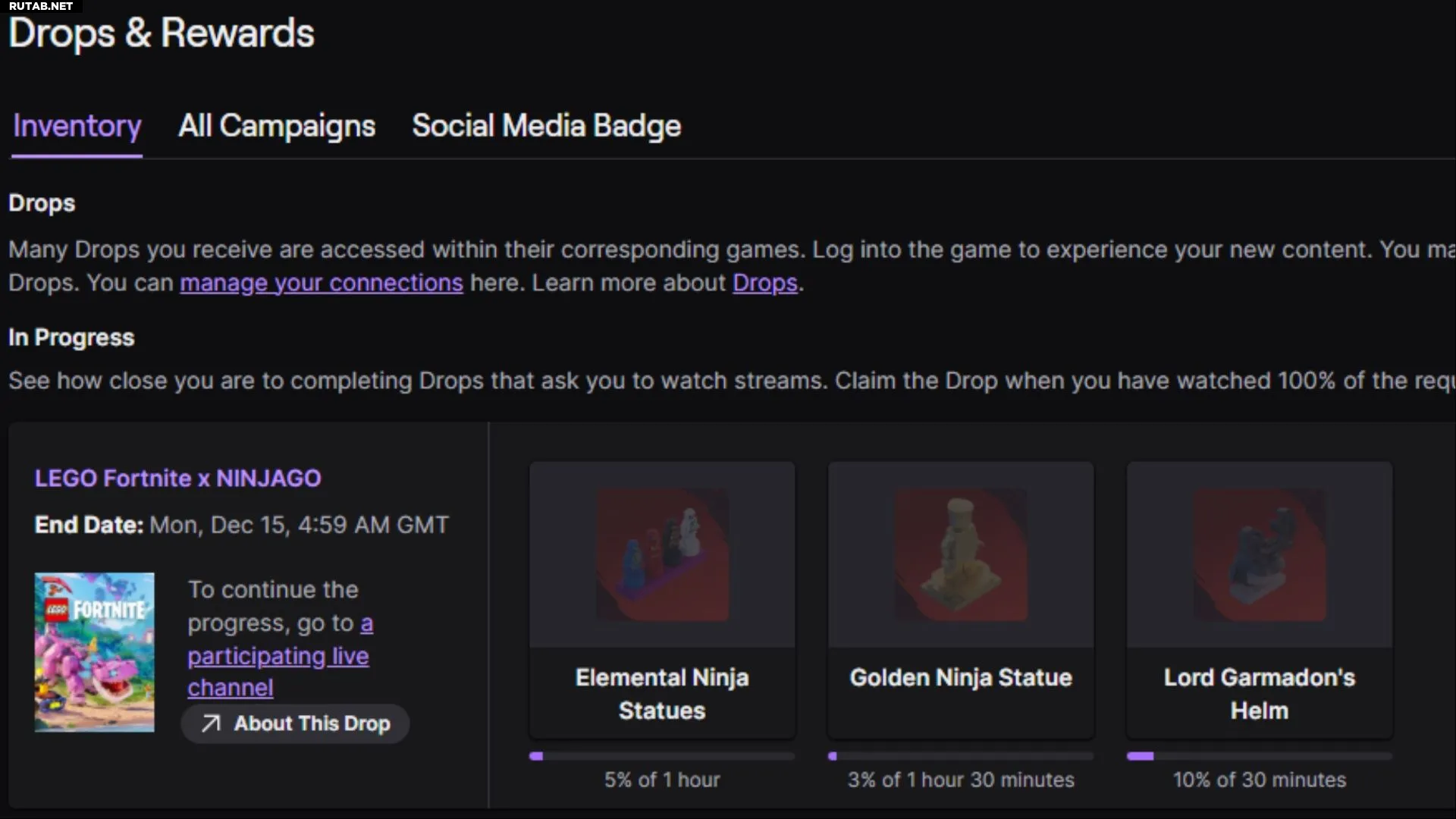 Игроки могут разблокировать до трёх предметов NINJAGO в Fortnite, просто просматривая стримы с включёнными дропами в категории LEGO Fortnite: Odyssey. Предметы будут выдаваться каждые 30 минут, проведённые на стриме. Вот список наград: