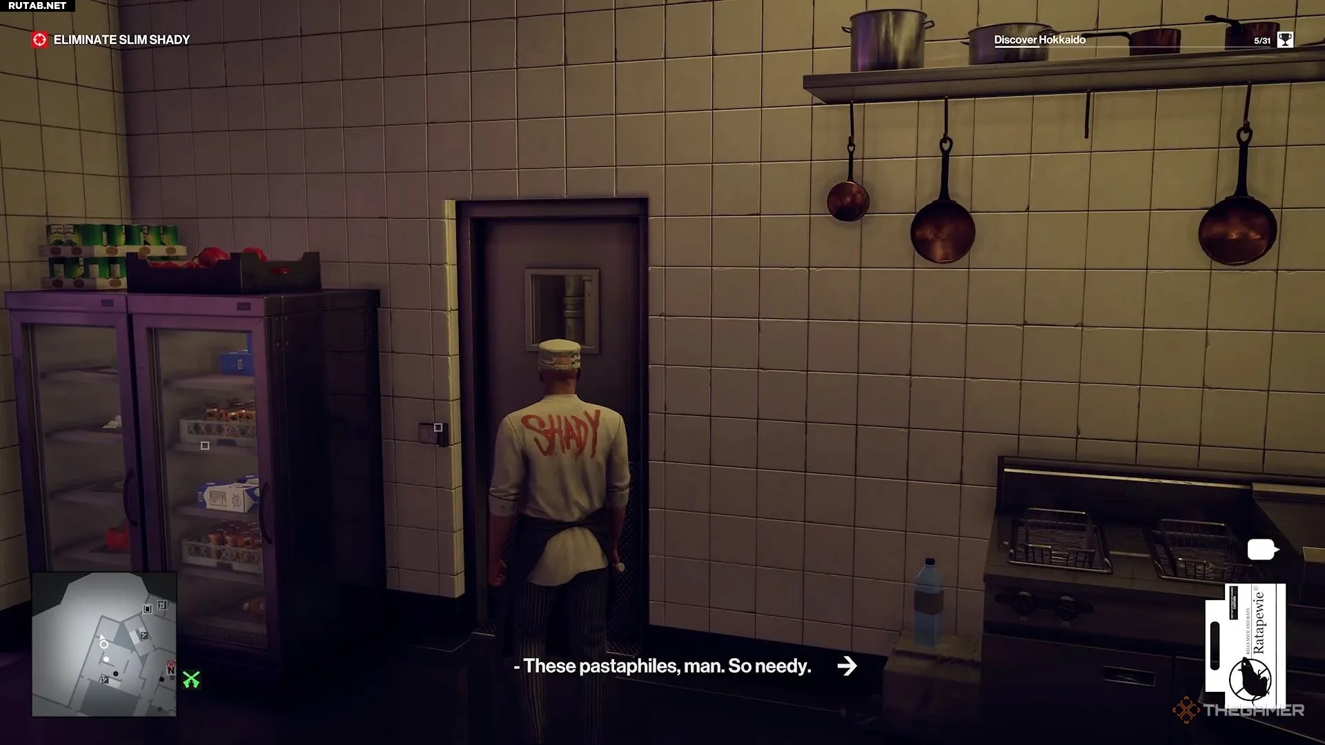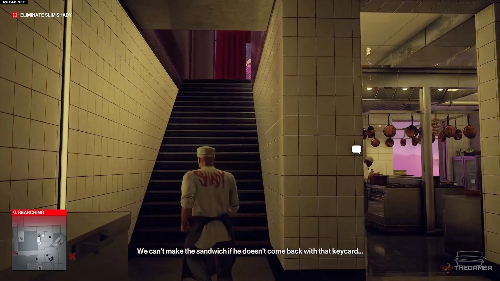 Надев костюм повара, направляйтесь на кухню. Чтобы попасть туда, не возвращайтесь наверх — там стоит охранник, который видит насквозь вашу маскировку. Вместо этого выйдите из лестничного пролёта через дверь рядом с ванной комнатой.