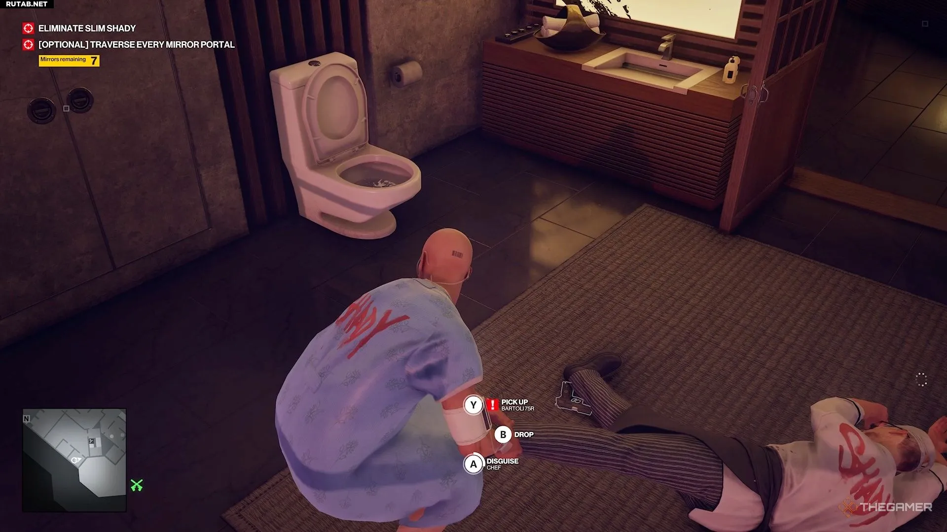 Если вы нейтрализуете охранника в основном помещении ванной, не забудьте убрать выпавший пистолет. Его можно выбросить в мусорную корзину, которая находится в одной из кабинок.