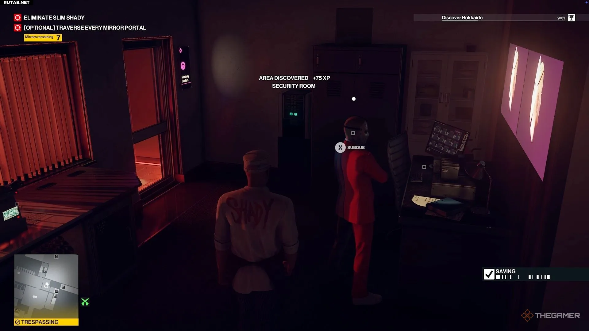 Теперь вы будете находиться на запретной территории, но это не проблема. Продолжайте идти вперёд и поднимитесь по лестнице, чтобы попасть в комнату охраны. Устраните человека внутри и заберите его одежду. Теперь у вас есть маскировка телохранителя.