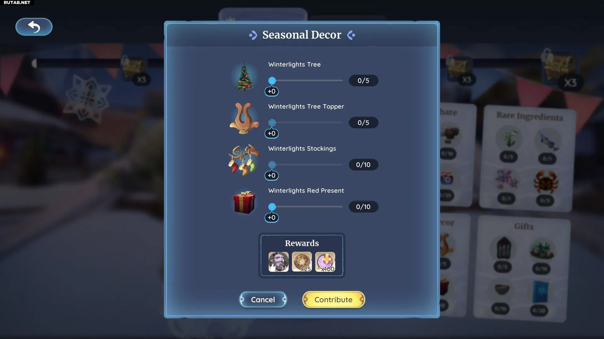 | Верхушка для зимнего деревца | 5 | Сначала нужно выполнить зимнее испытание Зеки и найти все семь спрятанных сундуков. После этого рецепт можно купить в праздничном магазине за 150 золотых. Для изготовления нужны: 10 древесины сока, 5 растительных волокон и 1 лотос Хрустального озера. |
