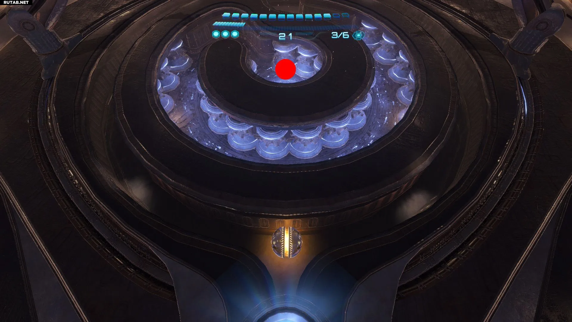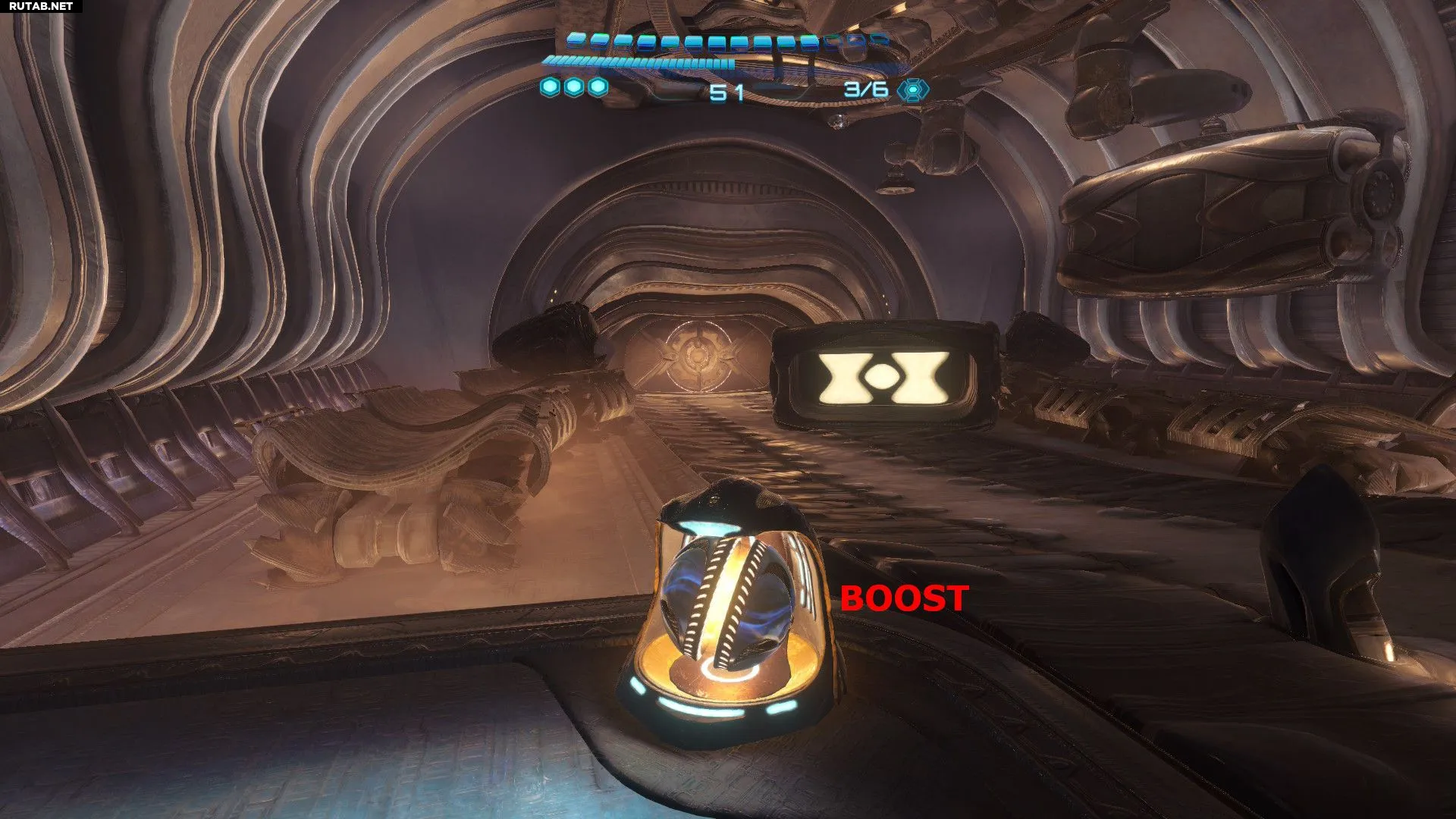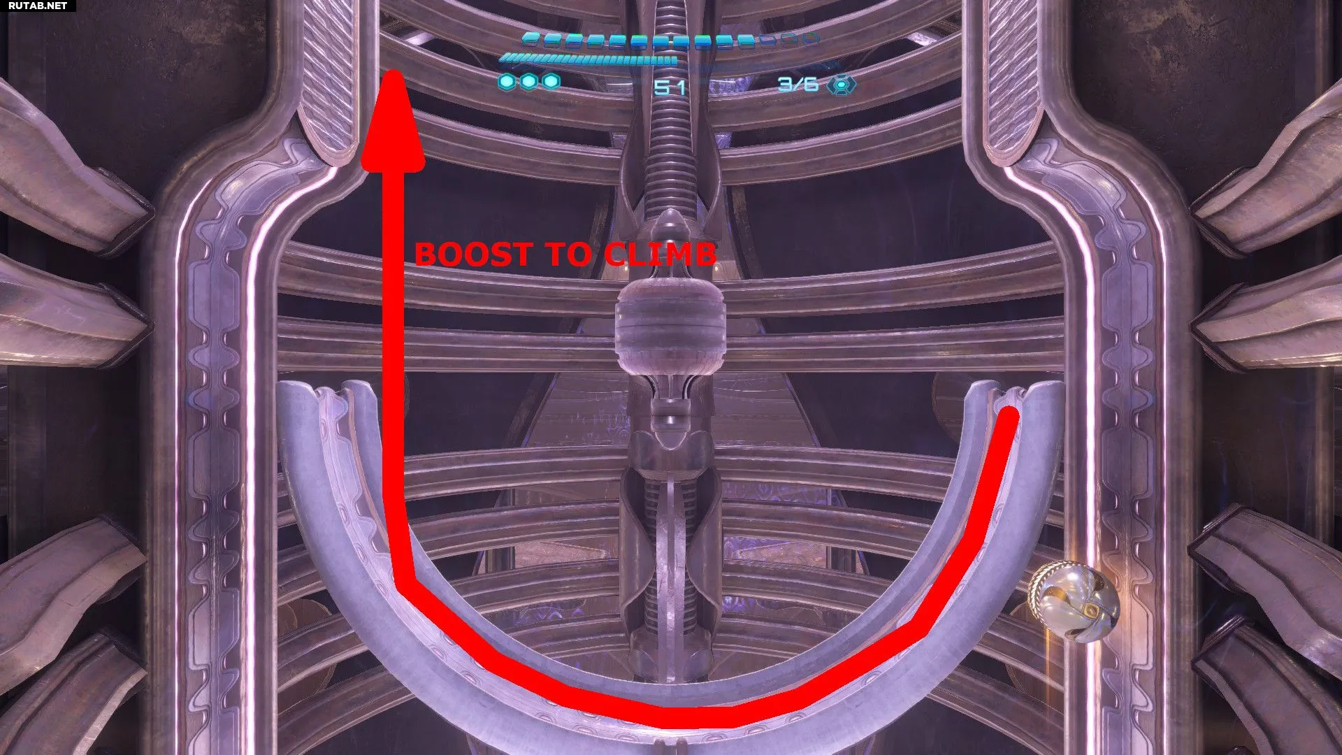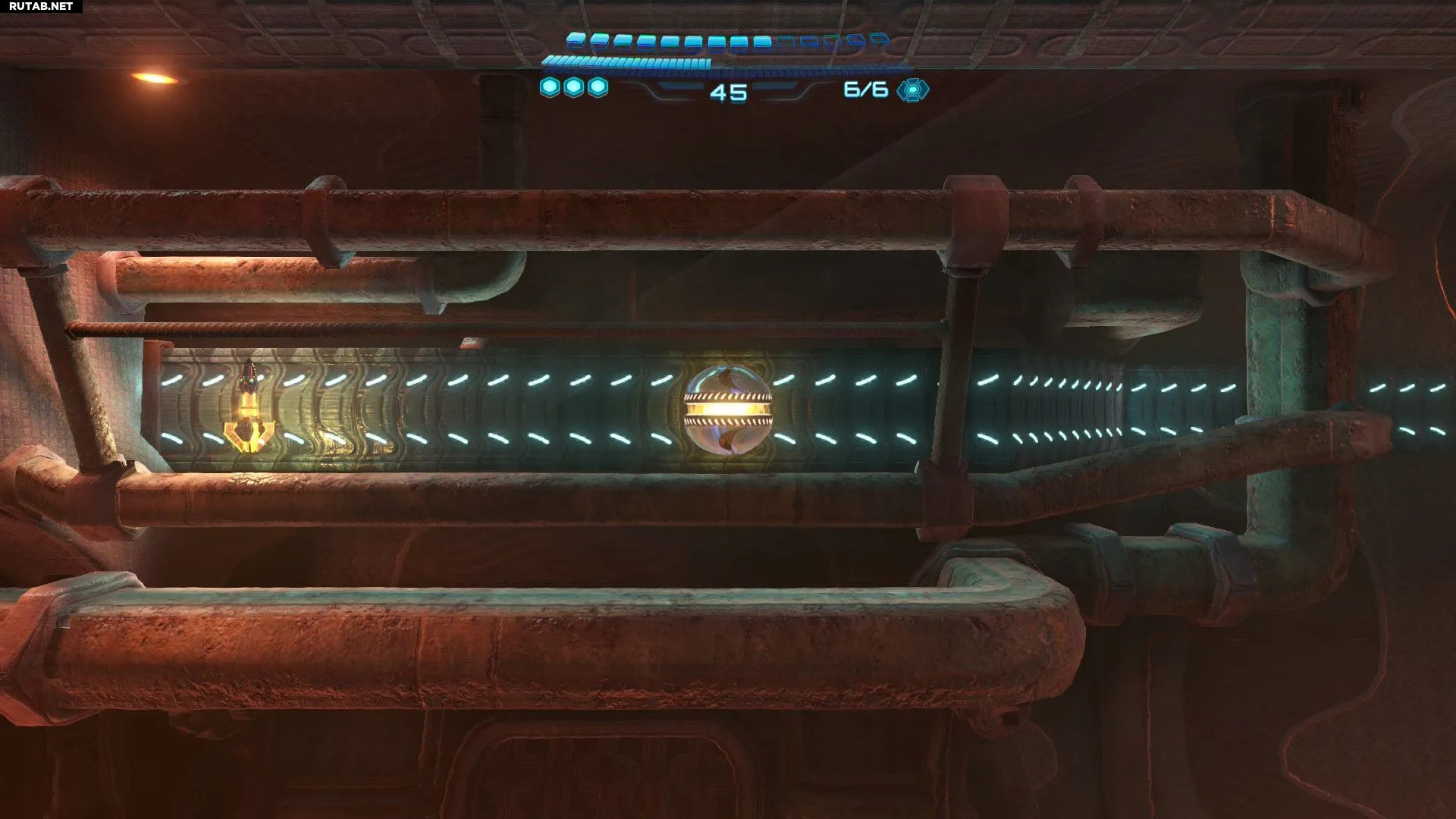 После разблокировки ускоренного шара используйте Морф-шар, чтобы попасть в основание конструкции в центре комнаты. Затем примените ускоренный шар в хафпайпах, чтобы подняться по конструкции и добраться до расширения для ракет наверху.