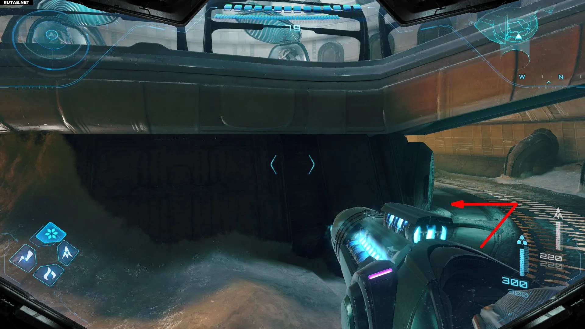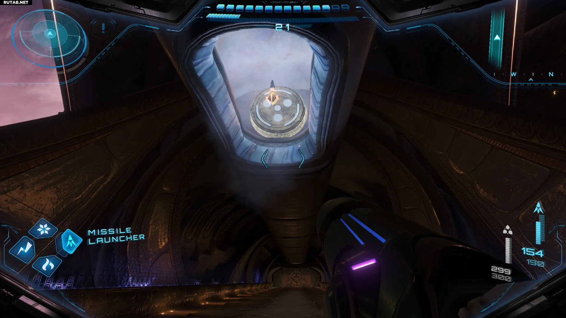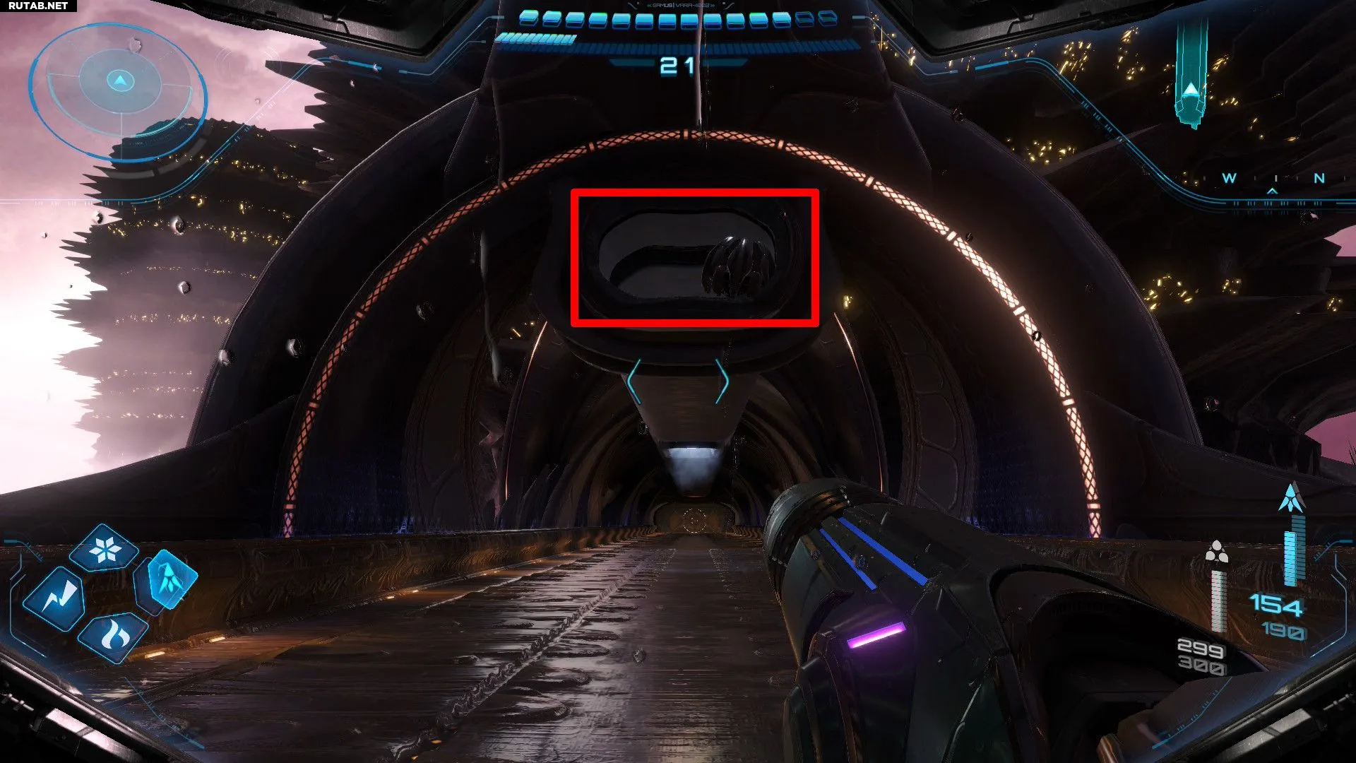 В этом коридоре находится приподнятый туннель. Запустите в него луч управления и поразите цель в конце, чтобы открыть расширение для ракет. Соберите его, совершив двойной прыжок в образовавшееся отверстие.