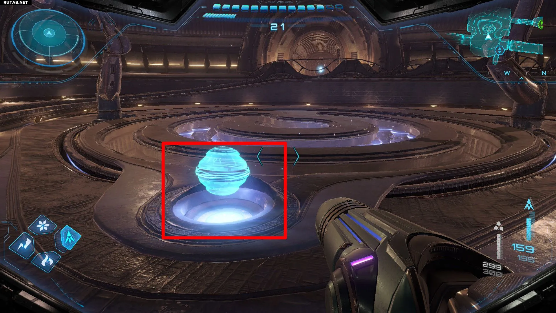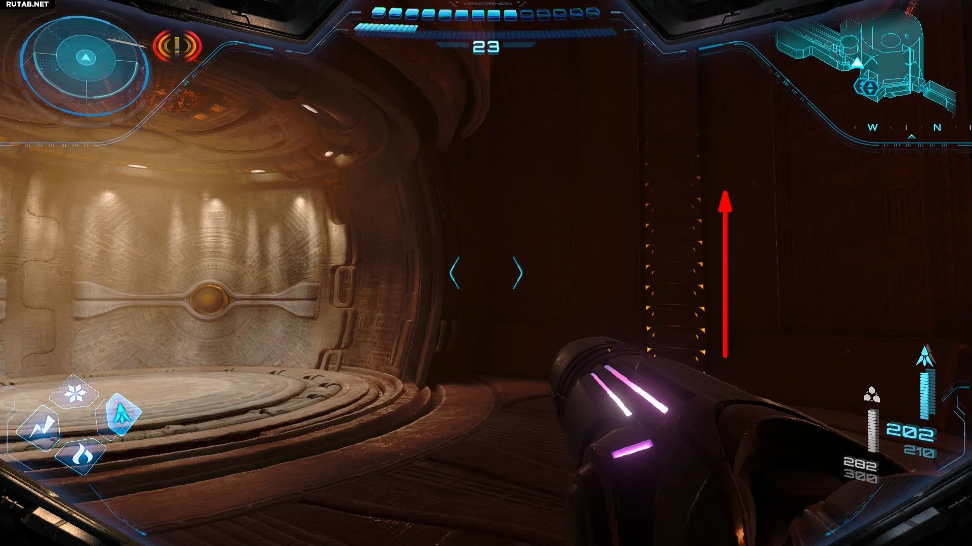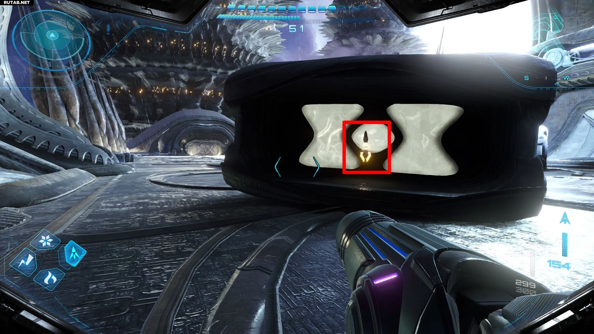 В этом коридоре находится приподнятый туннель. Запустите в него луч управления и поразите цель в конце, чтобы открыть расширение для ракет. Соберите его, совершив двойной прыжок в образовавшееся отверстие.
