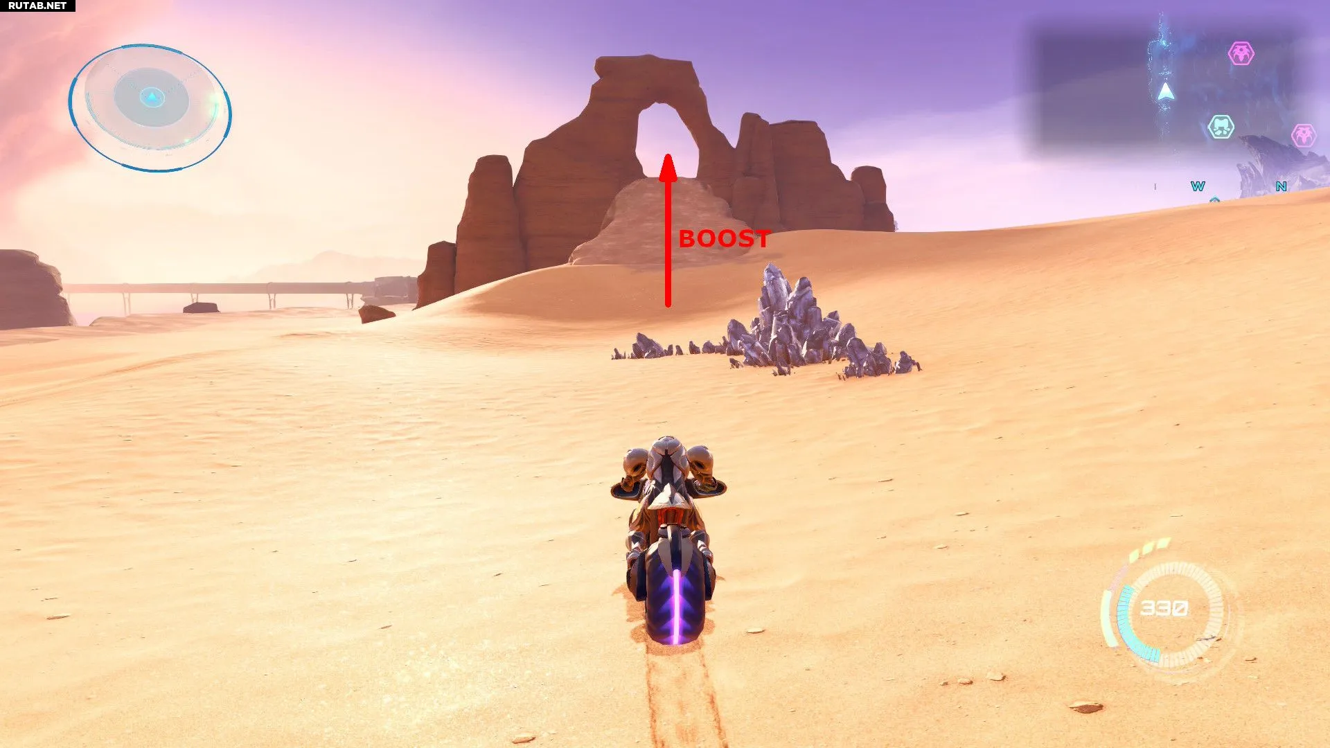 Разгонитесь на пандусе, чтобы врезаться в расширение для ракет, парящее в проёме высокой скальной формации.