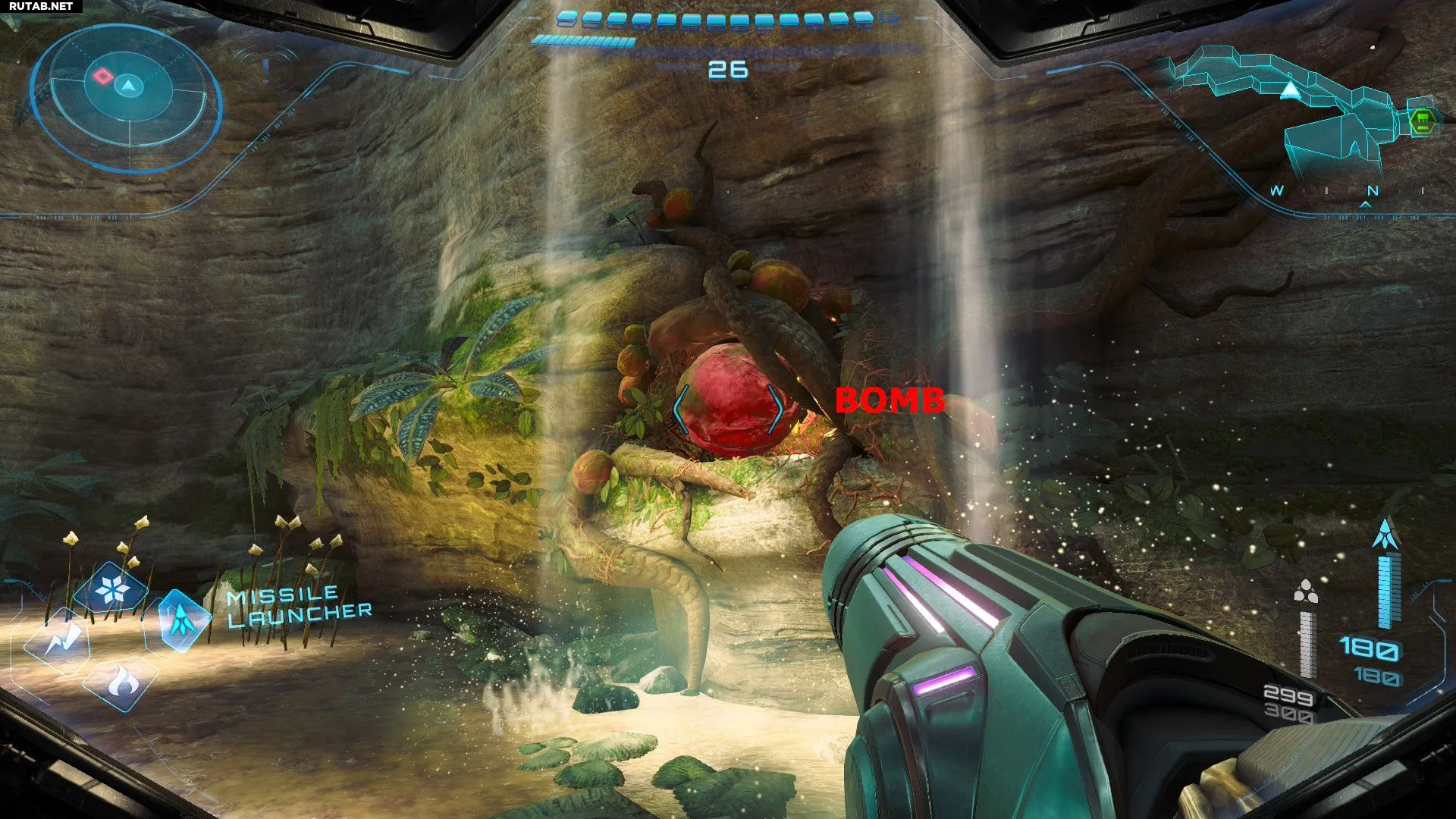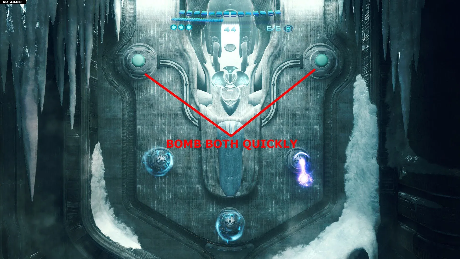 После получения Паучьего шара доберитесь до нижнего левого угла секции для Морф-шара. Используйте пси-привязи, чтобы запустить Сэмус к двум красным огням. Быстро установите бомбы рядом с обоими огнями, чтобы деактивировать их и освободить расширение для ракет.