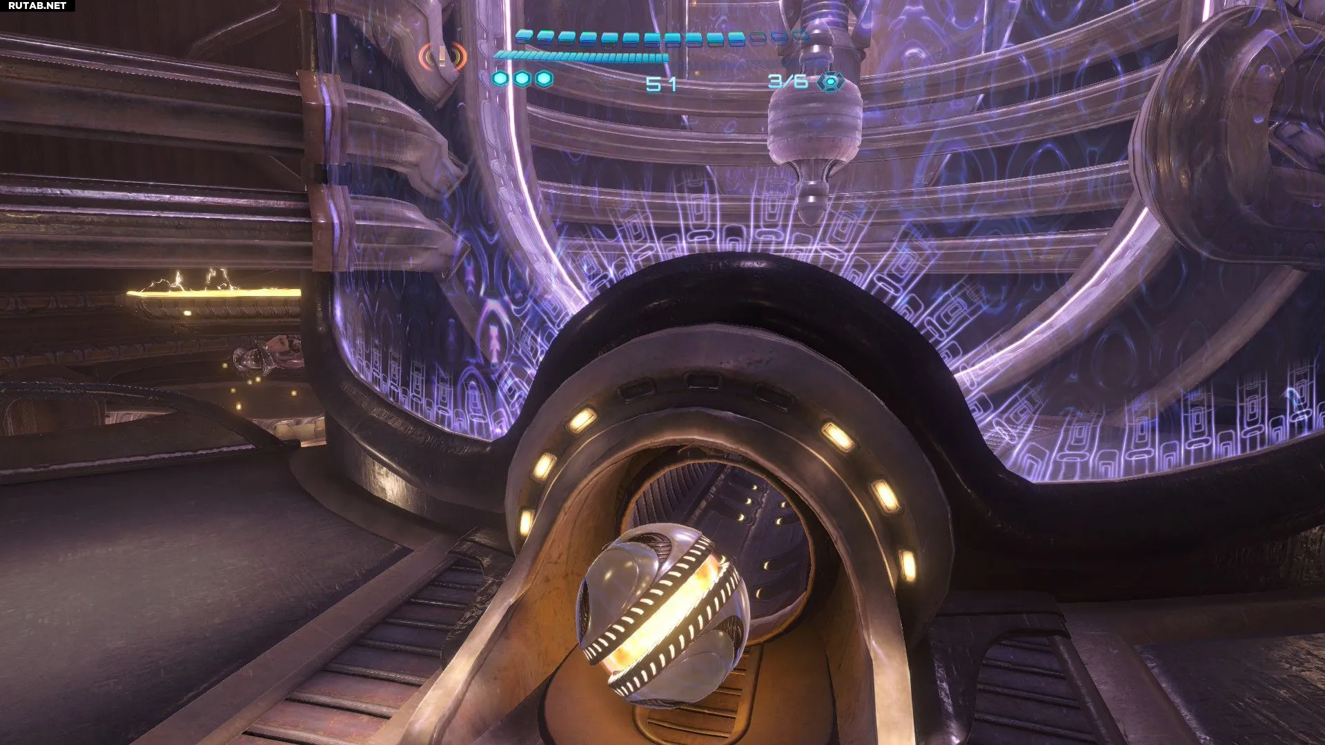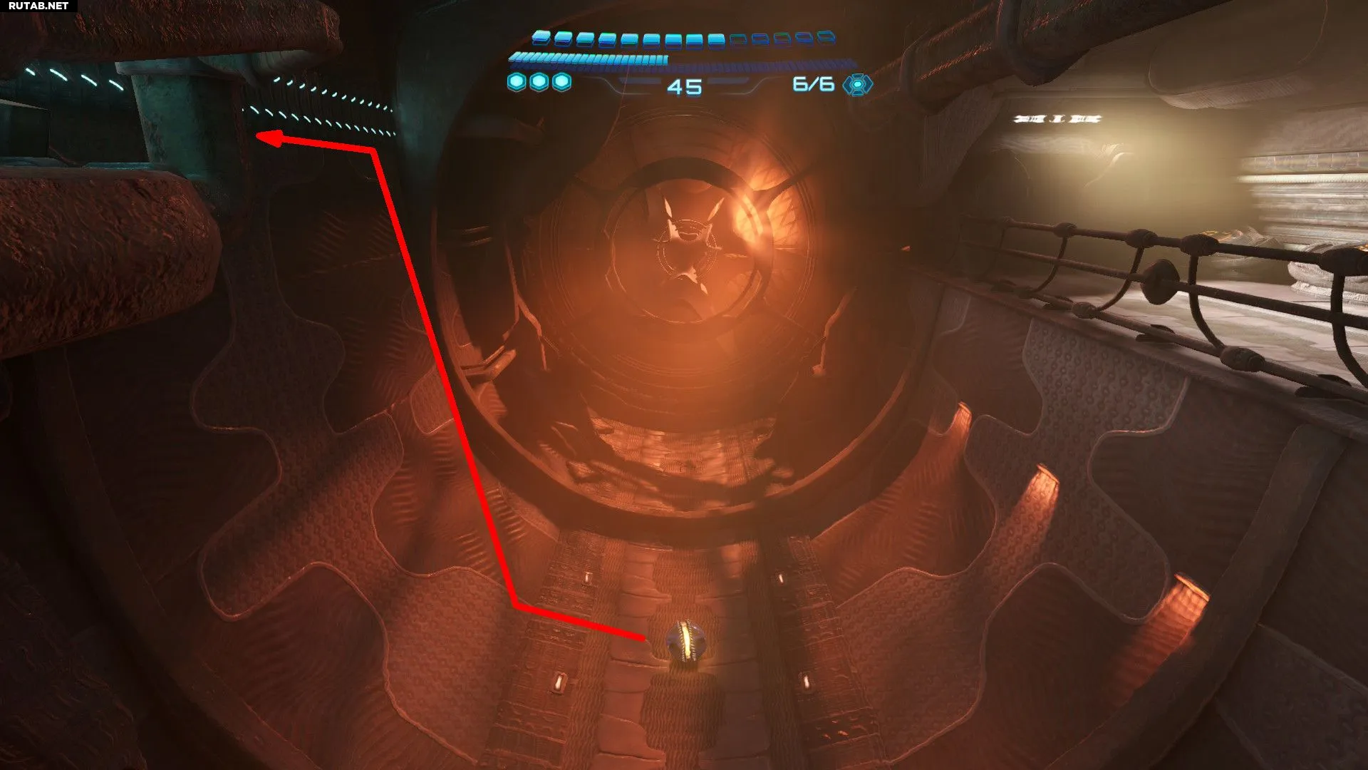 Войдите в паз для Морф-шара у основания платформы в центре этой зоны. Используйте рельсы Паучьего шара слева, чтобы добраться до расширения для ракет. Для его получения потребуется двойной бомбовый прыжок.